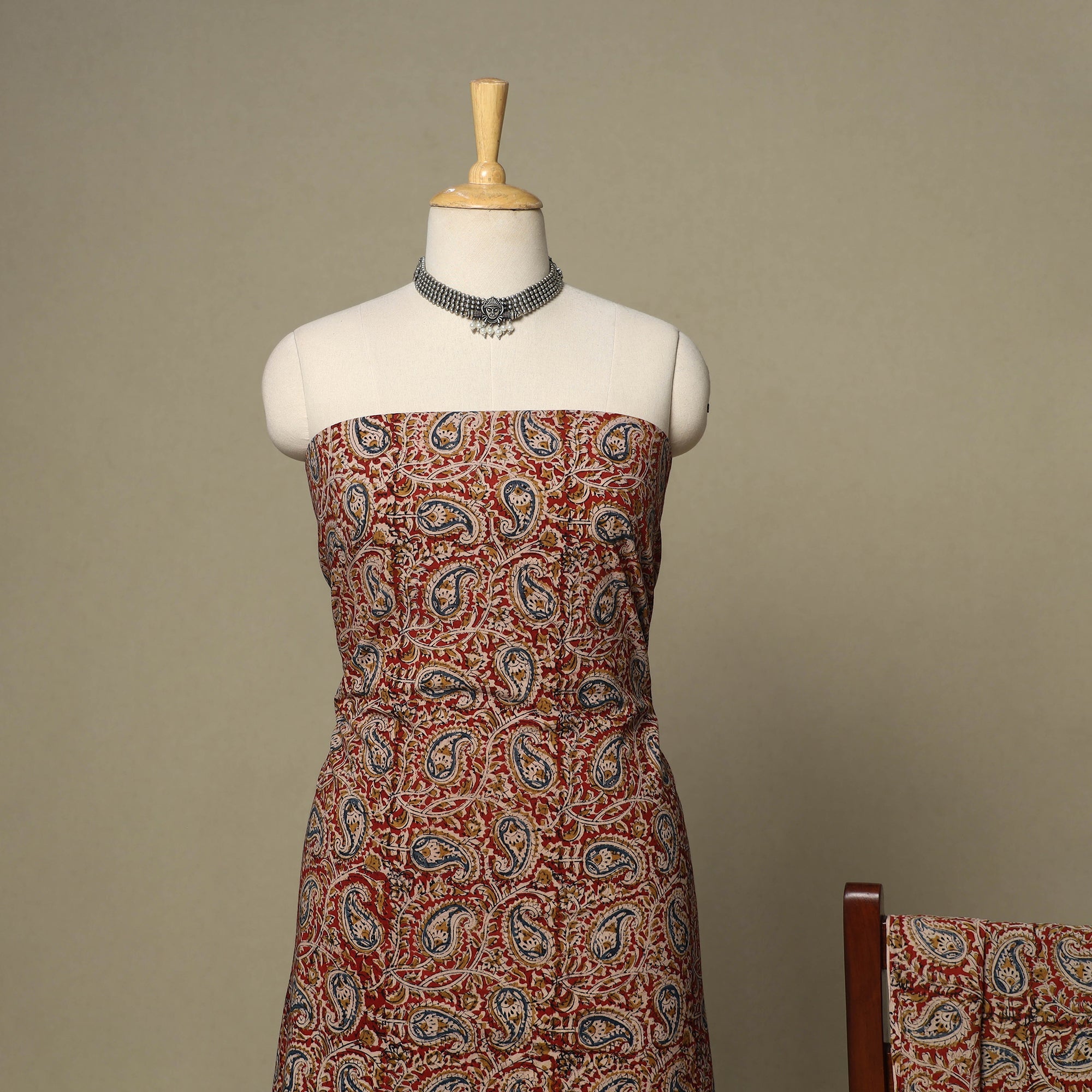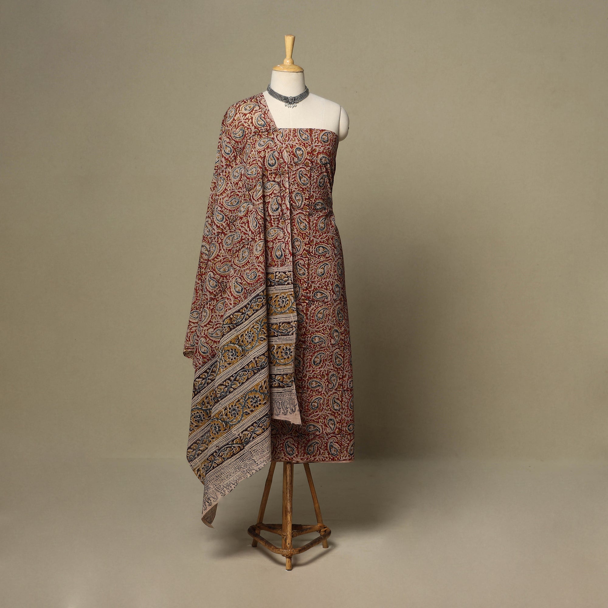 This red pedana kalamkari 2pc cotton dress material set reflects the timeless beauty of Indian textiles. Made using intricately carved wooden blocks and natural dyes, it showcases a beautifully printed kurta fabric with a coordinated dupatta. The breathable cotton ensures comfort throughout the day, making it an ideal choice for both everyday wear and special occasions.