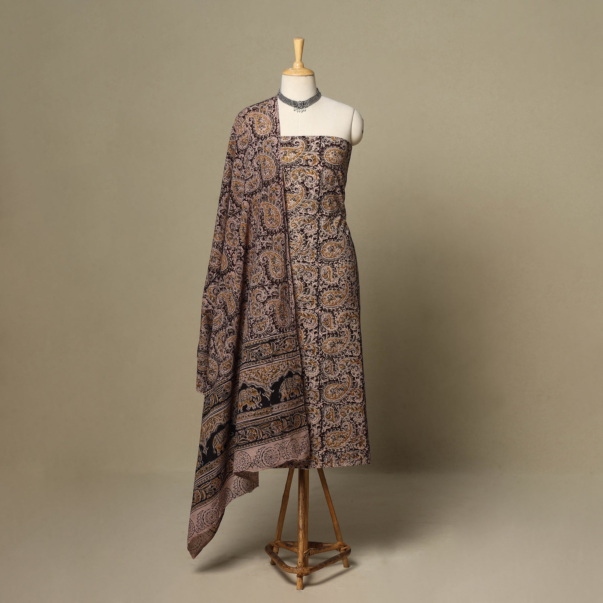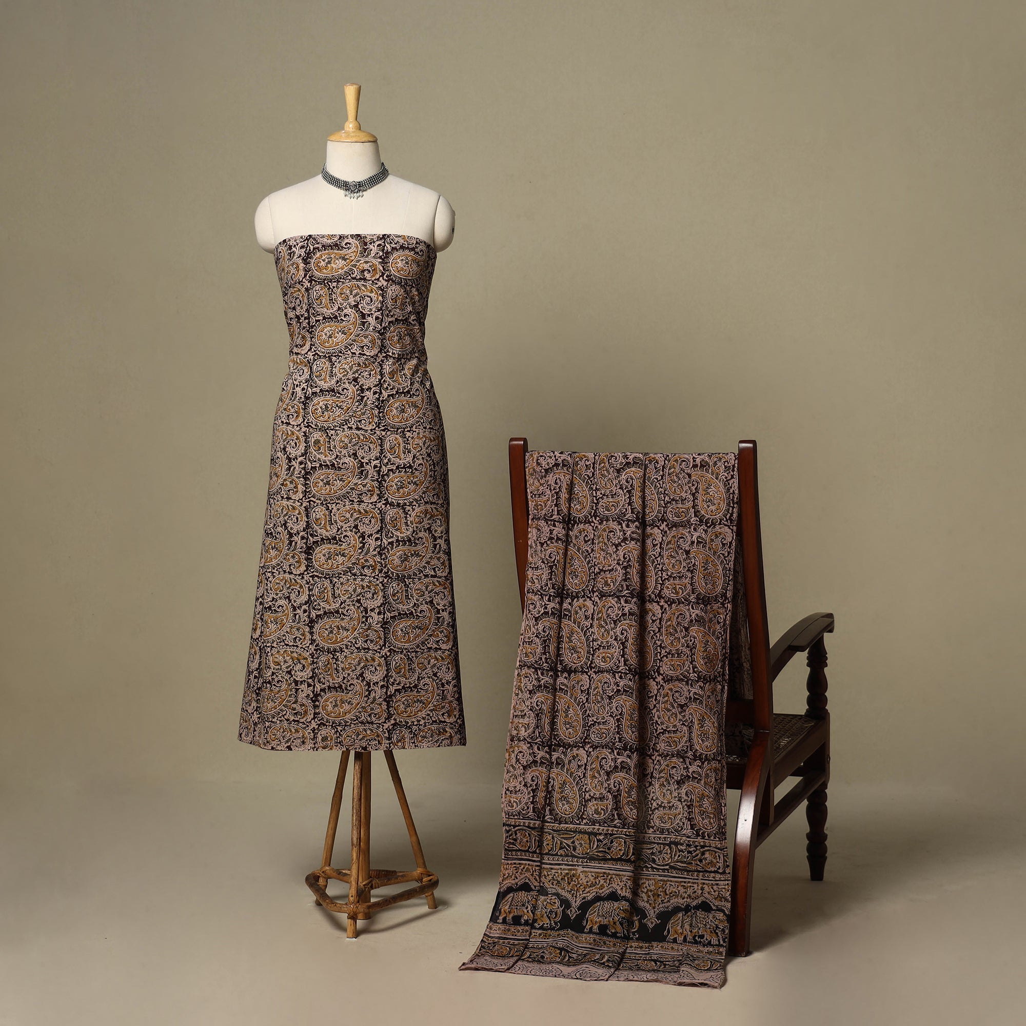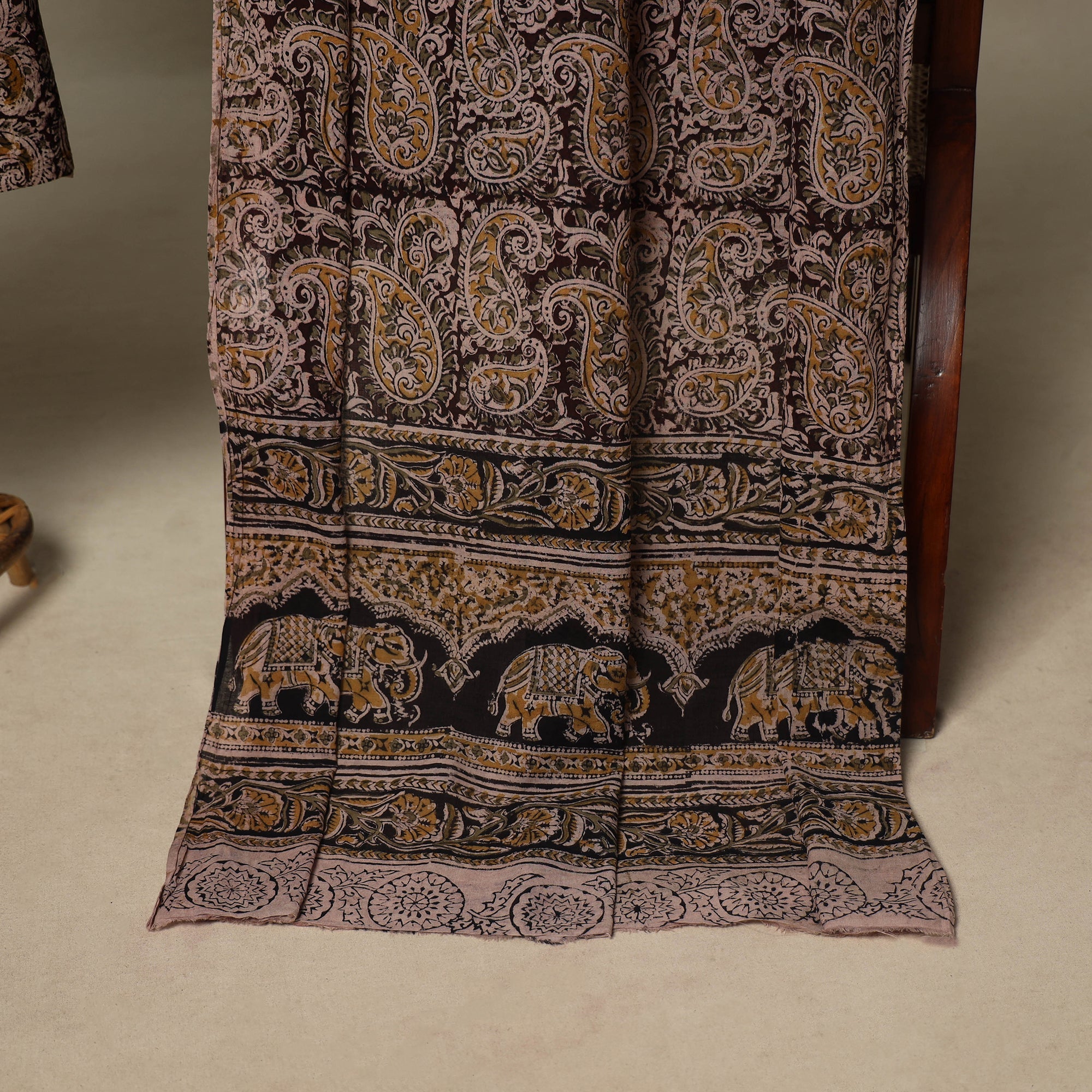 This black pedana kalamkari 2pc cotton dress material set reflects the timeless beauty of Indian textiles. Made using intricately carved wooden blocks and natural dyes, it showcases a beautifully printed kurta fabric with a coordinated dupatta. The breathable cotton ensures comfort throughout the day, making it an ideal choice for both everyday wear and special occasions.