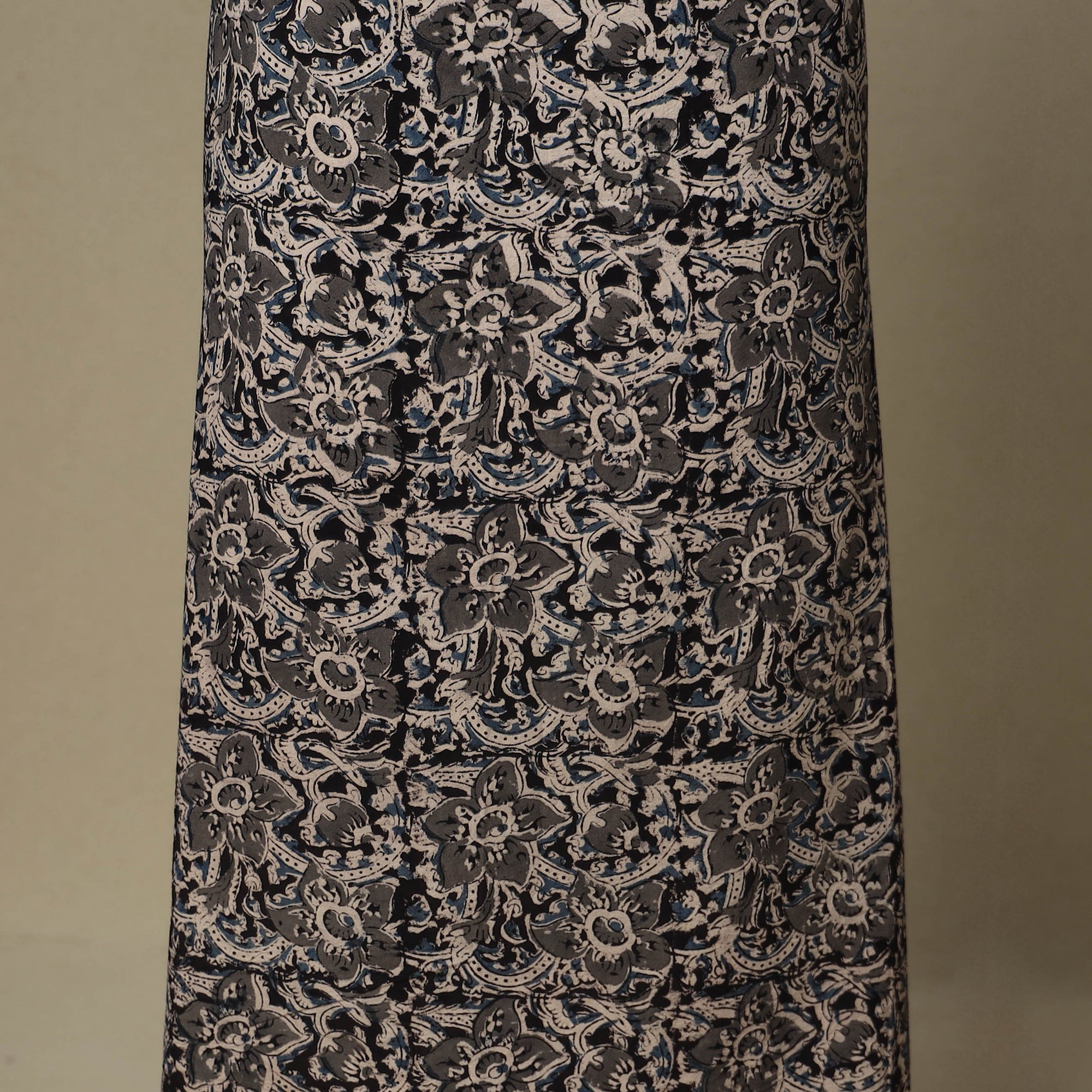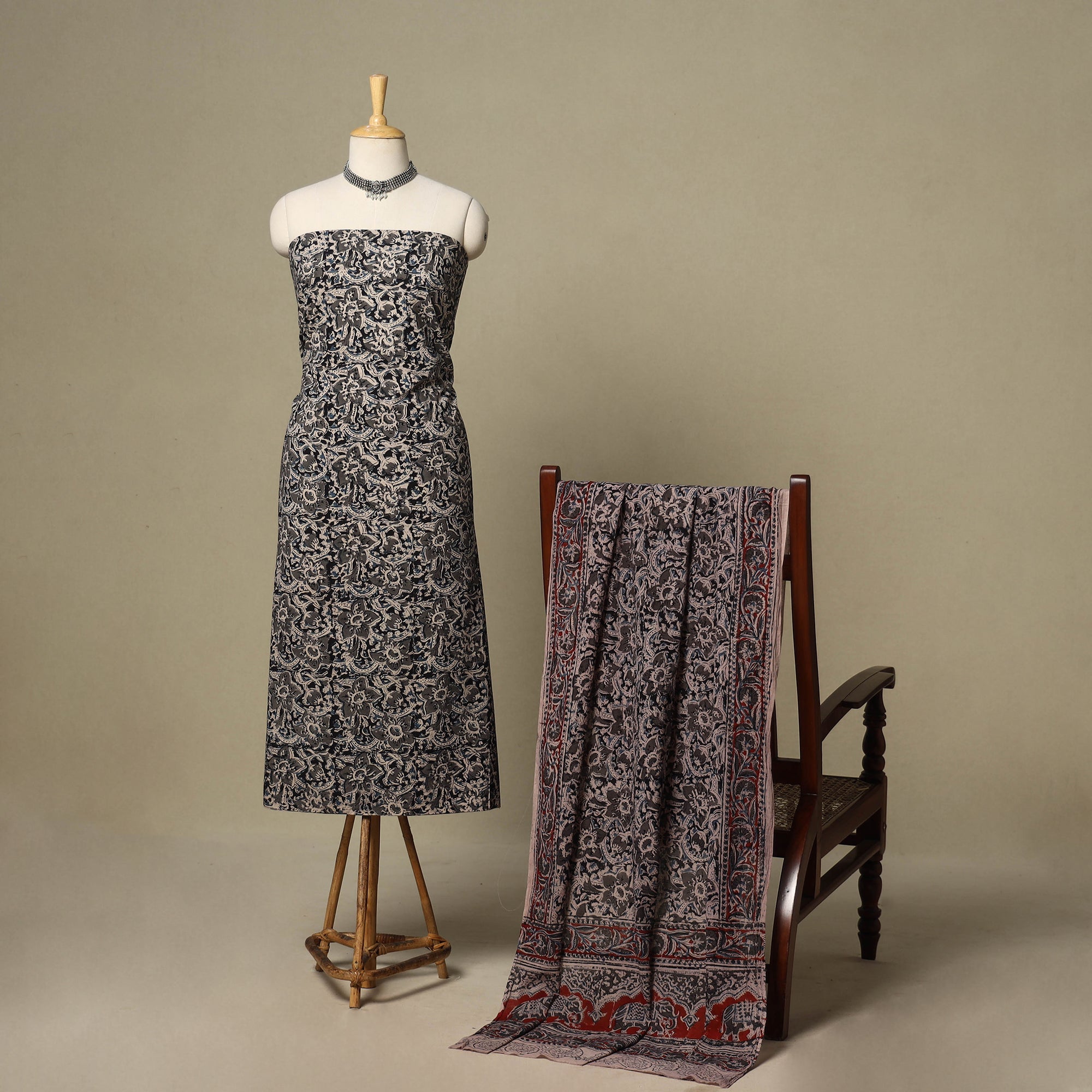 This black pedana kalamkari 2pc cotton dress material set reflects the timeless beauty of Indian textiles. Made using intricately carved wooden blocks and natural dyes, it showcases a beautifully printed kurta fabric with a coordinated dupatta. The breathable cotton ensures comfort throughout the day, making it an ideal choice for both everyday wear and special occasions.