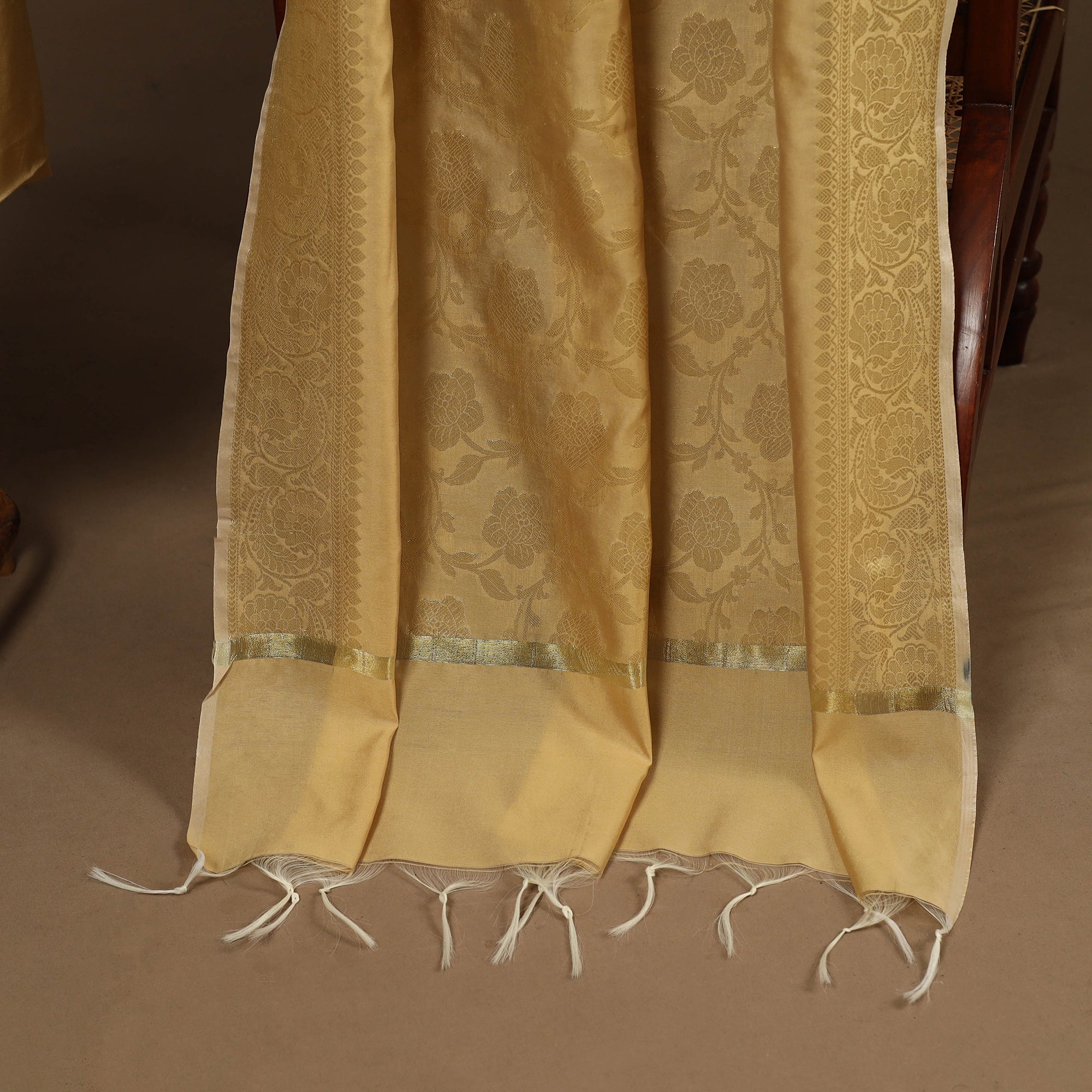 Add a touch of tradition to your wardrobe with this yellow 2pc unstitched dress material set. It includes a slub silk plain kurta fabric, paired with a zari work banarasi silk dupatta. The set also comes with a handcrafted matching earrings to complete your look, perfect for festive events, family gatherings or special occasions.