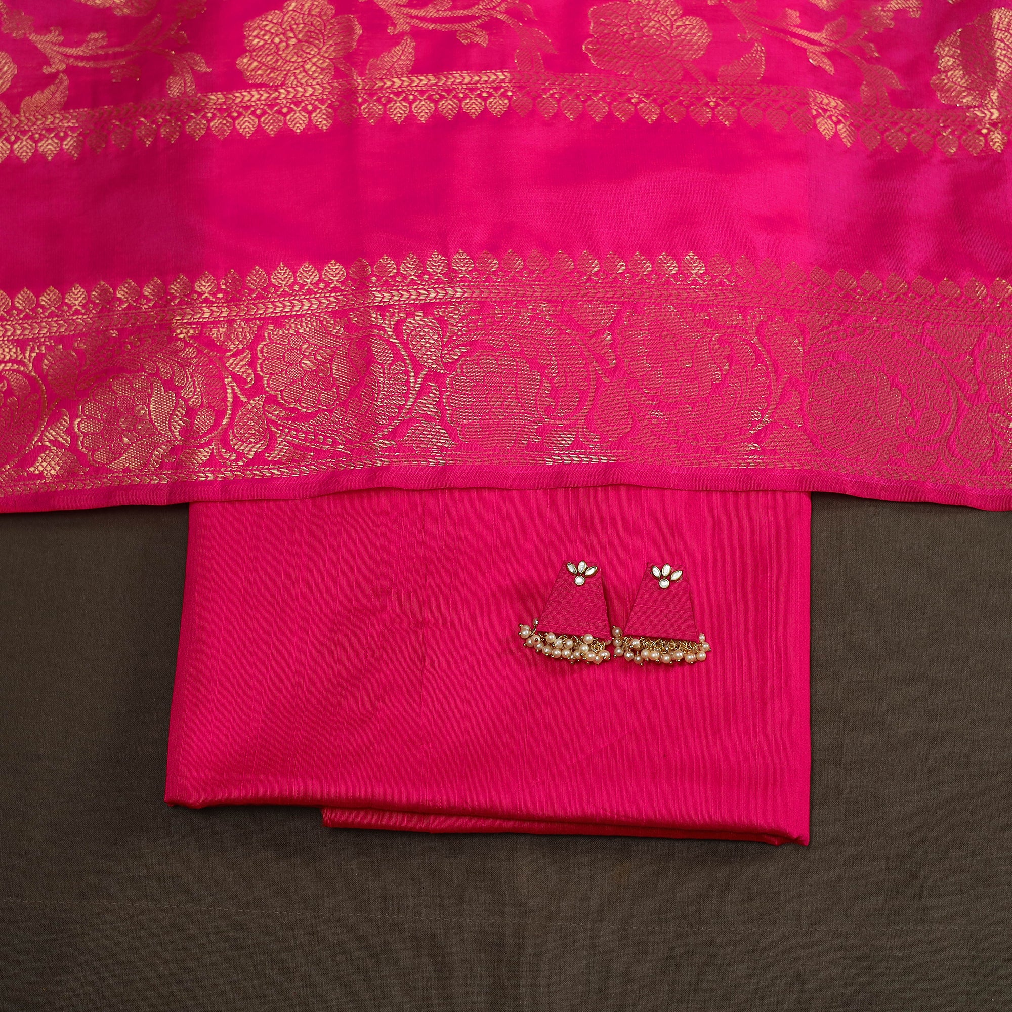 Add a touch of tradition to your wardrobe with this pink 2pc unstitched dress material set. It includes a slub silk plain kurta fabric, paired with a zari work banarasi silk dupatta. The set also comes with a handcrafted matching earrings to complete your look, perfect for festive events, family gatherings or special occasions.