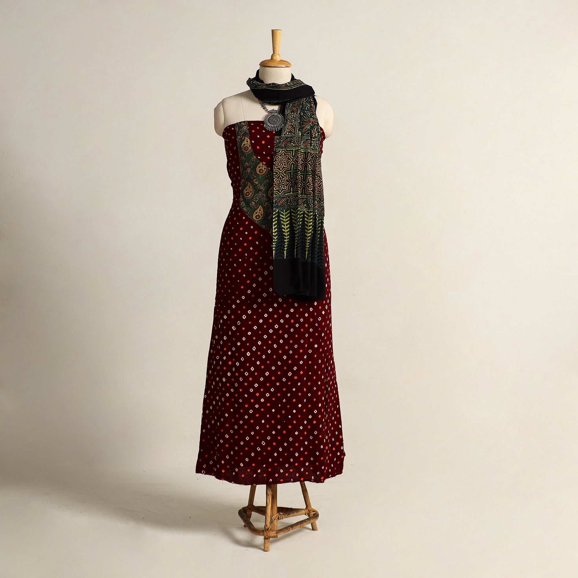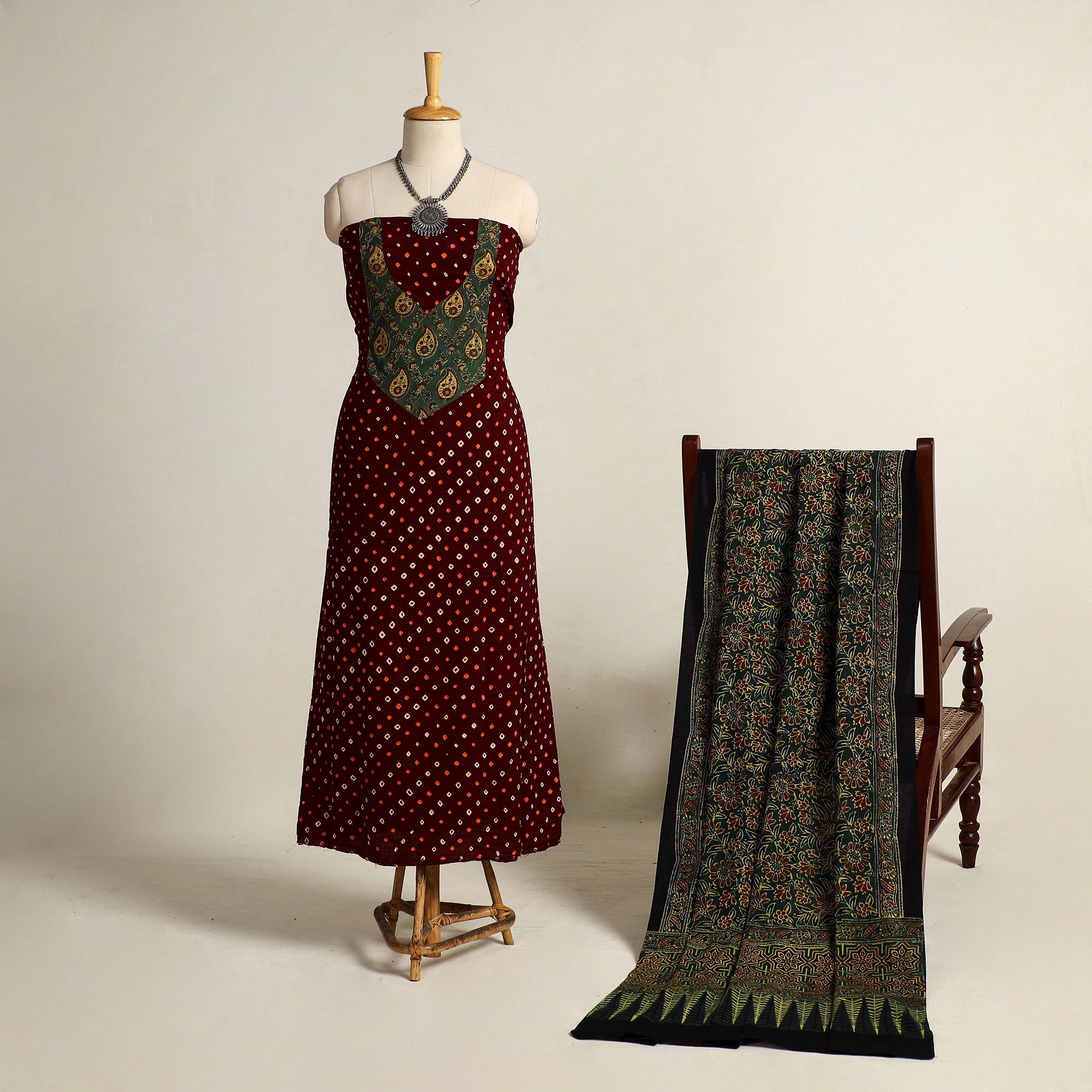 This maroon 2pc dress material set features a soft cotton kurta adorned with traditional bandhani tie-dye and detailed with an ajrakh patchwork element. It is paired with a beautifully block-printed cotton dupatta crafted using authentic ajrakh techniques. A perfect blend of two timeless crafts, this set adds a touch of tradition to your wardrobe, ideal for festive occasions or easy everyday wear.