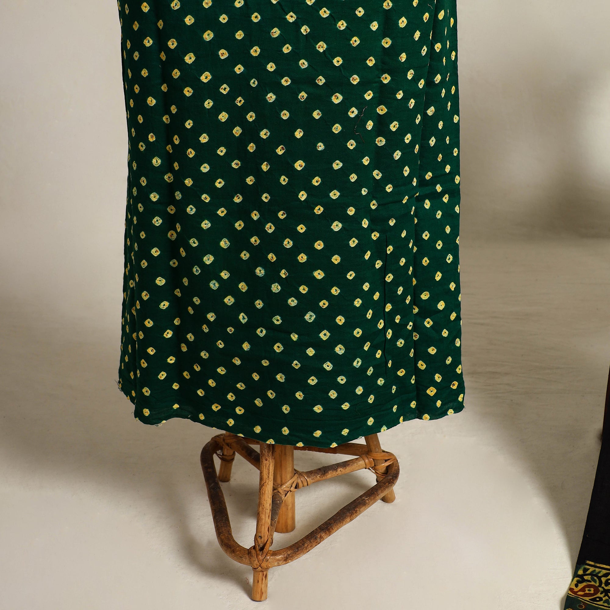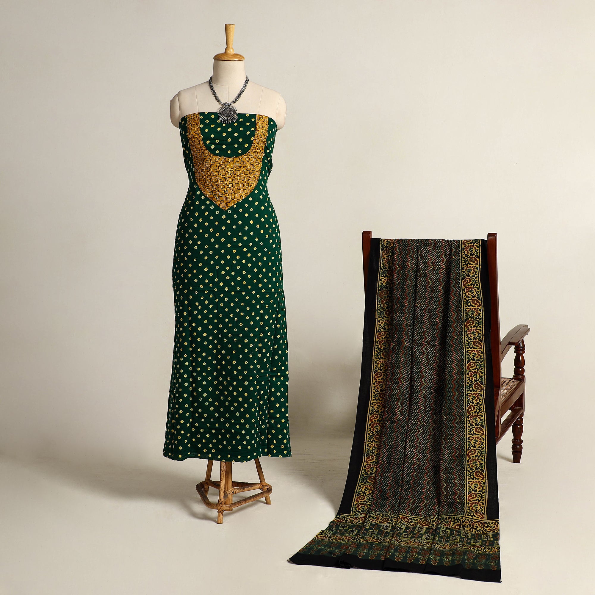 This green 2pc dress material set features a soft cotton kurta adorned with traditional bandhani tie-dye and detailed with an ajrakh patchwork element. It is paired with a beautifully block-printed cotton dupatta crafted using authentic ajrakh techniques. A perfect blend of two timeless crafts, this set adds a touch of tradition to your wardrobe, ideal for festive occasions or easy everyday wear.