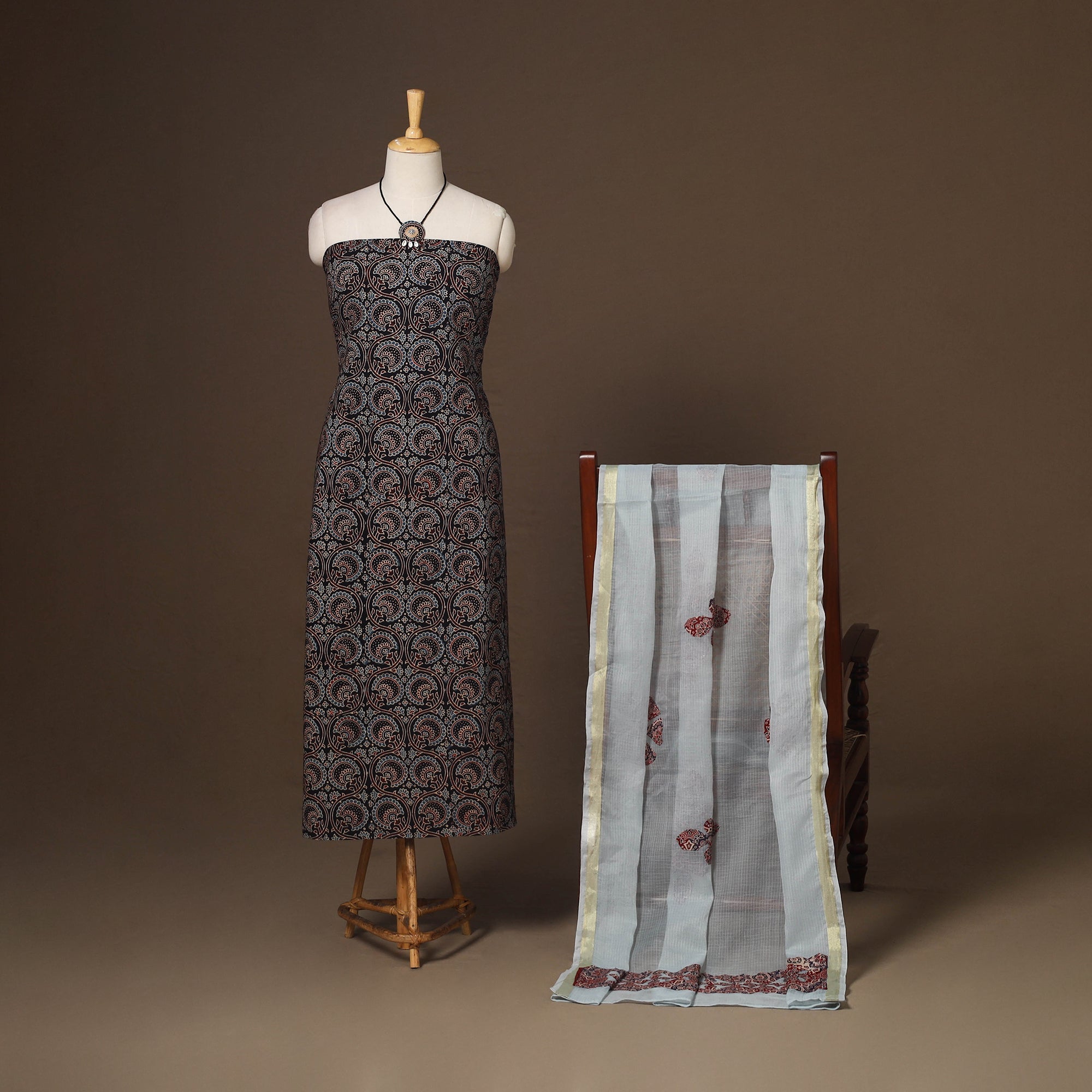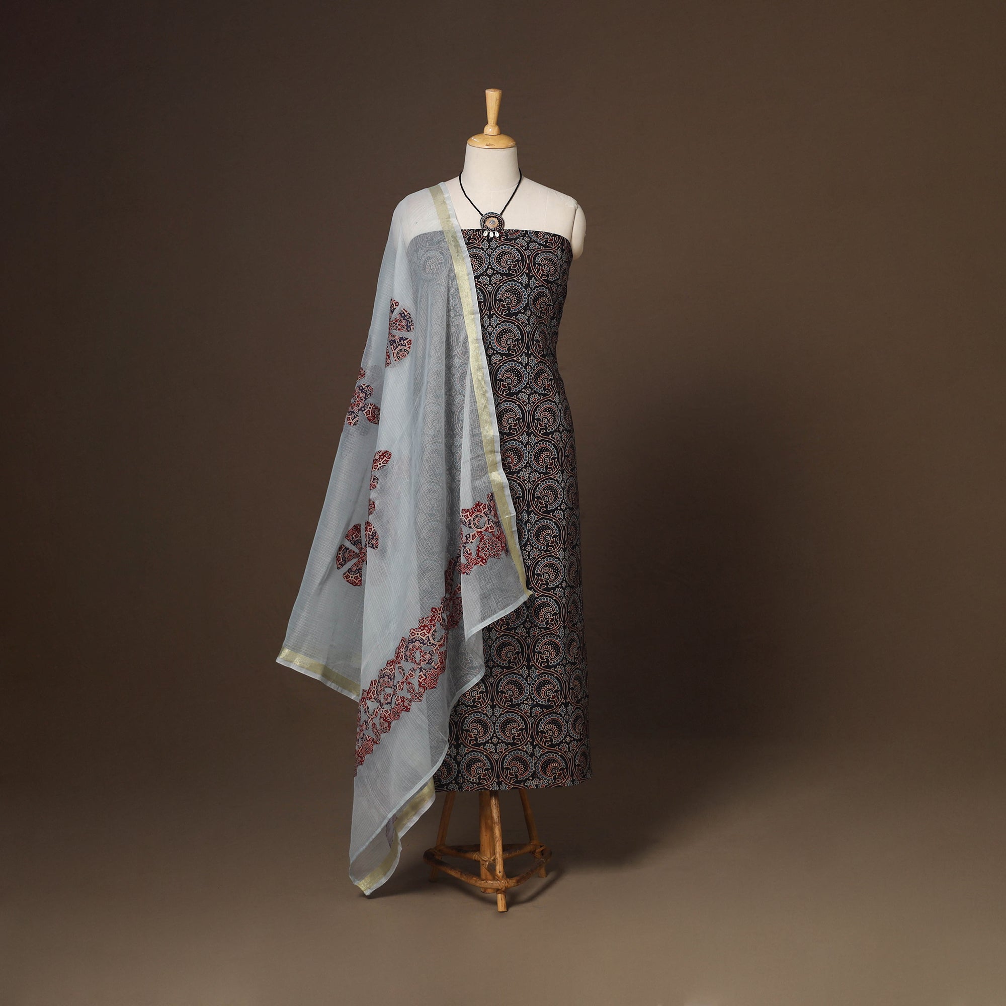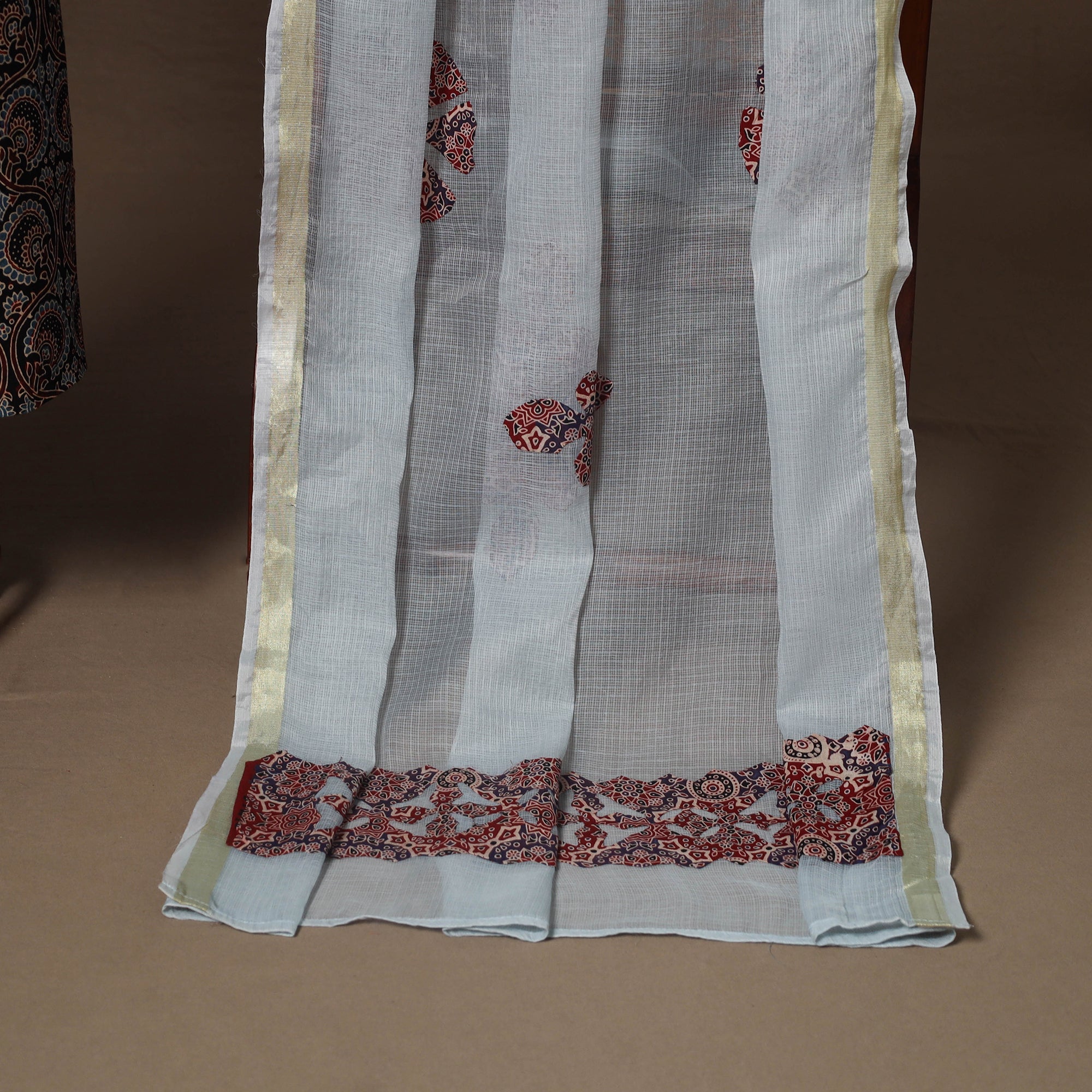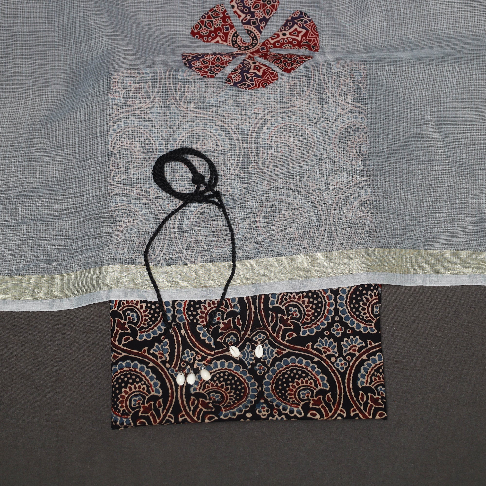 This black 2pc ajrakh block printed cotton natural dyed kurta with an applique cut work kota doria cotton dupatta is designed for both festive elegance and everyday comfort. Styled with a coordinated necklace and earrings, it brings refined ethnic charm to any occasion. Perfect for daily wear or meaningful gifting, it balances tradition with modern grace.
