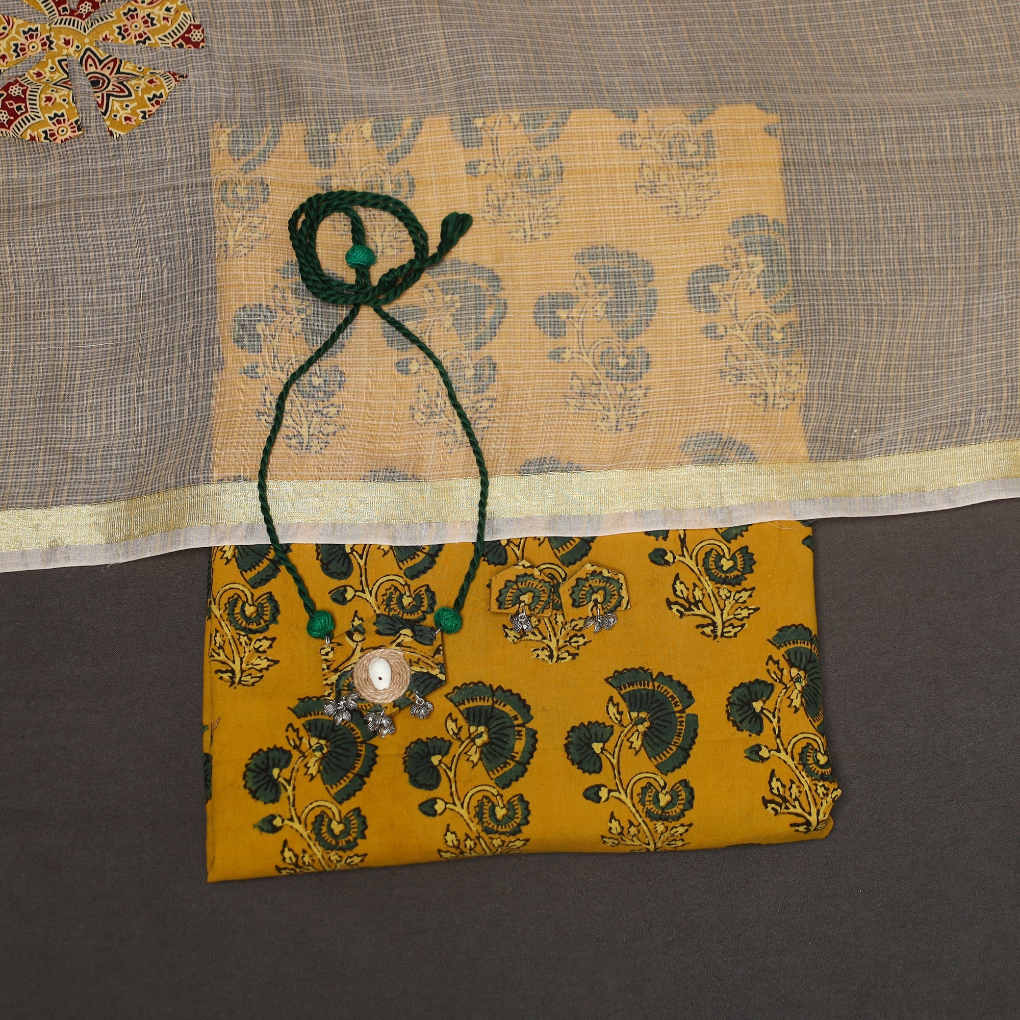 This yellow 2pc ajrakh block printed cotton natural dyed kurta with an applique cut work kota doria cotton dupatta is designed for both festive elegance and everyday comfort. Styled with a coordinated necklace and earrings, it brings refined ethnic charm to any occasion. Perfect for daily wear or meaningful gifting, it balances tradition with modern grace.