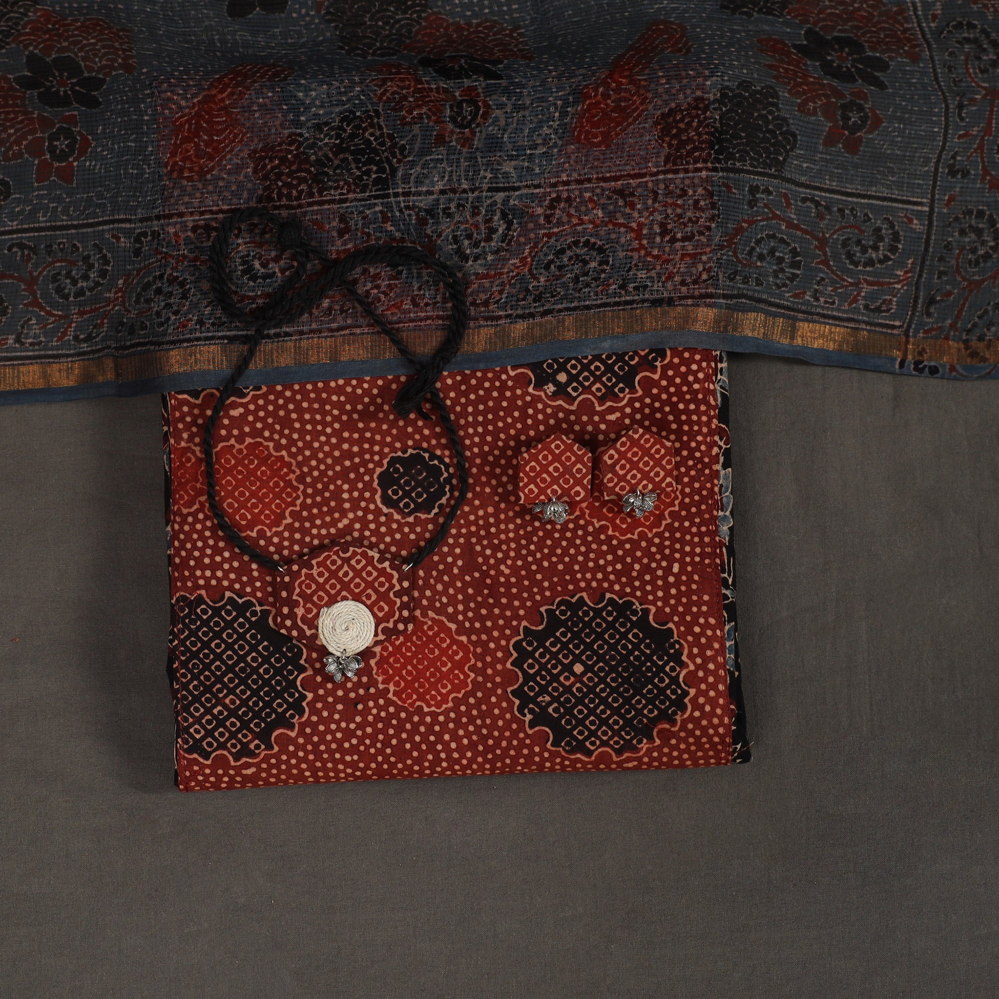 This black 2pc unstitched dress material set showcases an ajrakh cotton kurta adorned with intricate block prints and subtle patchwork highlights. It is paired with a lightweight kota doria dupatta, known for its fine weave and breezy texture. Enhanced with a coordinated necklace and earrings, this ensemble offers a refined ethnic charm ideal for festive occasions or meaningful gifting.