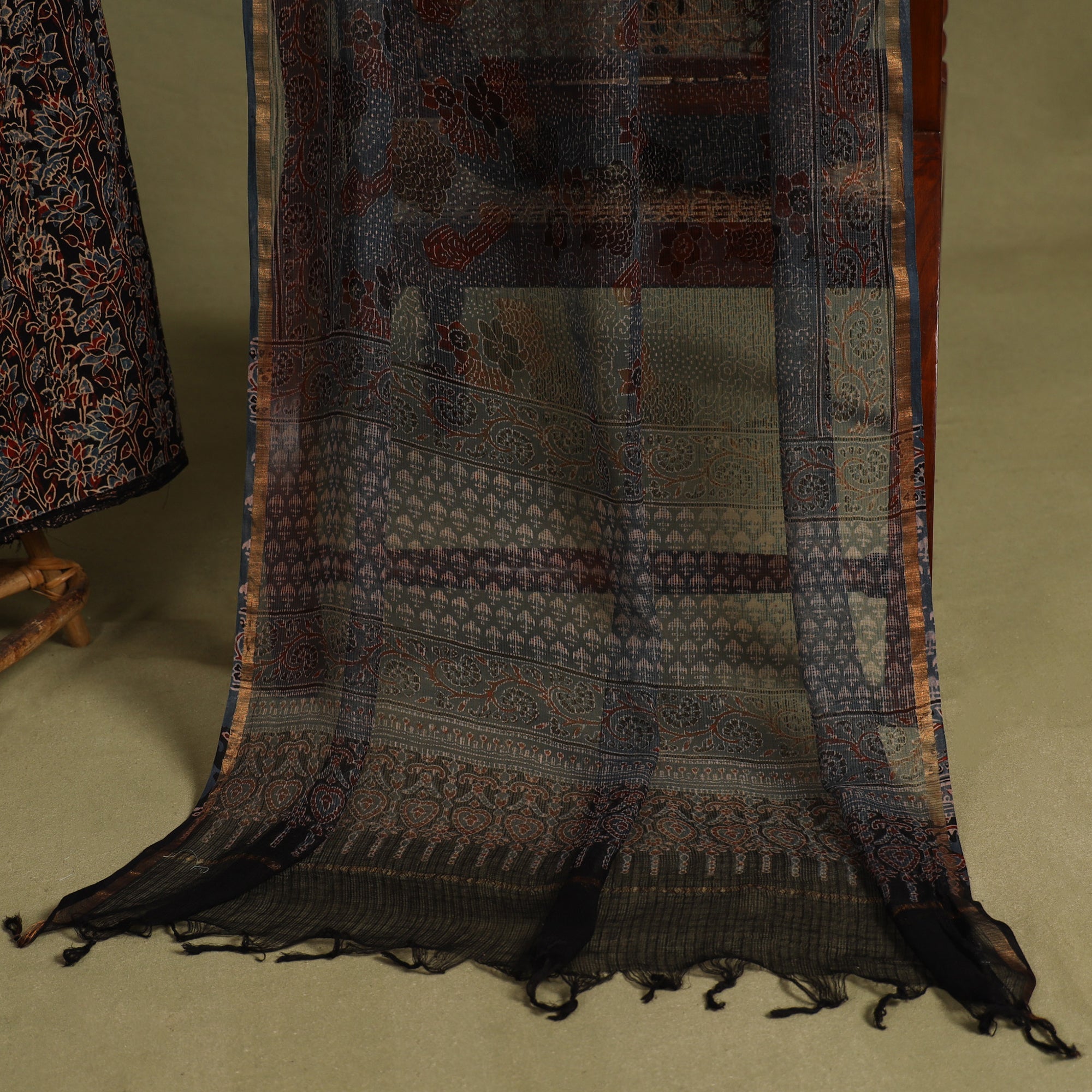 Ajrakh is a well-known traditional vegetable dyeing that resists block-printing techniques on cloth. Originated in Kutch, It is nearly around 4,500 years old practised by Khatri community of Kutch and Sikh.