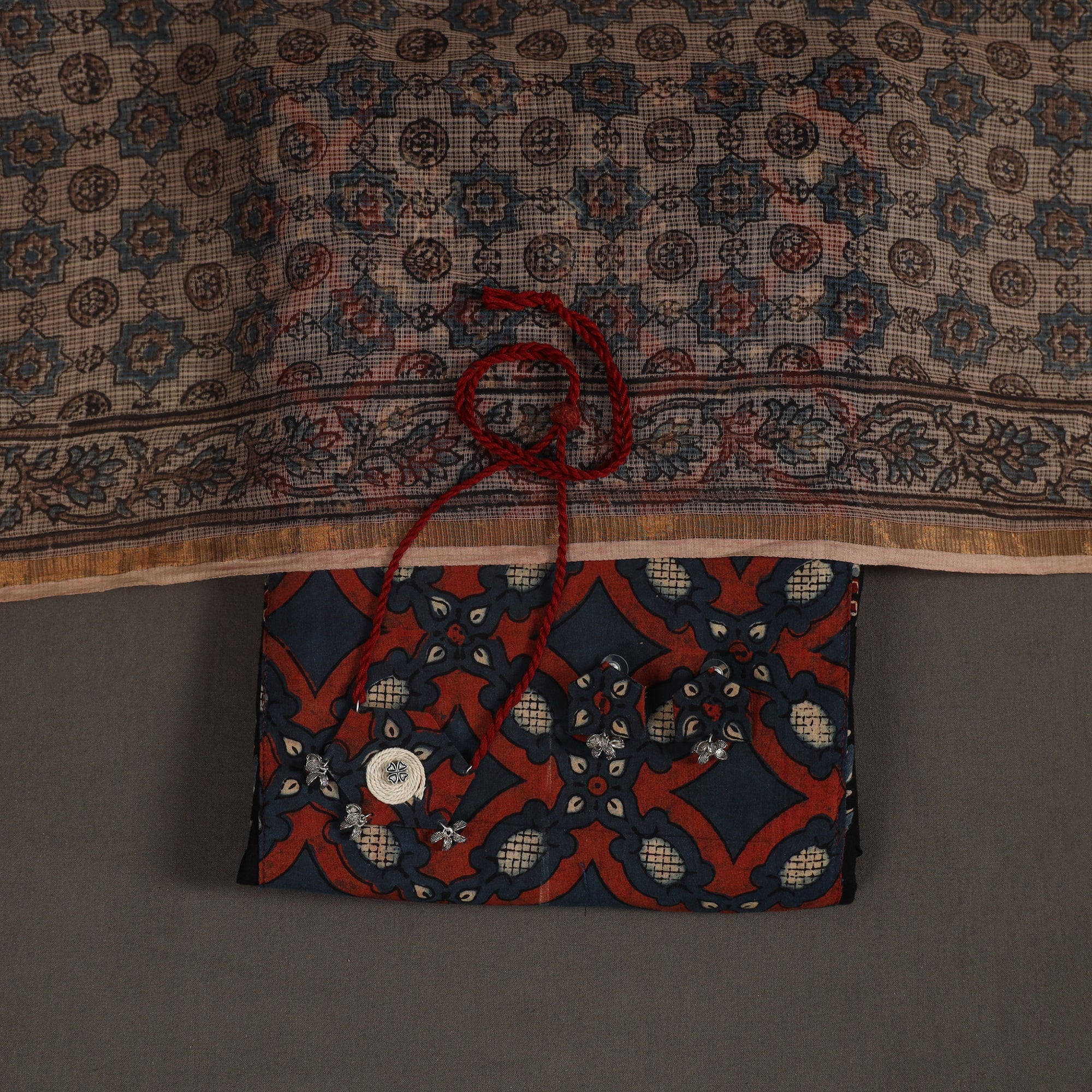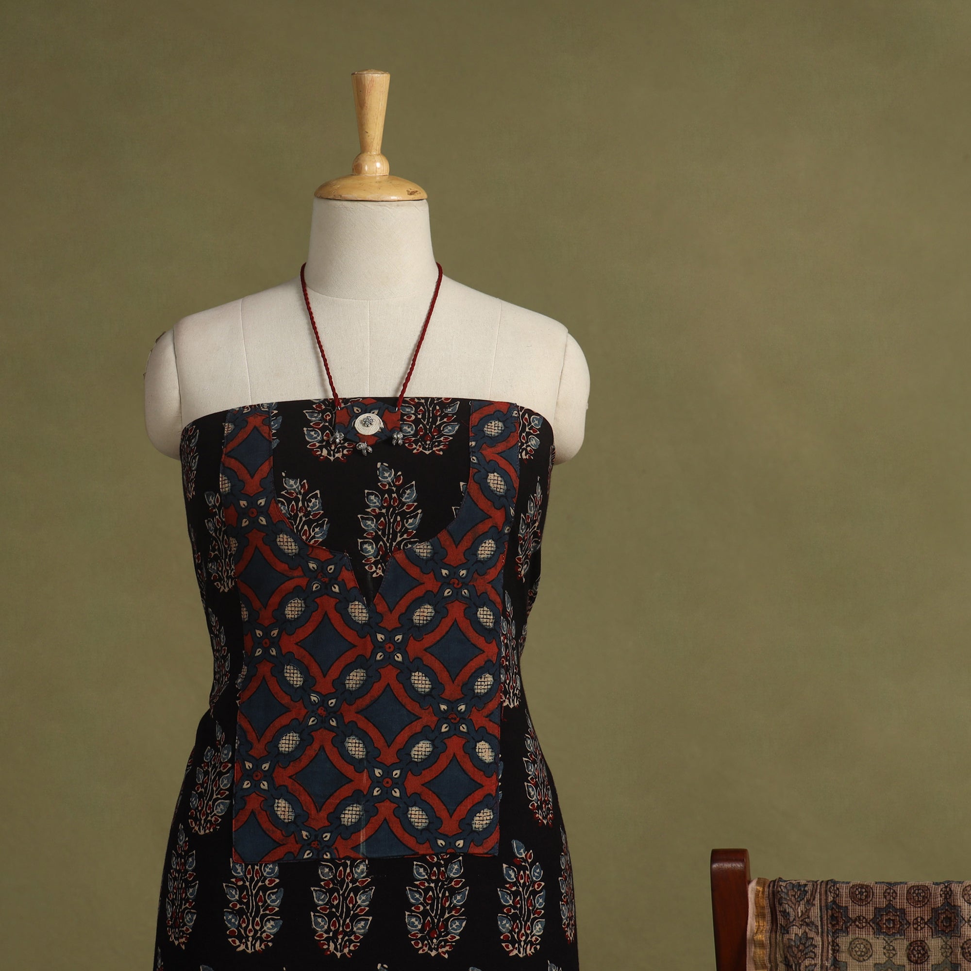 This black 2pc unstitched dress material set showcases an ajrakh cotton kurta adorned with intricate block prints and subtle patchwork highlights. It is paired with a lightweight kota doria dupatta, known for its fine weave and breezy texture. Enhanced with a coordinated necklace and earrings, this ensemble offers a refined ethnic charm ideal for festive occasions or meaningful gifting.