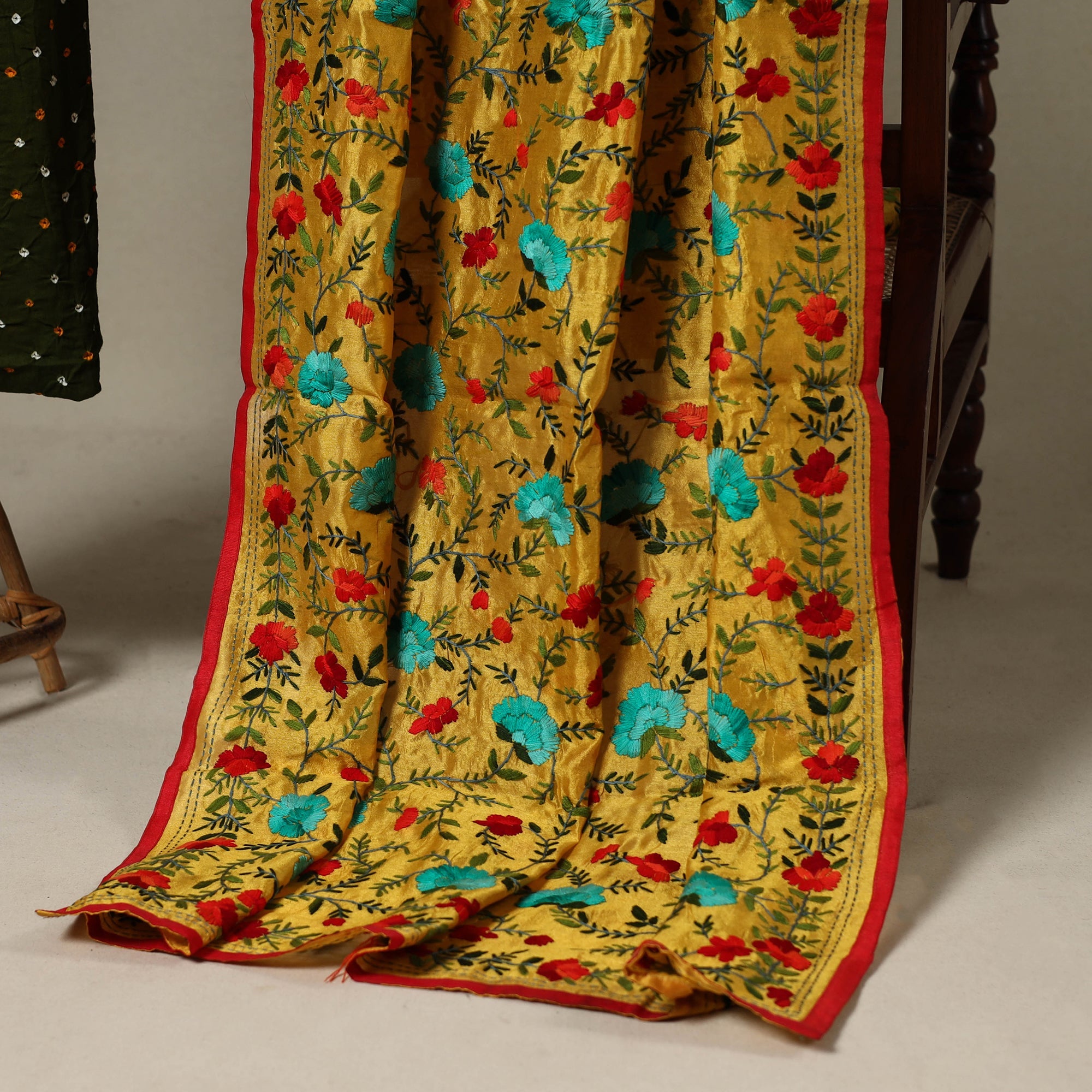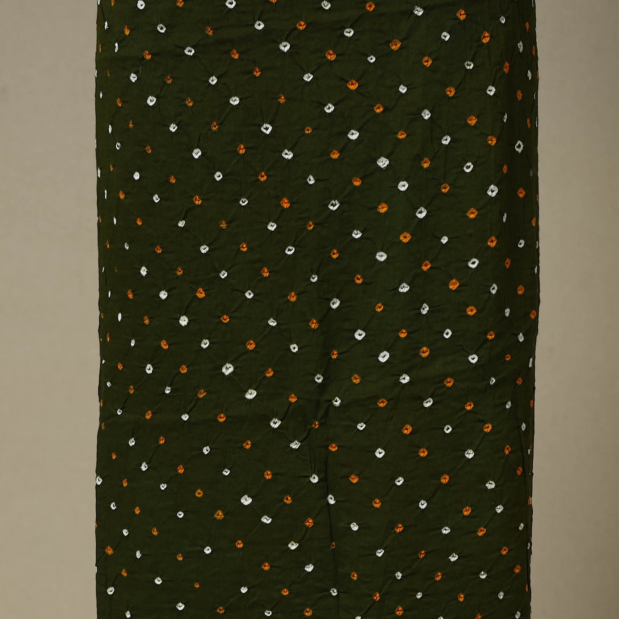 This green 2pc unstitched dress material set includes tie-dye cotton bandhani kurta fabric and a chanderi silk dupatta adorned with fine hand embroidery. Paired with a matching necklace and earrings, it offers a complete and graceful ethnic look. The blend of traditional kutch bandhani and intricate ranihati embroidery adds unique charm, perfect for festive occasions or meaningful gifting.