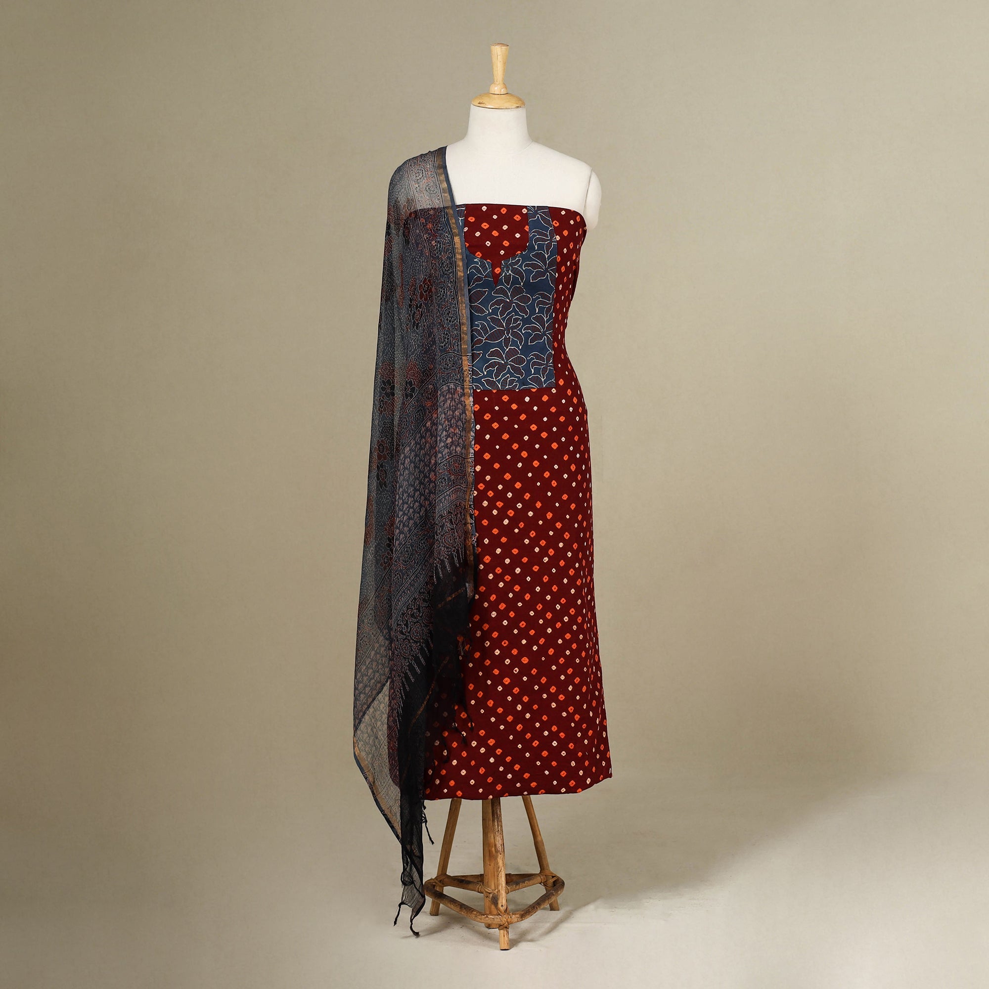 This maroon 2pc unstitched dress material set features a bandhani tie-dye cotton kurta with patchwork accents. It is paired with an ajrakh block print kota Doria dupatta, celebrated for its airy texture and delicate weave. Complemented by a matching ring and earrings, this set offers a graceful ethnic appearance, perfect for festive moments or thoughtful gifting.