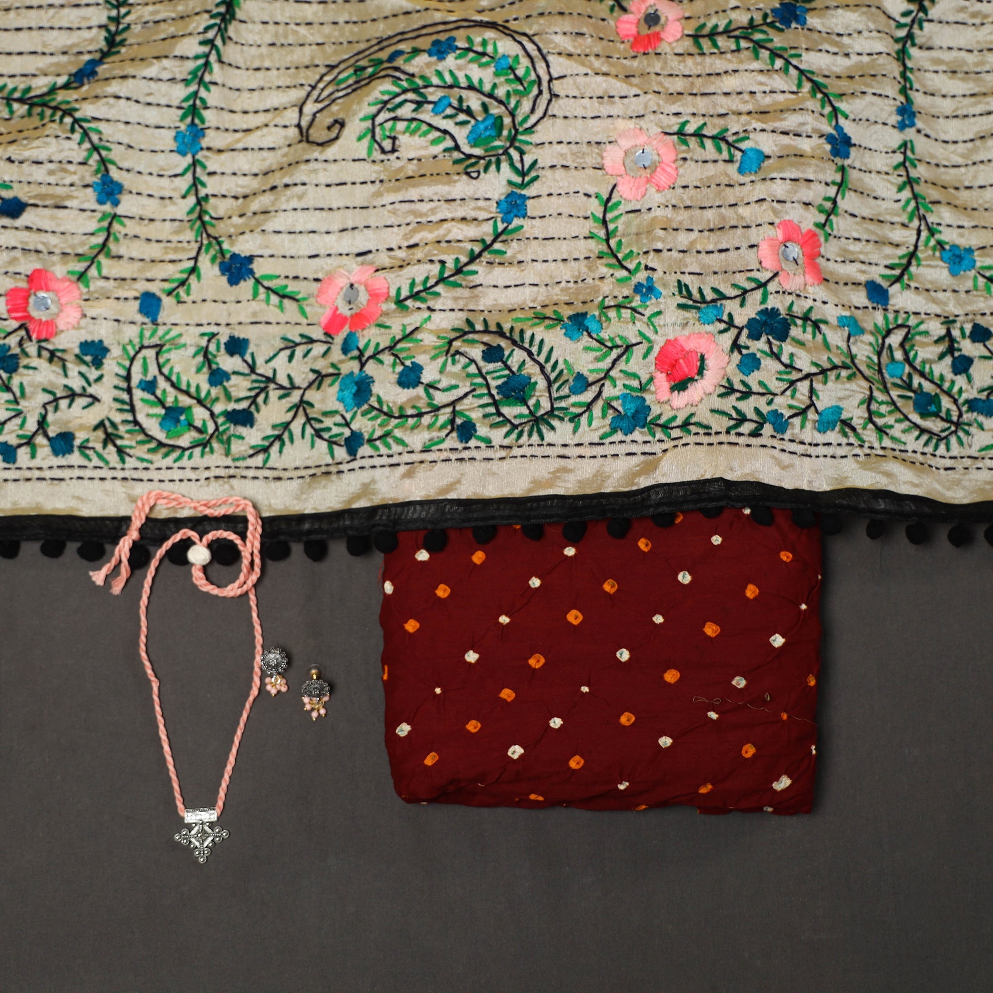 This maroon 2pc unstitched dress material set includes tie-dye cotton bandhani kurta fabric and a chanderi silk dupatta adorned with fine hand embroidery. Paired with a matching necklace and earrings, it offers a complete and graceful ethnic look. The blend of traditional kutch bandhani and intricate ranihati embroidery adds unique charm, perfect for festive occasions or meaningful gifting.