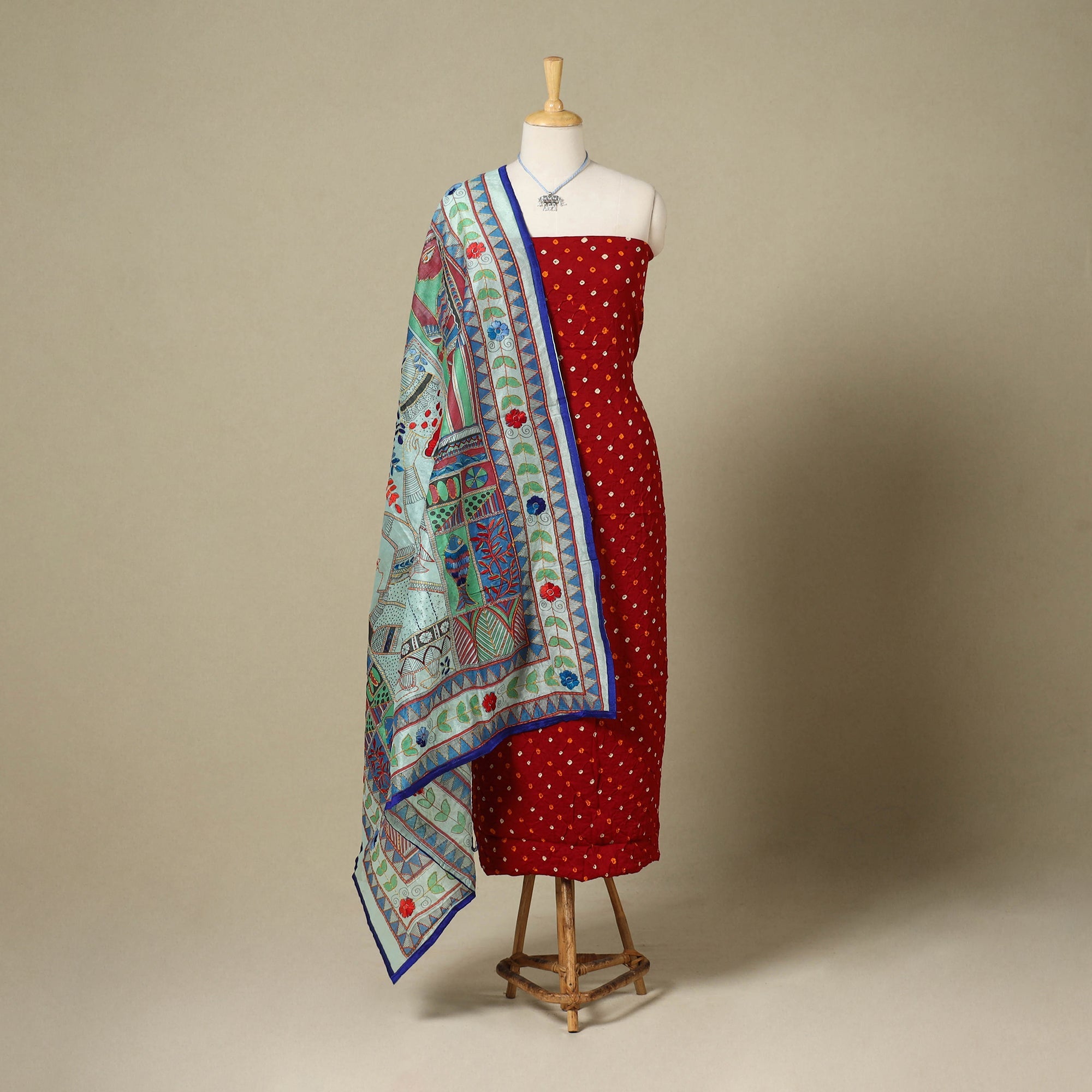 This red 2pc unstitched dress material set includes tie-dye cotton bandhani kurta fabric and a chanderi silk dupatta adorned with fine hand embroidery. Paired with a matching necklace and earrings, it offers a complete and graceful ethnic look. The blend of traditional kutch bandhani and intricate ranihati embroidery adds unique charm, perfect for festive occasions or meaningful gifting.