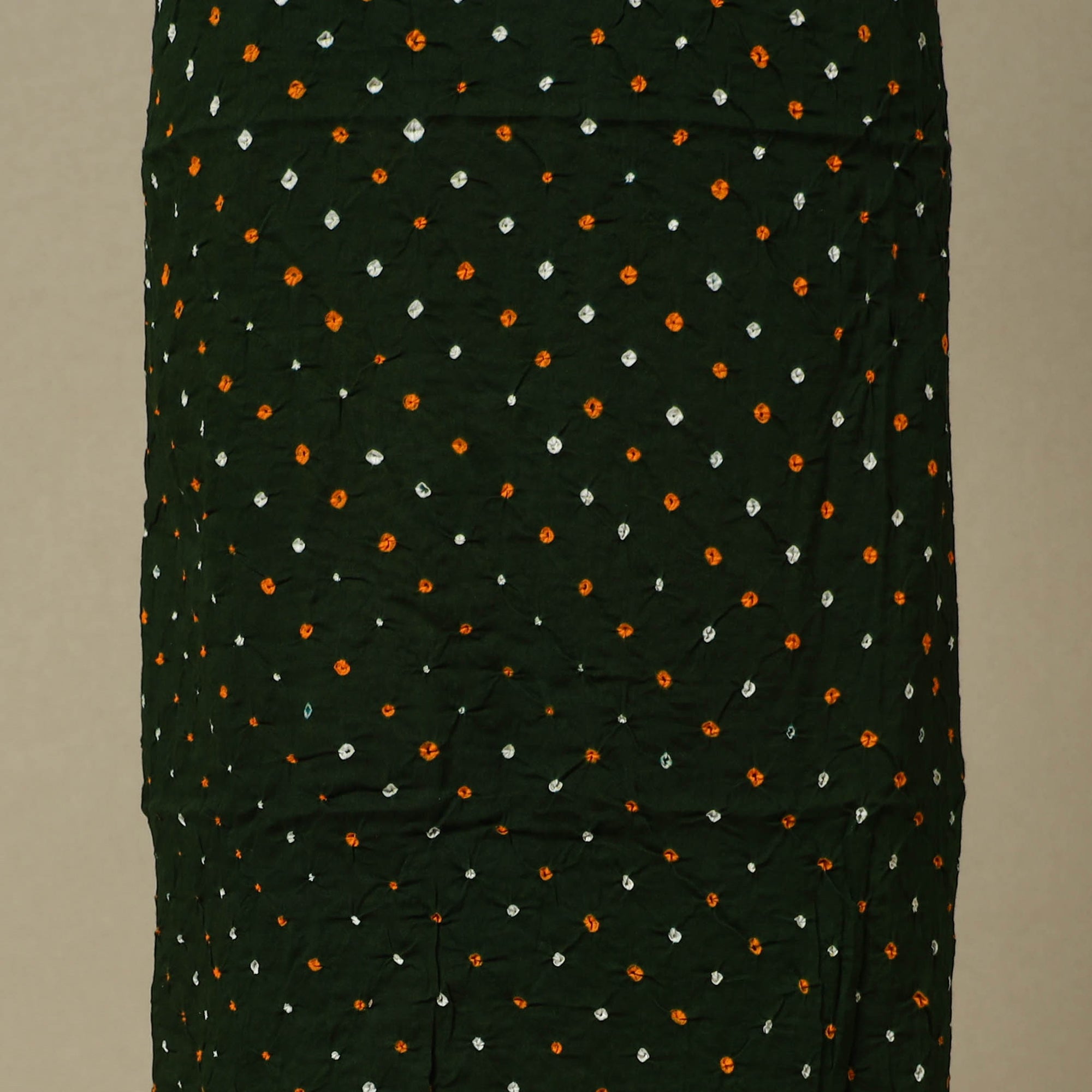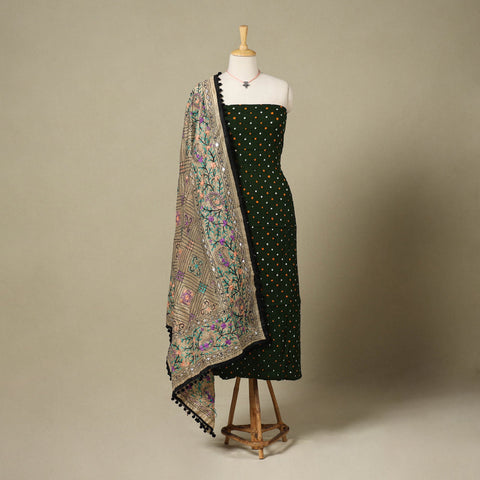 This green 2pc unstitched dress material set includes tie-dye cotton bandhani kurta fabric and a chanderi silk dupatta adorned with fine hand embroidery. Paired with a matching necklace and earrings, it offers a complete and graceful ethnic look. The blend of traditional kutch bandhani and intricate ranihati embroidery adds unique charm, perfect for festive occasions or meaningful gifting.