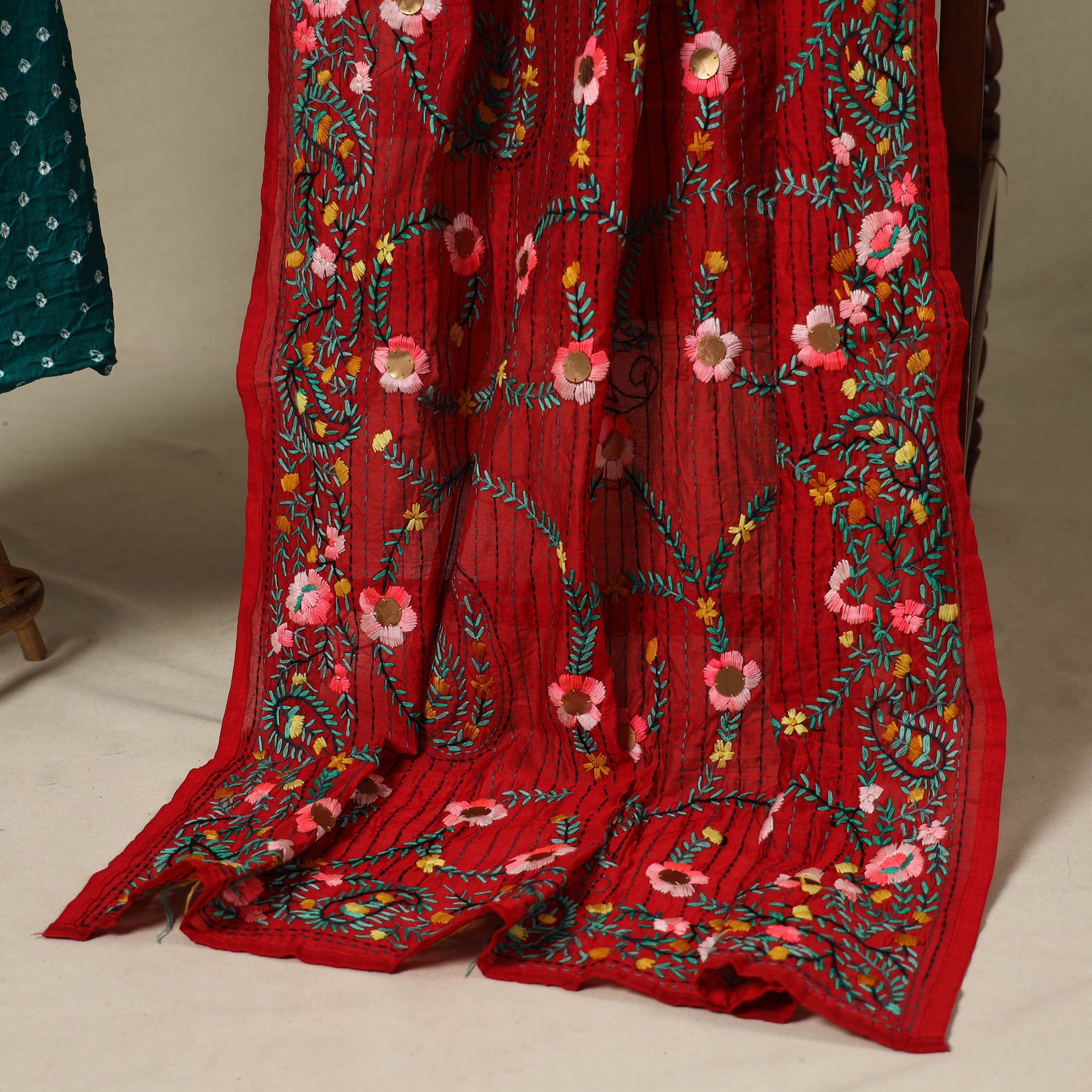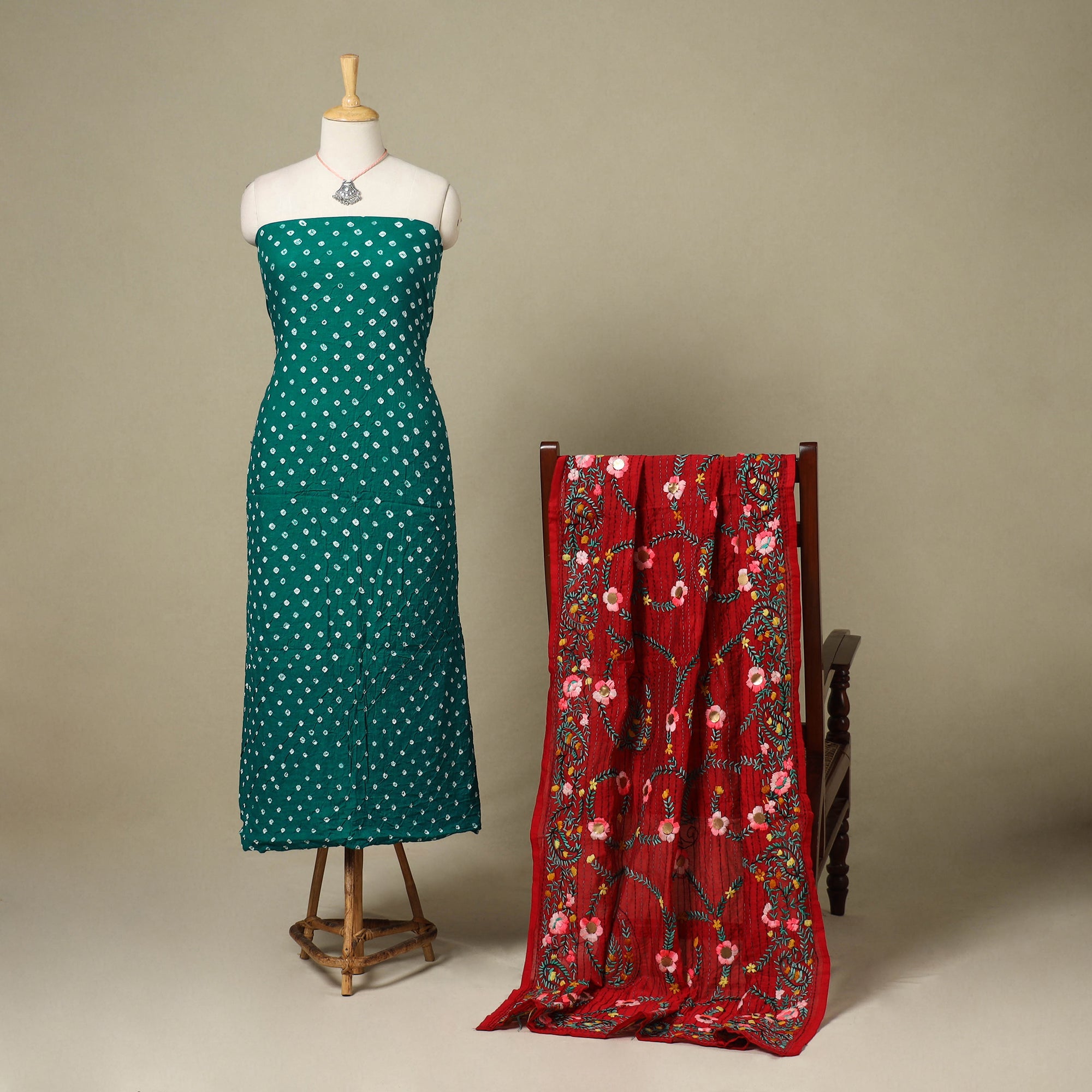 This green 2pc unstitched dress material set includes tie-dye cotton bandhani kurta fabric and a chanderi silk dupatta adorned with fine hand embroidery. Paired with a matching necklace and earrings, it offers a complete and graceful ethnic look. The blend of traditional kutch bandhani and intricate ranihati embroidery adds unique charm, perfect for festive occasions or meaningful gifting.
