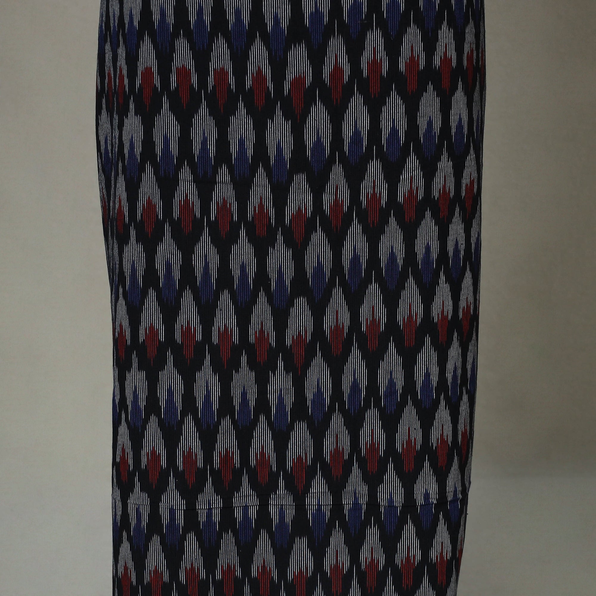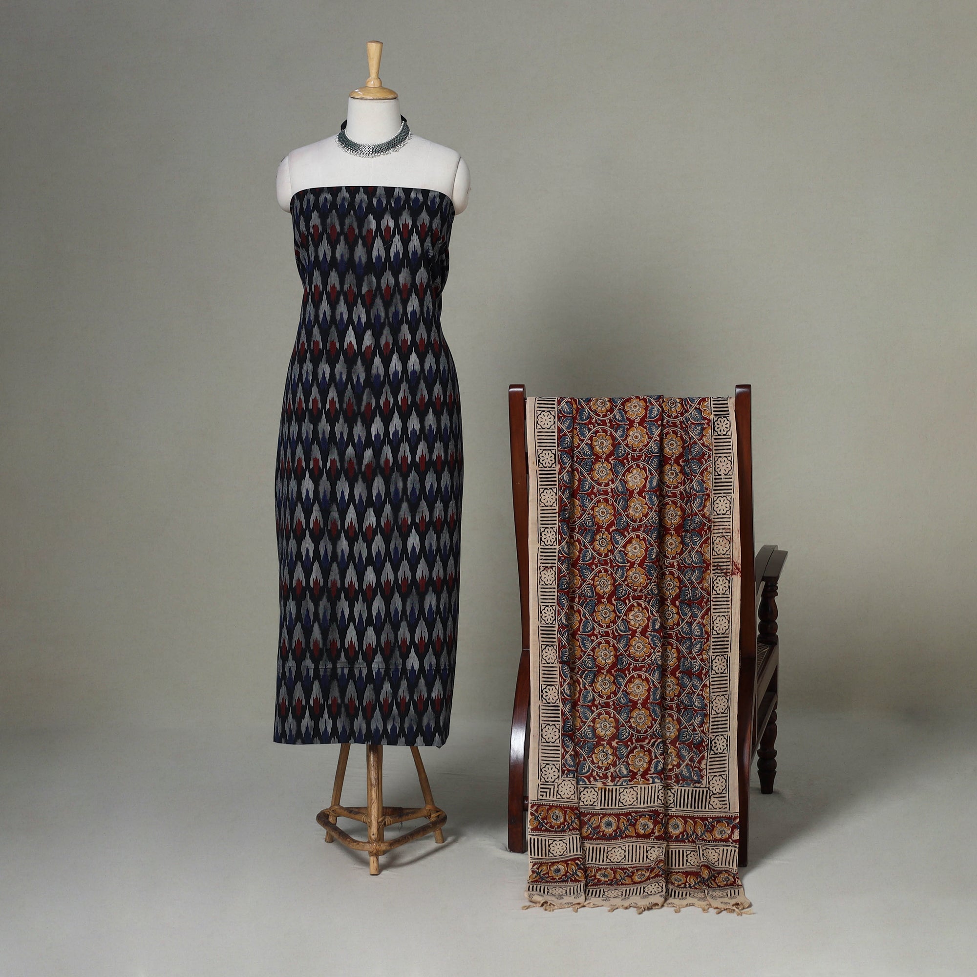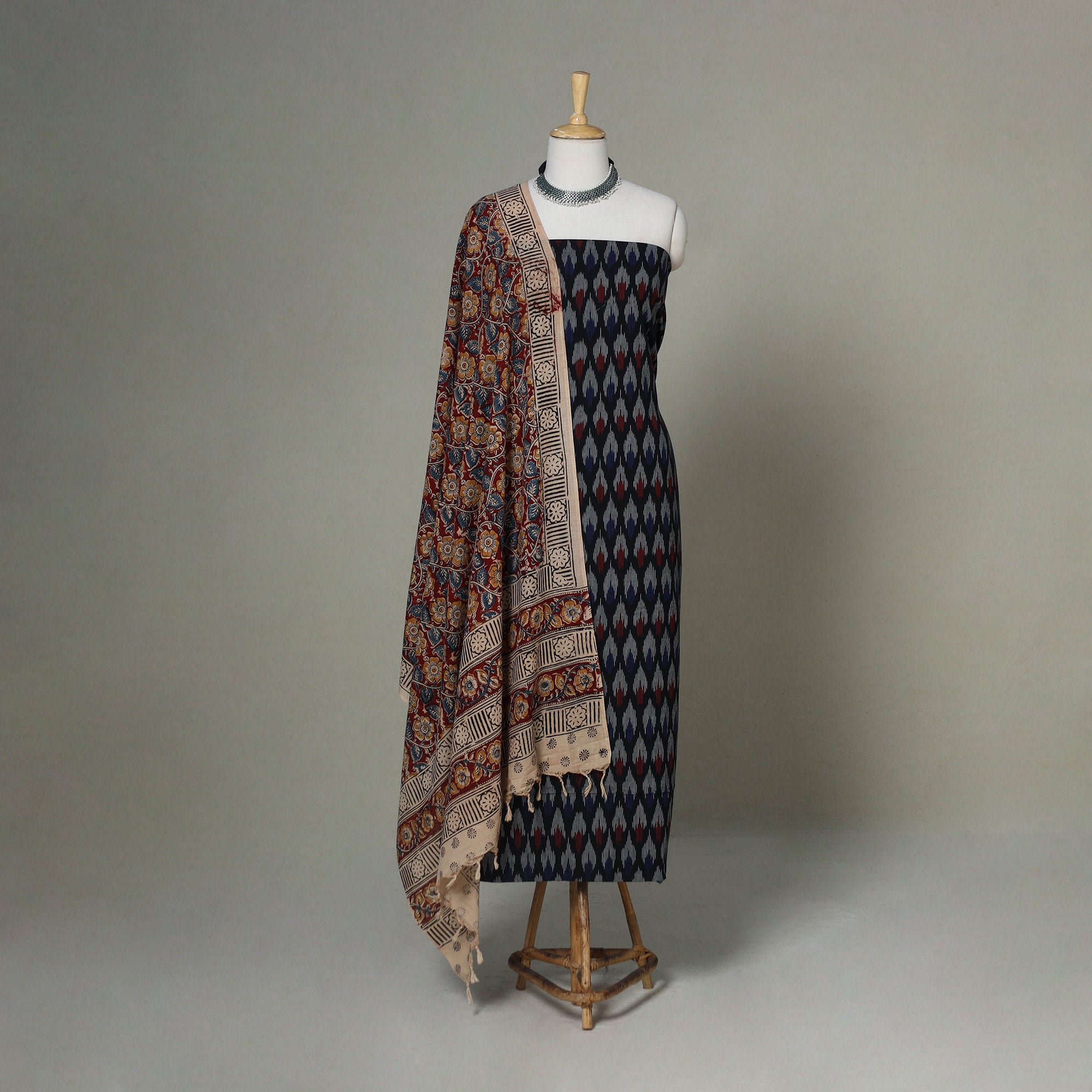 This black 2pc cotton dress material set features a pochampally ikat kurta paired with a kalamkari block print dupatta. Crafted using a traditional resist-dyeing technique, where both warp and weft threads are dyed before weaving. The blend of geometric pochampally ikat and artisanal Kalamkari block printing makes this ensemble truly unique ideal for festive occasions, weddings, or elegant everyday wear.