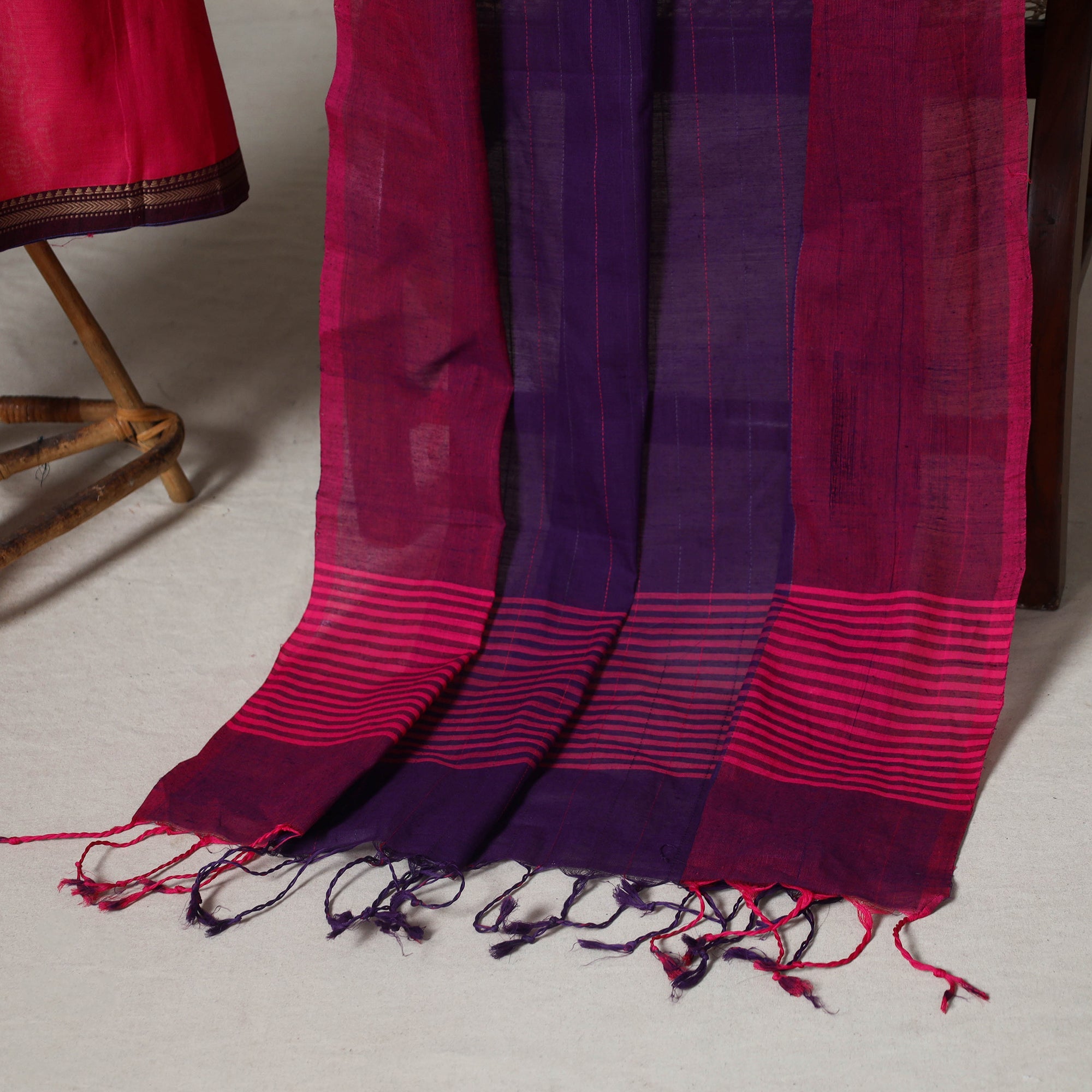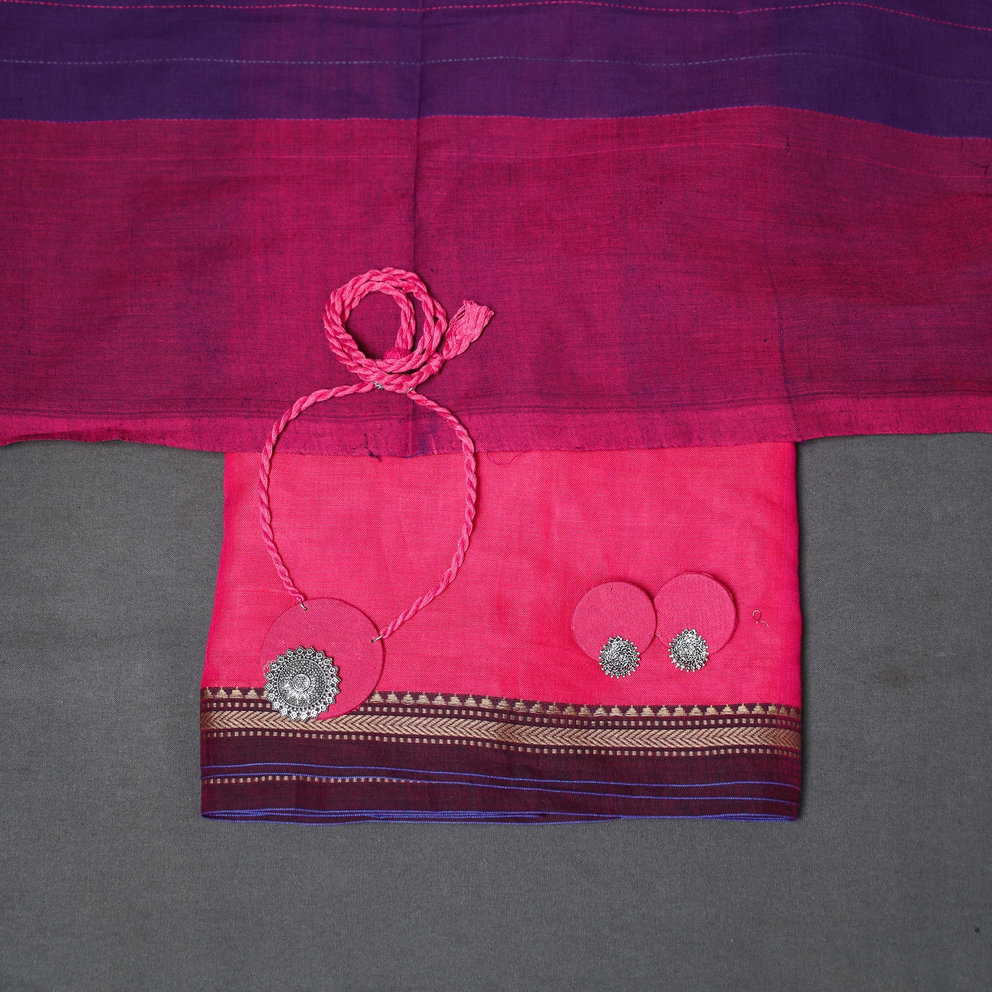 Add a touch of tradition and elegance to your wardrobe with this pink 2pc dharwad cotton dress material set. It includes a finely woven bordered dharwad kurta fabric, paired with a jamdani handloom dupatta. The set is thoughtfully styled with a handcrafted necklace and matching earrings to complete your look. Perfect for festive events, family gatherings, or special occasions.
