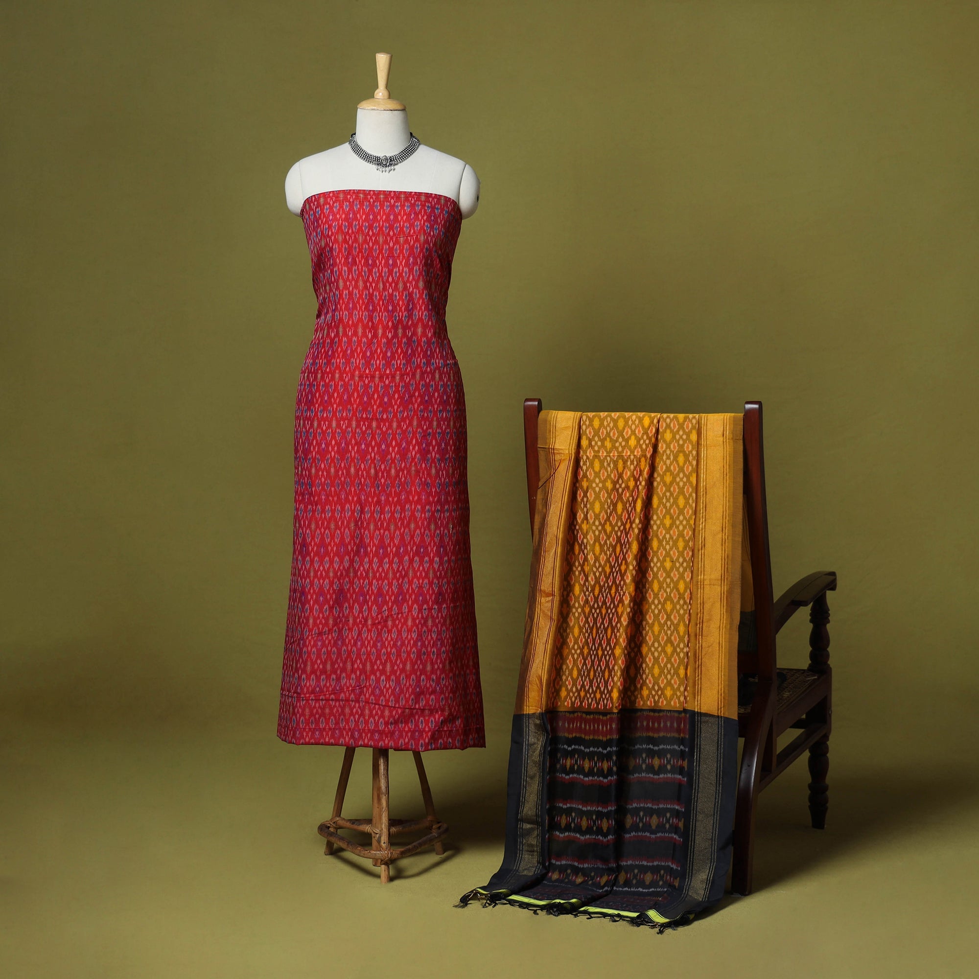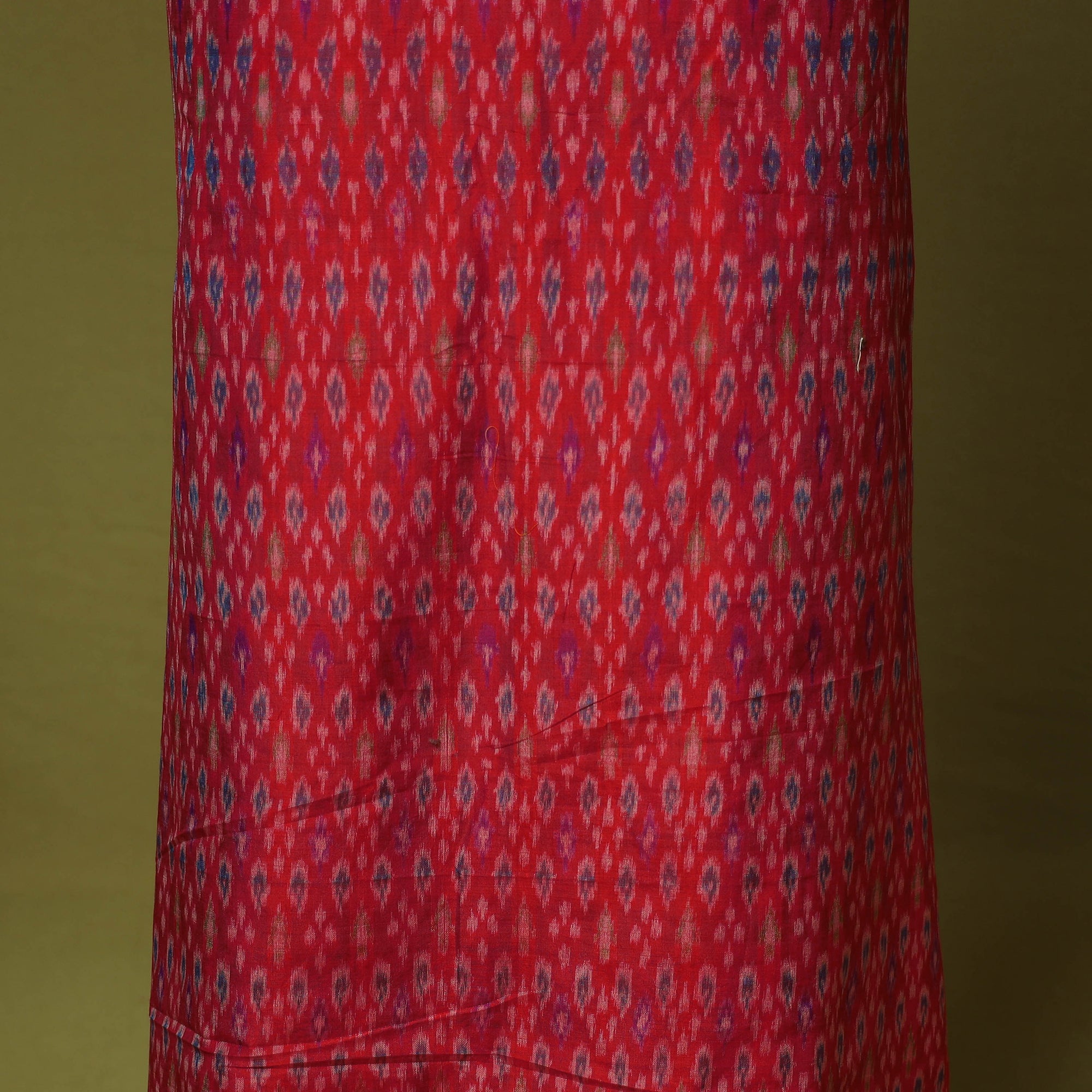 This red 2pc unstitched sico silk-cotton pochampally Ikat dress material is handwoven by skilled weavers, where each thread is resist-dyed before weaving to form vibrant, intricate patterns. The set features a silk-cotton kurta fabric with a matching dupatta with a zari border and tassels. Blending silk’s sheen with cotton’s comfort, it drapes gracefully, making it ideal for creating elegant ethnic attire.