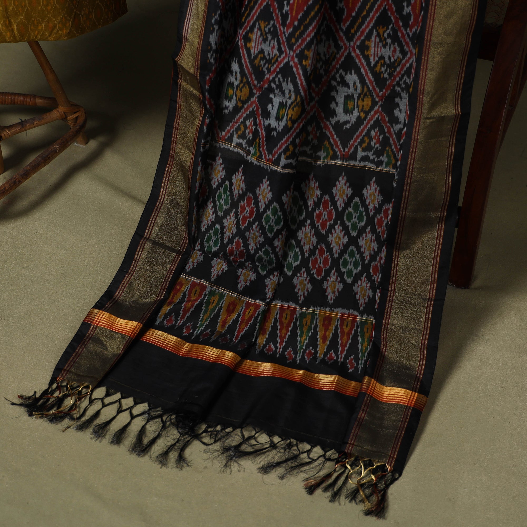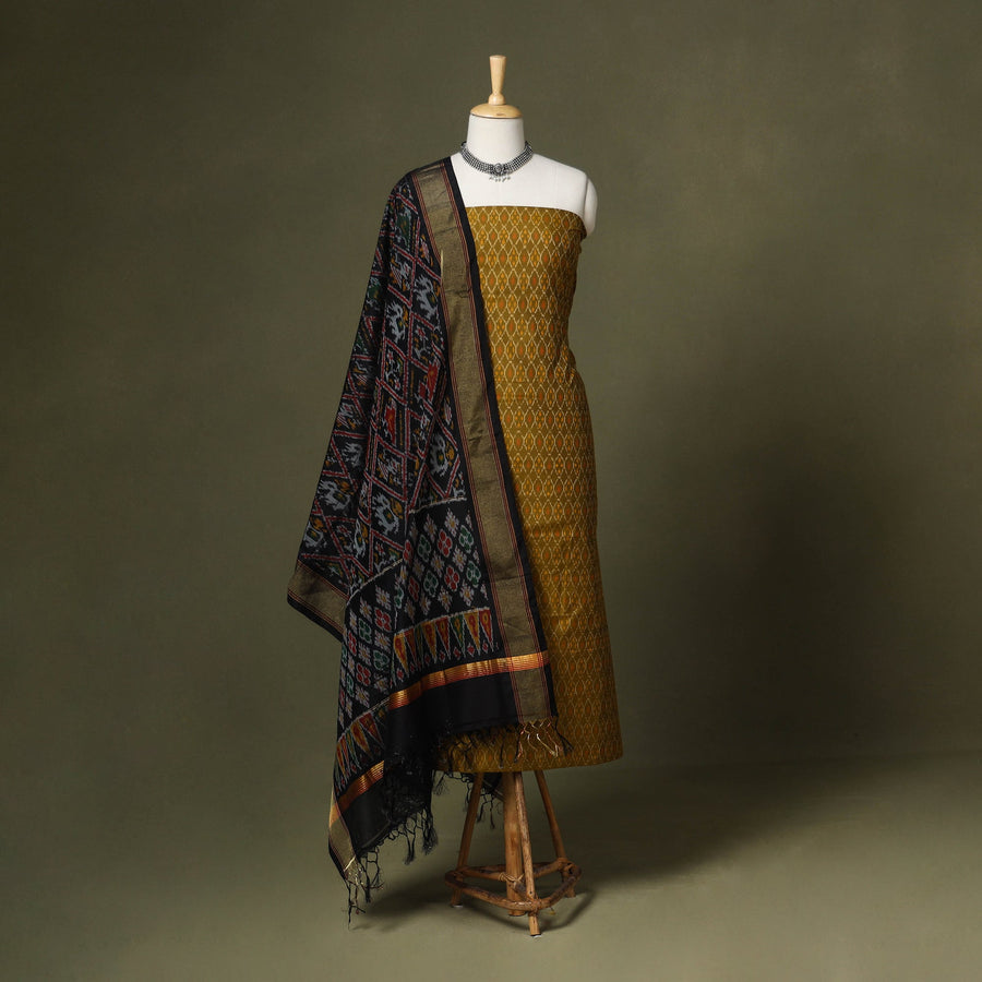 This green 2pc unstitched sico silk cotton handloom pochampally Ikat dress material is woven by skilled weavers, with each thread resist-dyed before weaving to create vibrant, intricate patterns. The set includes a silk-cotton kurta fabric and a matching dupatta with zari border and tassels. Combining silk’s sheen with cotton’s comfort, it drapes beautifully, perfect for crafting graceful ethnic wear.