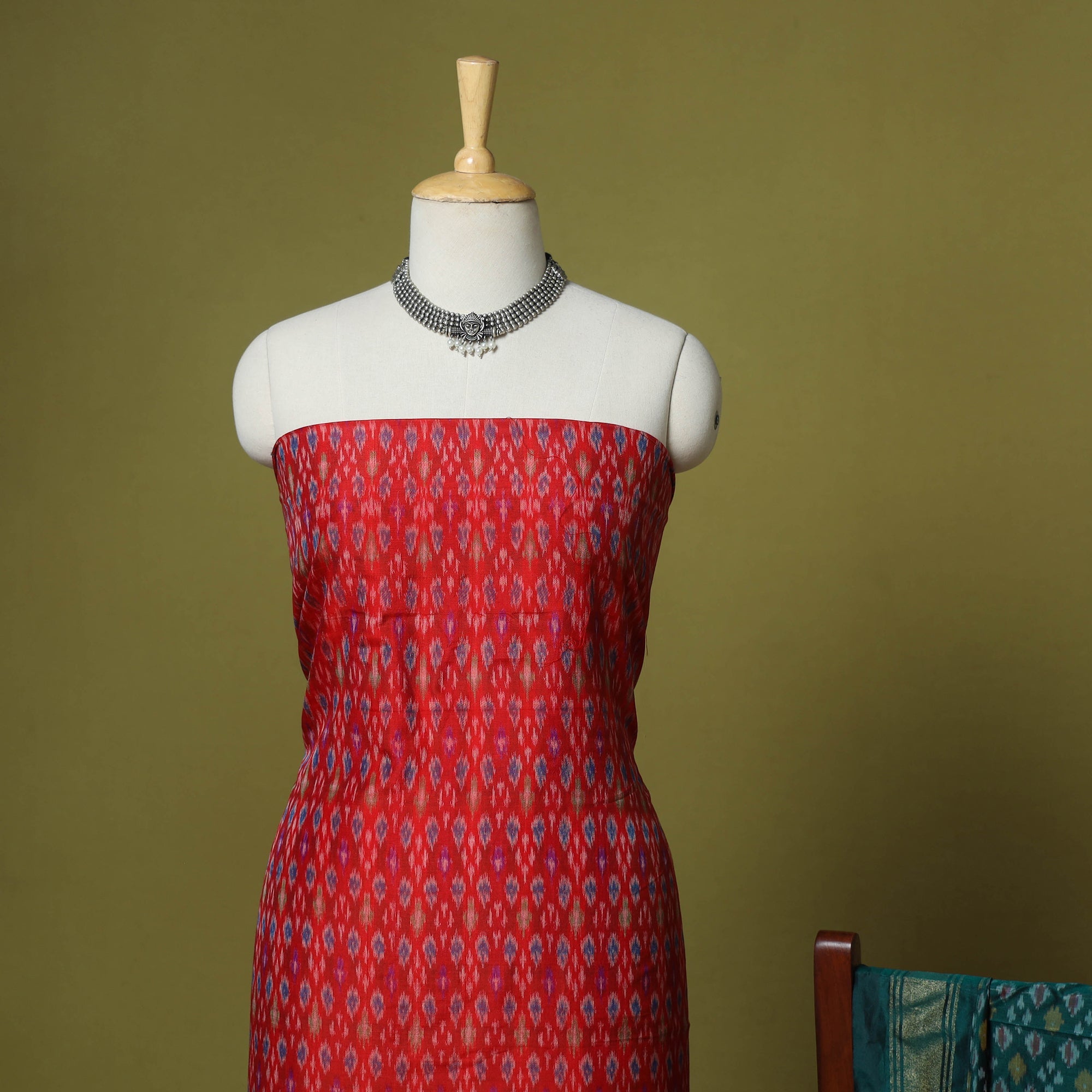 This red 2pc unstitched sico silk-cotton pochampally Ikat dress material is handwoven by skilled weavers, where each thread is resist-dyed before weaving to form vibrant, intricate patterns. The set features a silk-cotton kurta fabric with a matching dupatta with a zari border and tassels. Blending silk’s sheen with cotton’s comfort, it drapes gracefully, making it ideal for creating elegant ethnic attire.