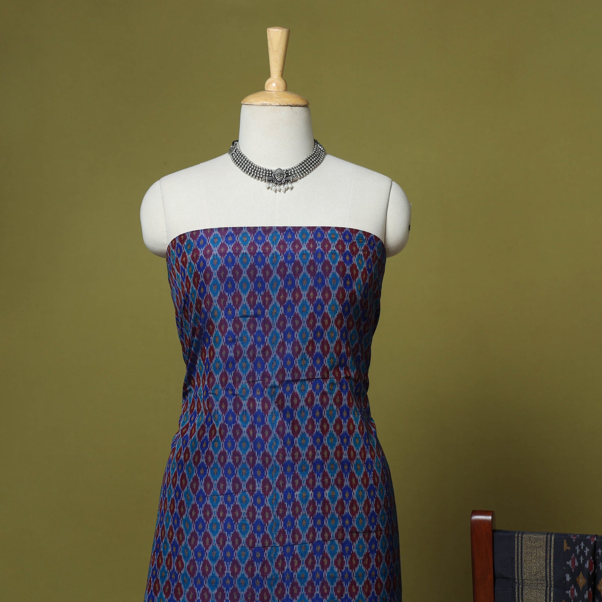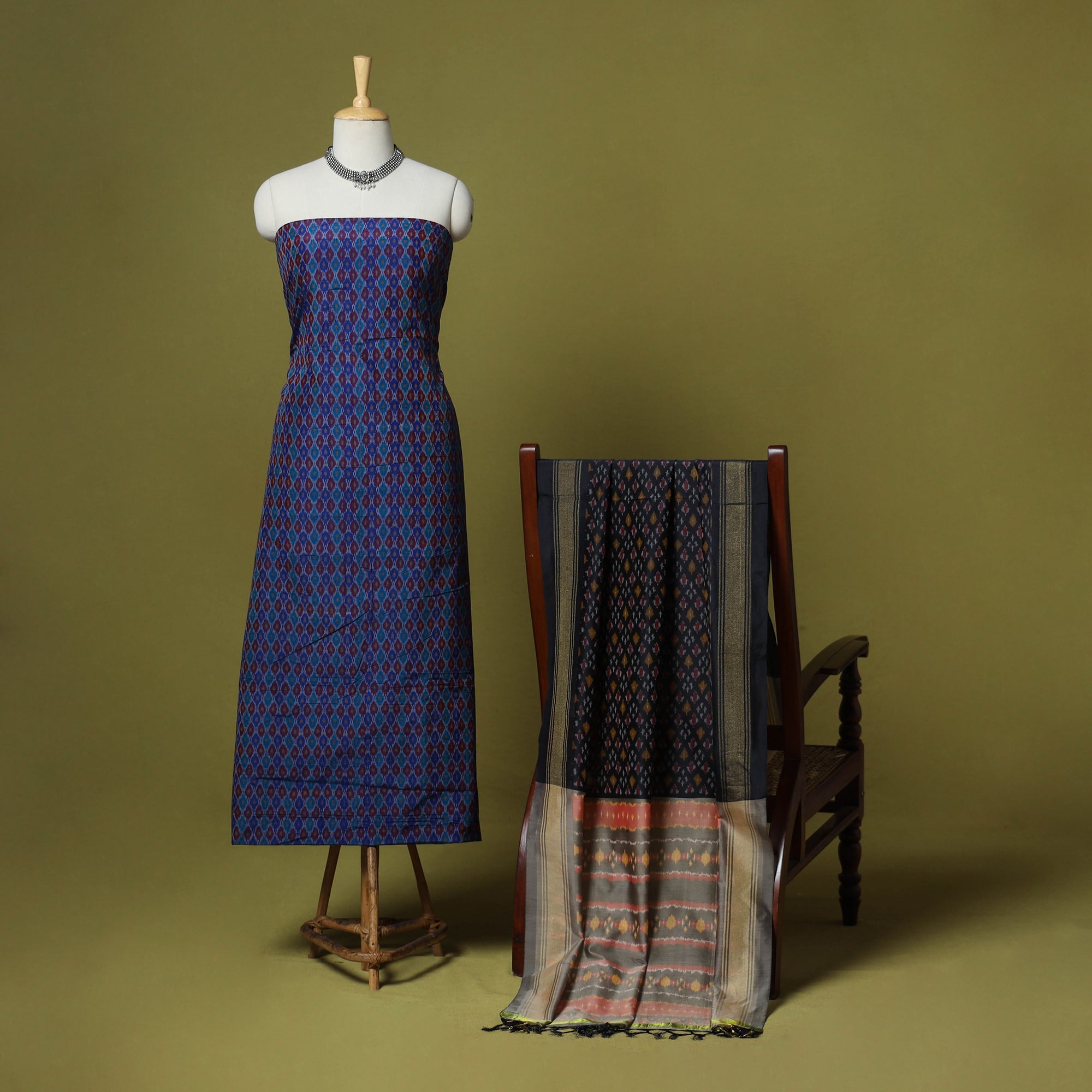 This blue 2pc unstitched sico silk-cotton pochampally Ikat dress material is handwoven by skilled weavers, where each thread is resist-dyed before weaving to form vibrant, intricate patterns. The set features a silk-cotton kurta fabric with a matching dupatta with a zari border and tassels. Blending silk’s sheen with cotton’s comfort, it drapes gracefully, making it ideal for creating elegant ethnic attire.