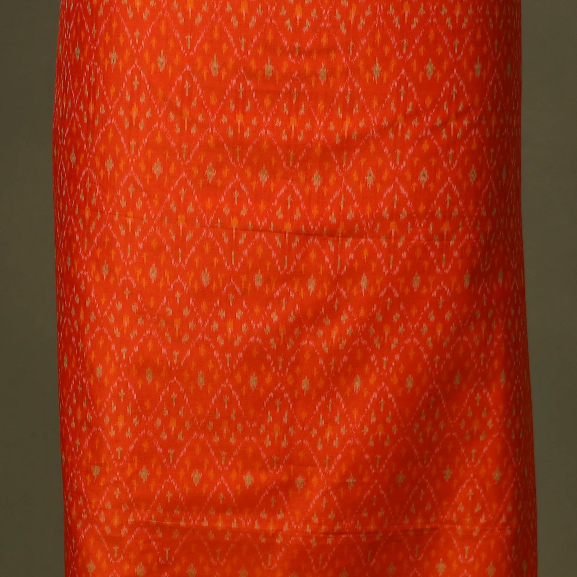 This orange 2pc unstitched sico silk cotton handloom pochampally Ikat dress material is woven by skilled weavers, with each thread resist-dyed before weaving to create vibrant, intricate patterns. The set includes a silk-cotton kurta fabric and a matching mulberry silk dupatta with zari border. Combining silk’s sheen with cotton’s comfort, it drapes beautifully, perfect for crafting graceful ethnic wear.
