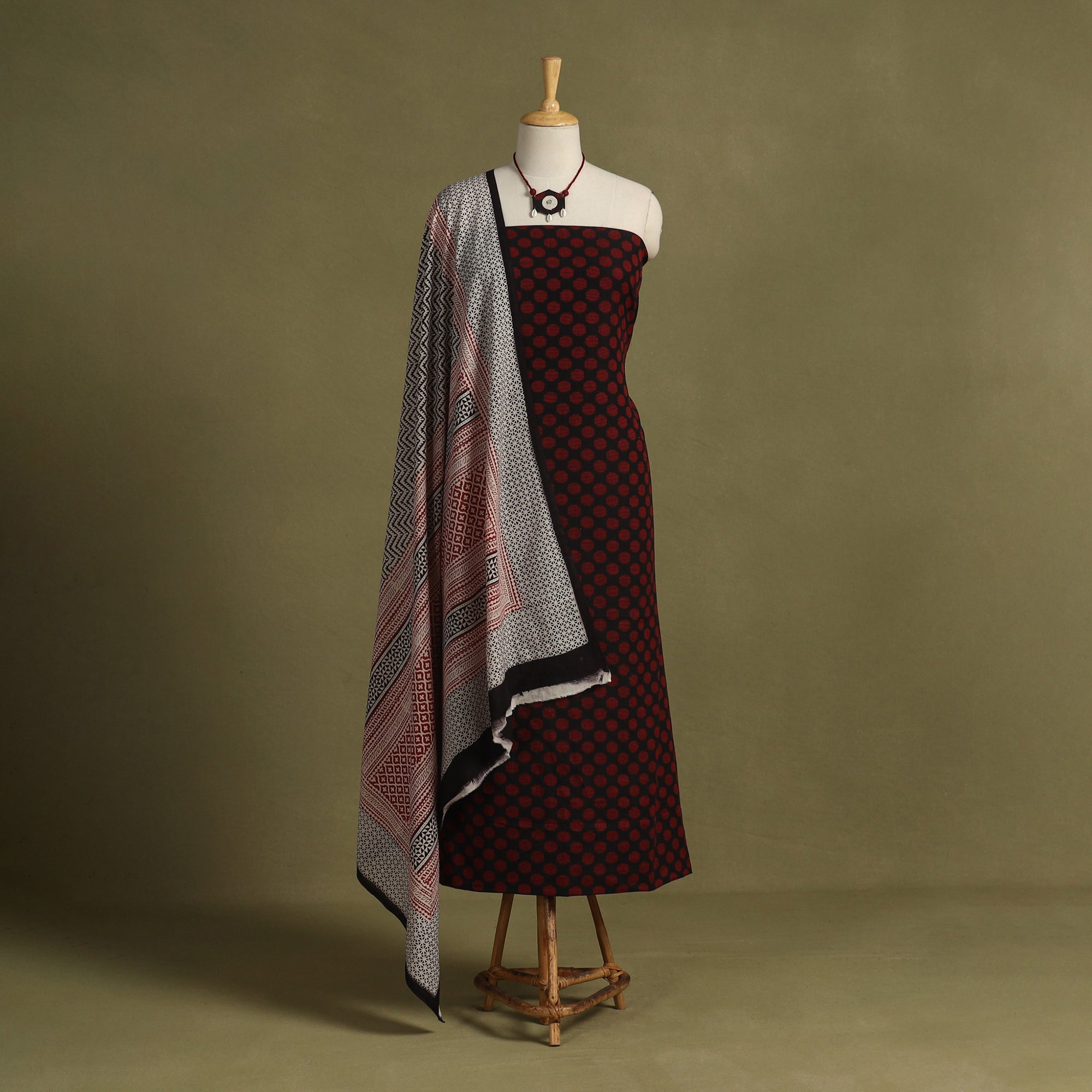 This black 2pc unstitched dress material set features a jacquard cotton kurta, paired with a bagh printed dupatta. The addition of bagh introduces another traditional craft to the ensemble, seamlessly blending two art forms in a refined aesthetic. Complemented by a matching necklace and earrings, this set offers a graceful ethnic appeal, ideal for festive wear or meaningful gifting.