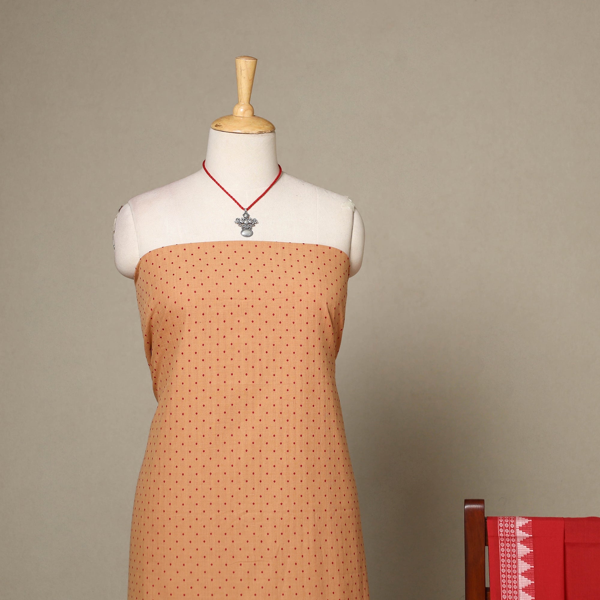 This beige 2pc cotton dress material set features a jacquard kurta paired with a sambalpuri ikat handloom dupatta. The dupatta showcases intricate motifs created through the traditional resist-dyeing method, reflecting the beauty of Odisha’s weaving heritage. The set also comes with a matching necklace and earrings, adding an elegant touch. Perfect for festive occasions, weddings, or graceful everyday wear.
