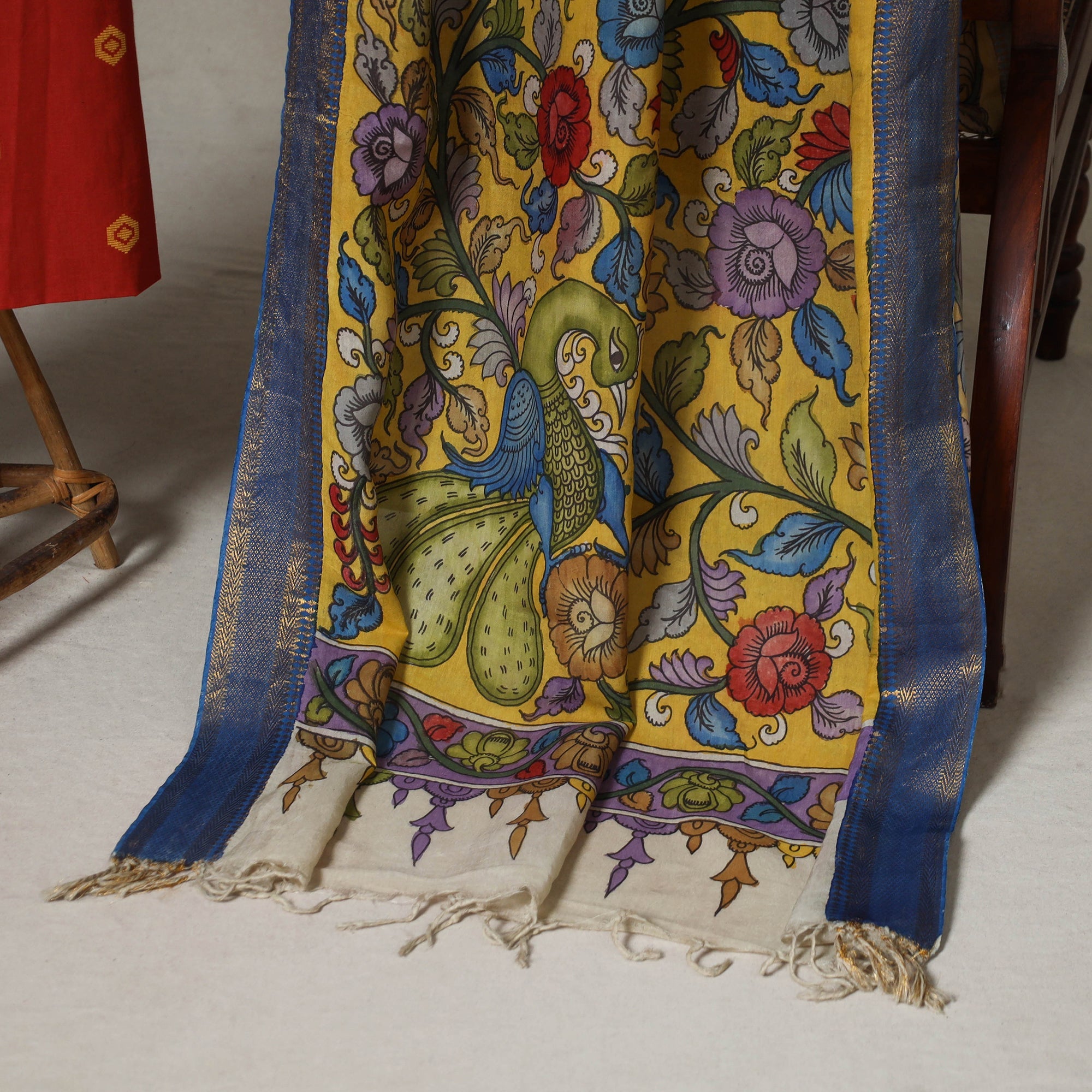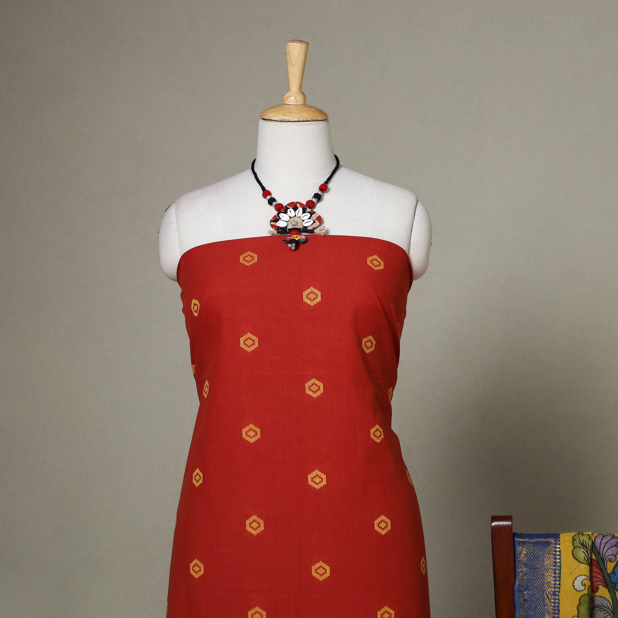 Add a touch of tradition and elegance to your wardrobe with this red 2pc jacquard cotton dress material set. It includes a beautifully woven jacquard kurta fabric, paired with a chanderi silk srikalahasti hand-painted pen kalamkari dupatta featuring a detailed border and tassels. The set also comes with a handcrafted necklace and matching earrings to complete your look. Perfect for festive gatherings, cultural events, or special occasions.