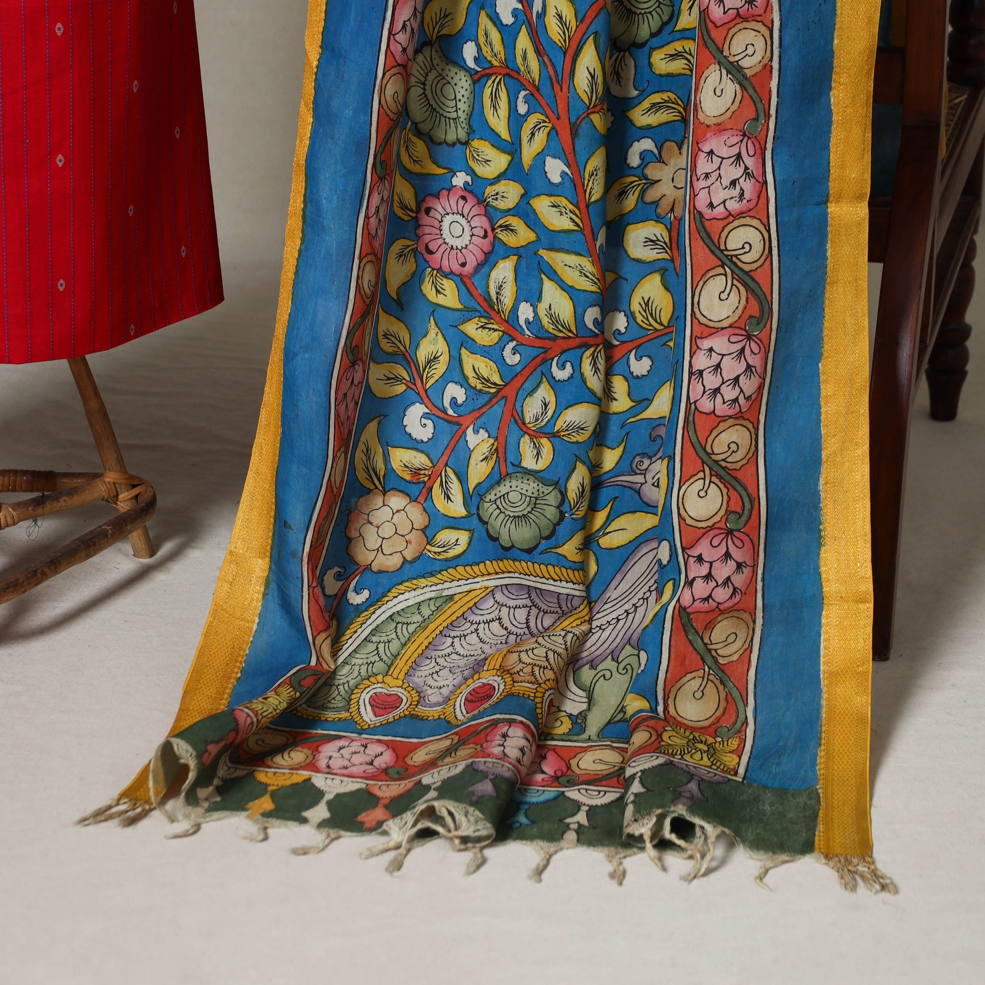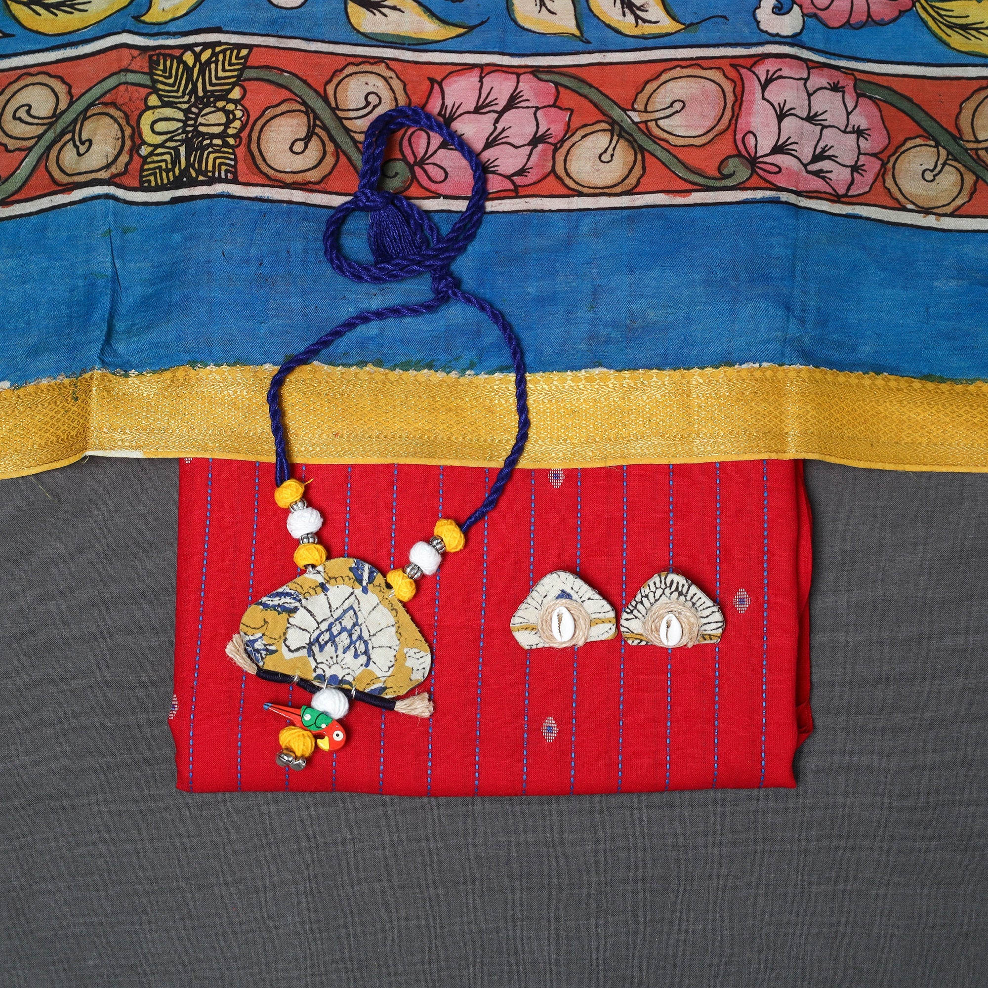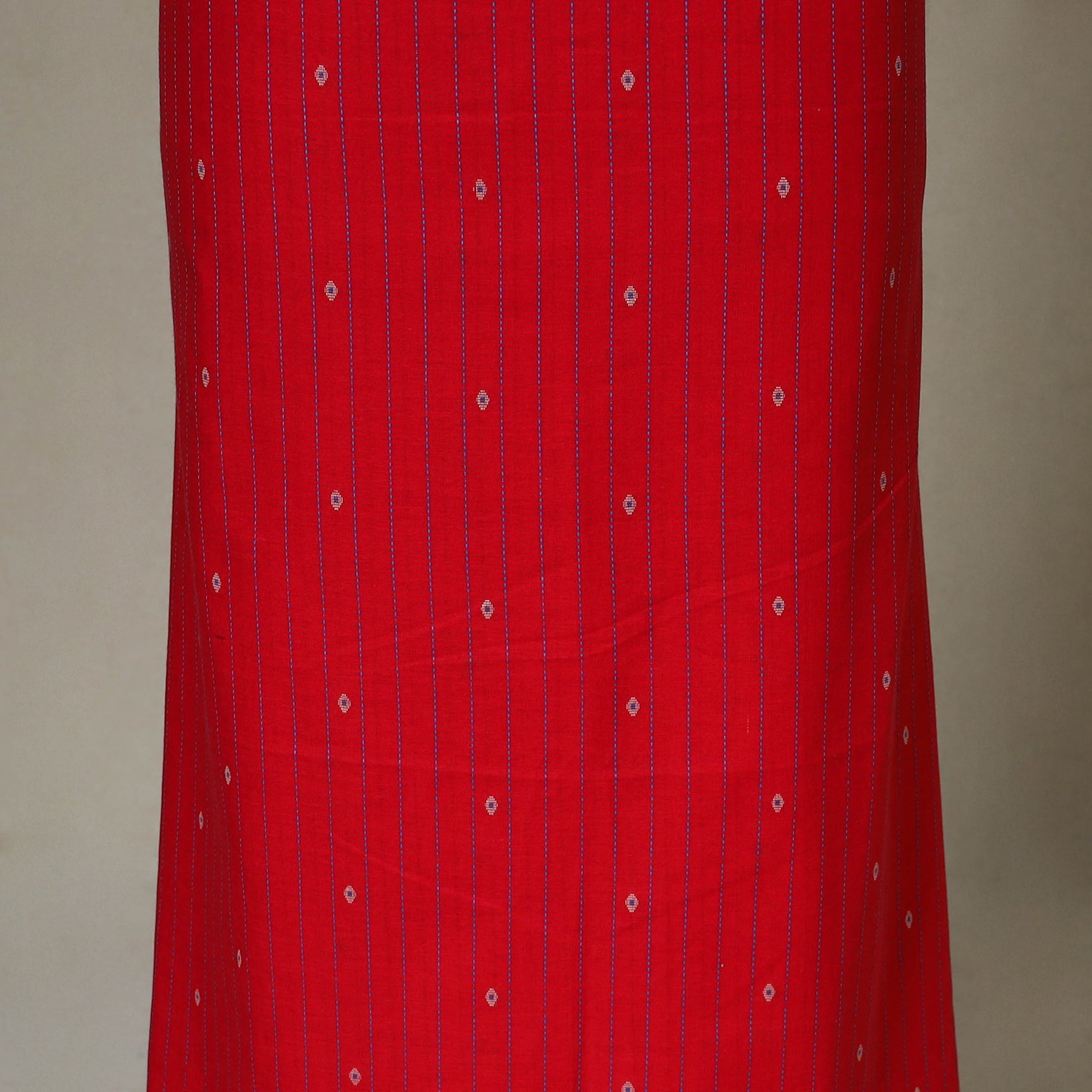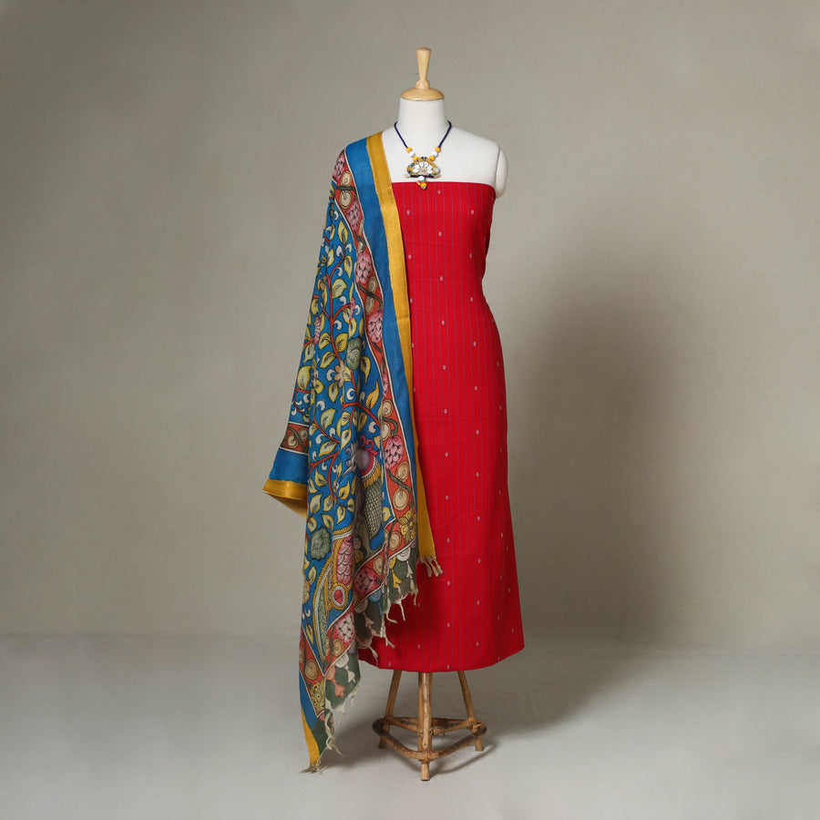 Add a touch of tradition and elegance to your wardrobe with this red 2pc jacquard cotton dress material set. It includes a beautifully woven jacquard kurta fabric, paired with a chanderi silk srikalahasti hand-painted pen kalamkari dupatta featuring a detailed border and tassels. The set also comes with a handcrafted necklace and matching earrings to complete your look. Perfect for festive gatherings, cultural events, or special occasions.