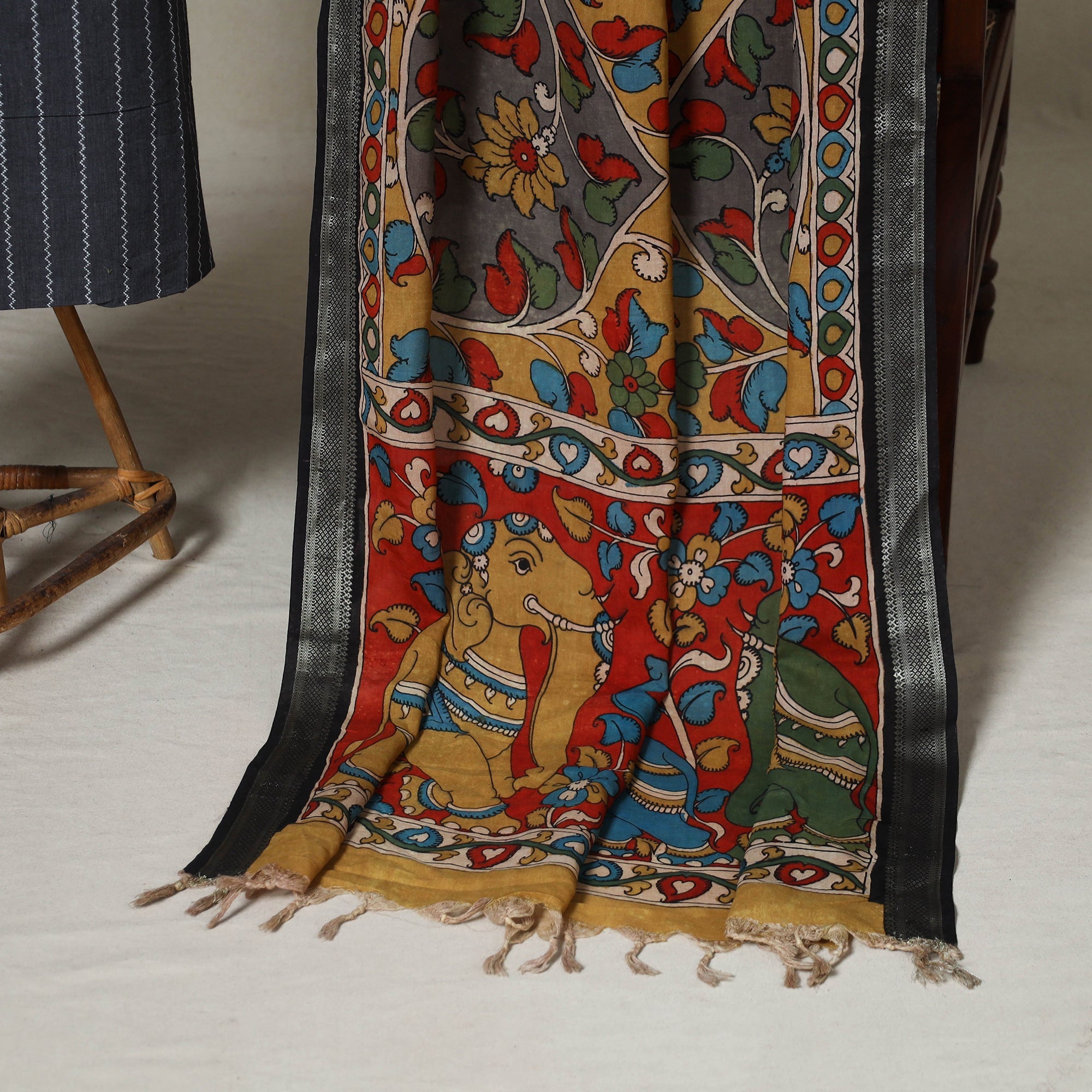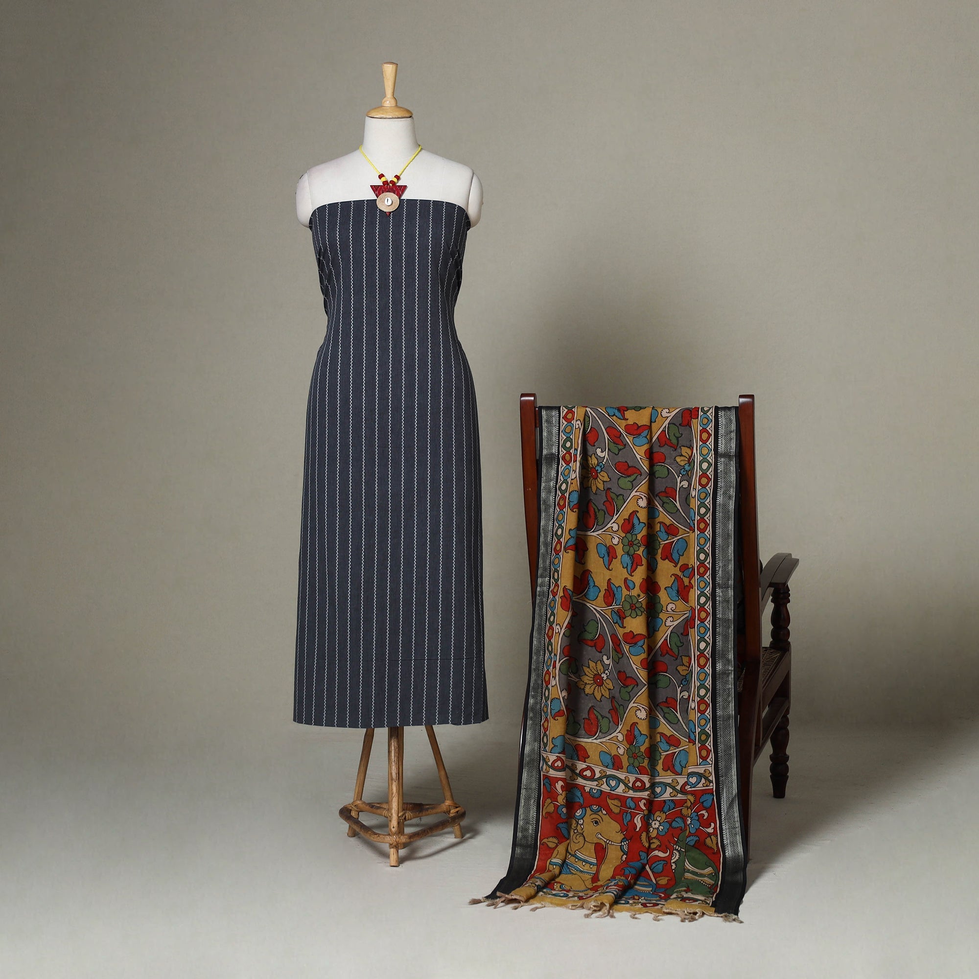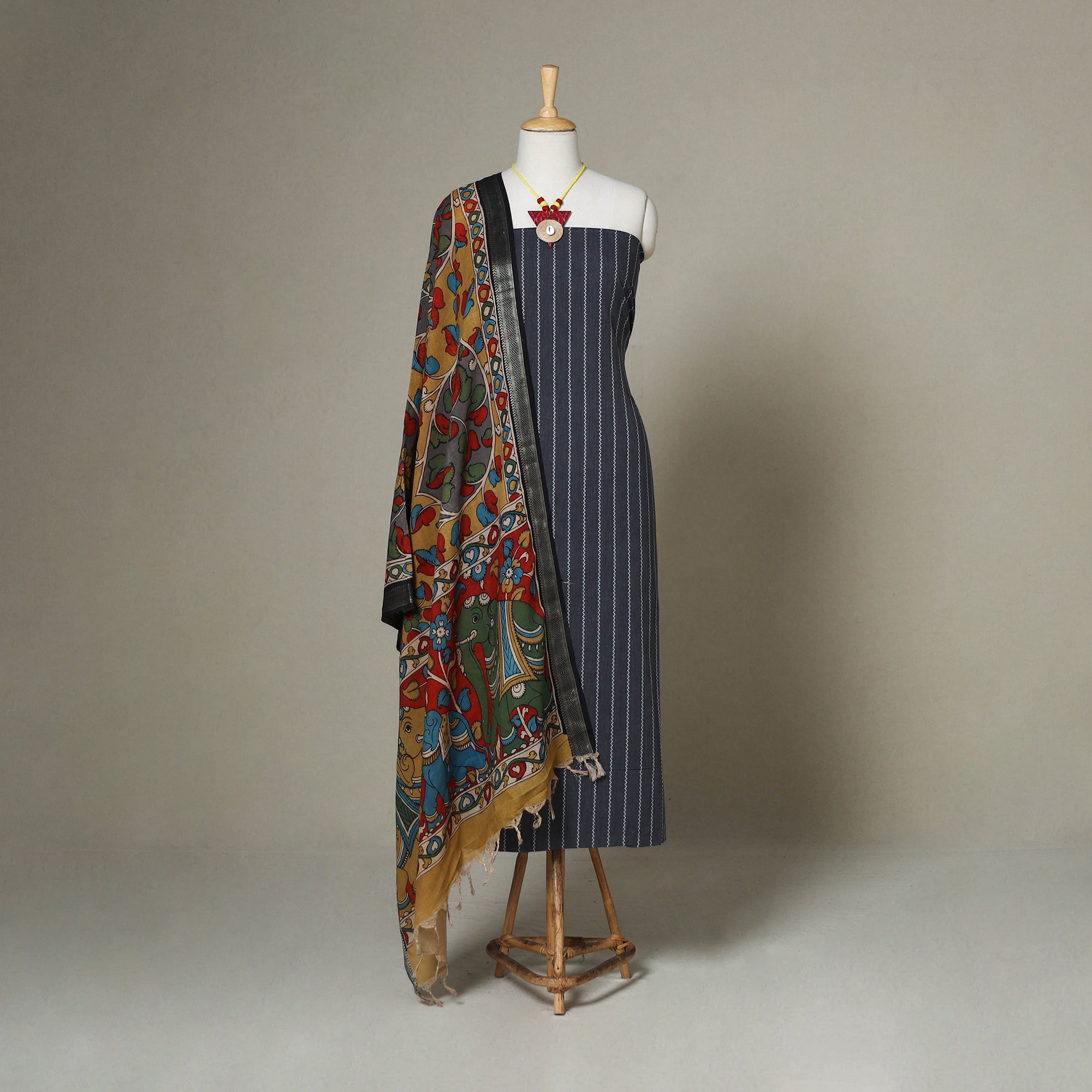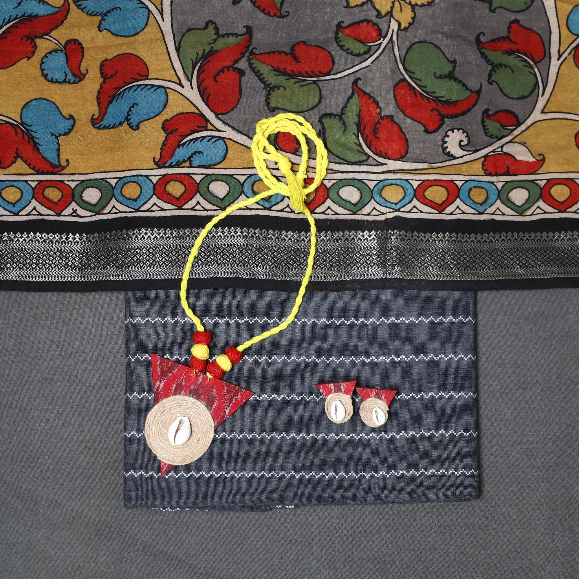 Add a touch of tradition and elegance to your wardrobe with this grey 2pc jacquard cotton dress material set. It includes a beautifully woven jacquard kurta fabric, paired with a chanderi silk srikalahasti hand-painted pen kalamkari dupatta featuring a detailed border and tassels. The set also comes with a handcrafted necklace and matching earrings to complete your look. Perfect for festive gatherings, cultural events, or special occasions.