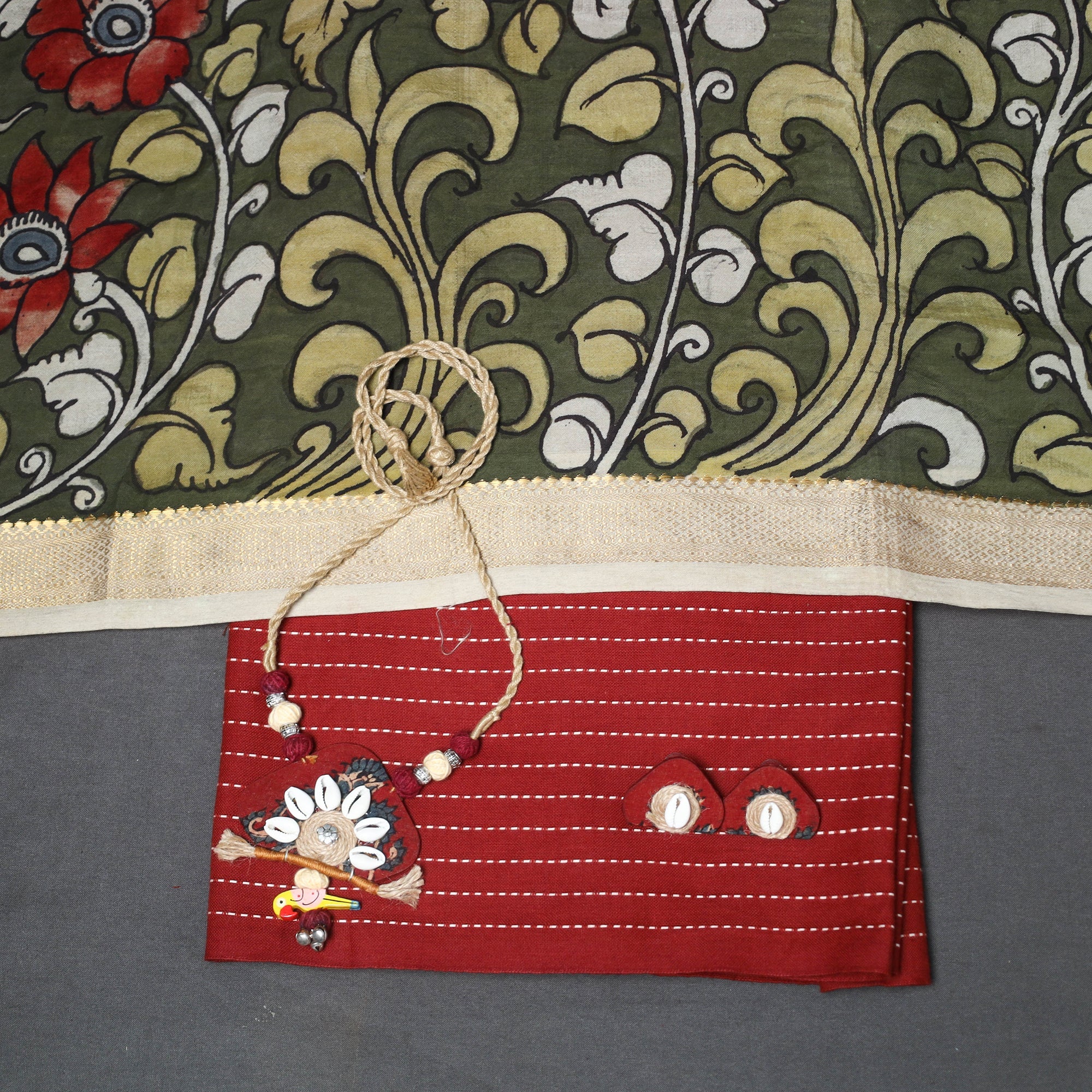 Add a touch of tradition and elegance to your wardrobe with this maroon 2pc jacquard cotton dress material set. It includes a beautifully woven jacquard kurta fabric, paired with a chanderi silk srikalahasti hand-painted pen kalamkari dupatta featuring a detailed border and tassels. The set also comes with a handcrafted necklace and matching earrings to complete your look. Perfect for festive gatherings, cultural events, or special occasions.