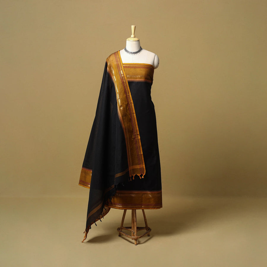 Black 2pc kandangi chettinad dress material set from Tamil Nadu is known for its traditional weaving techniques, contrasting borders, and a checkered or striped body. The set includes a kurta fabric with a woven border, paired with a matching dupatta. Made from cotton, the set feels breathable and is suitable for daily wear, office use or even festive dressing.