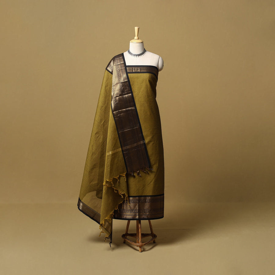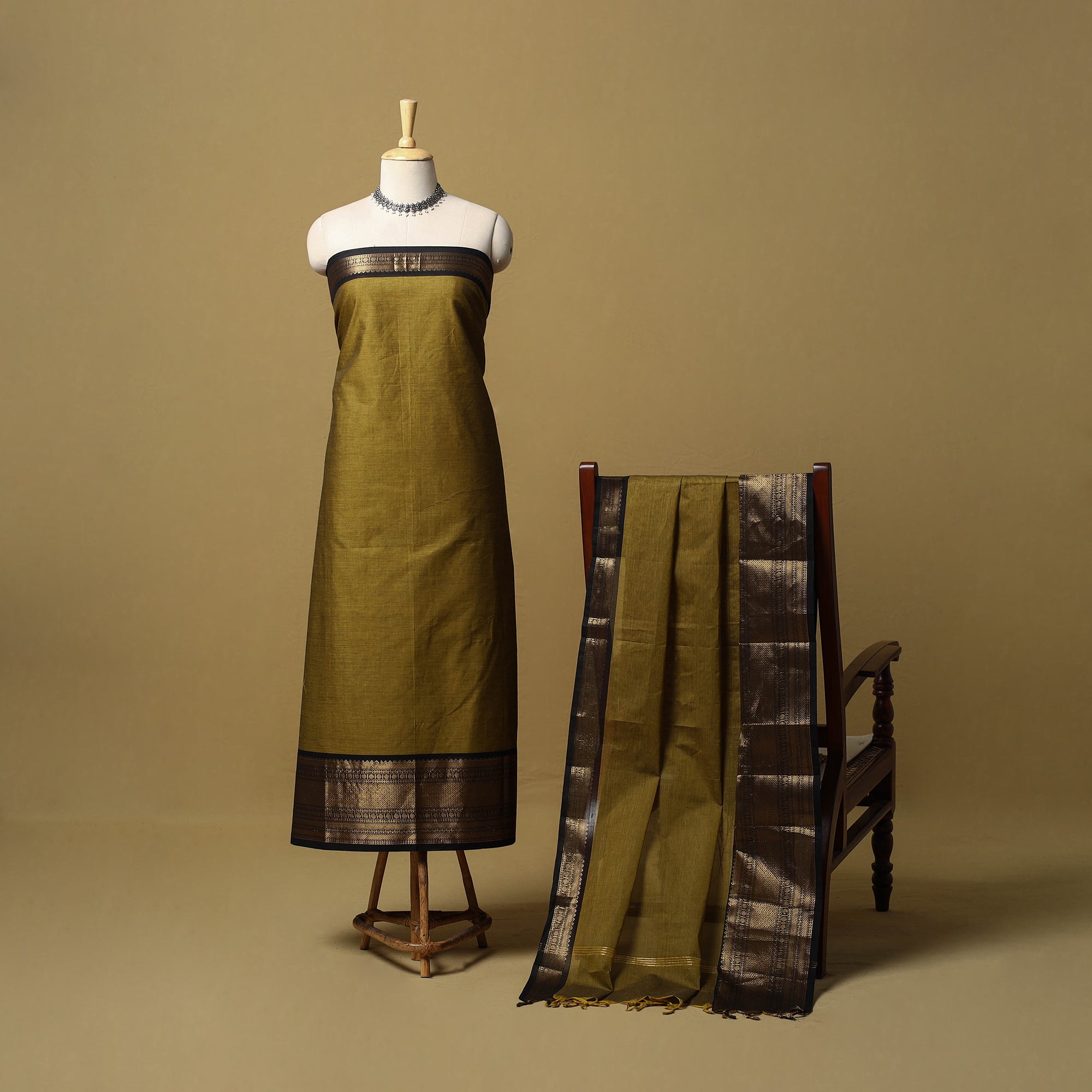 Yellow 2pc kandangi chettinad dress material set from Tamil Nadu is known for its traditional weaving techniques, contrasting borders, and a checkered or striped body. The set includes a kurta fabric with a woven border, paired with a matching dupatta. Made from cotton, the set feels breathable and is suitable for daily wear, office use or even festive dressing.
