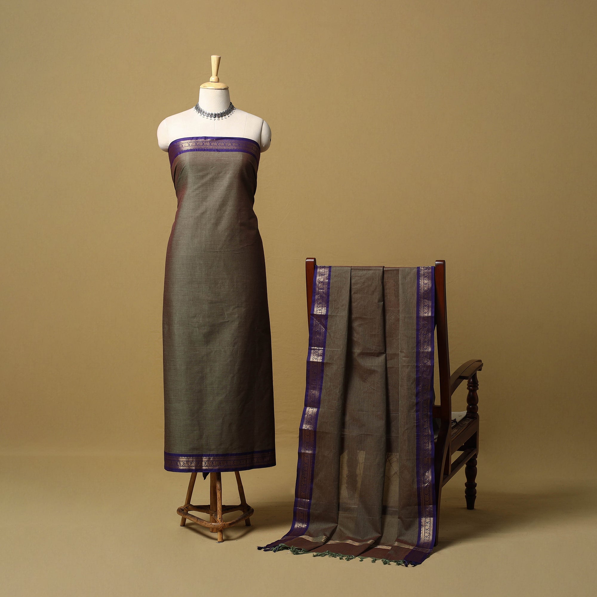 Green 2pc kandangi chettinad dress material set from Tamil Nadu is known for its traditional weaving techniques, contrasting borders, and a checkered or striped body. The set includes a kurta fabric with a woven border, paired with a matching dupatta. Made from cotton, the set feels breathable and is suitable for daily wear, office use or even festive dressing.