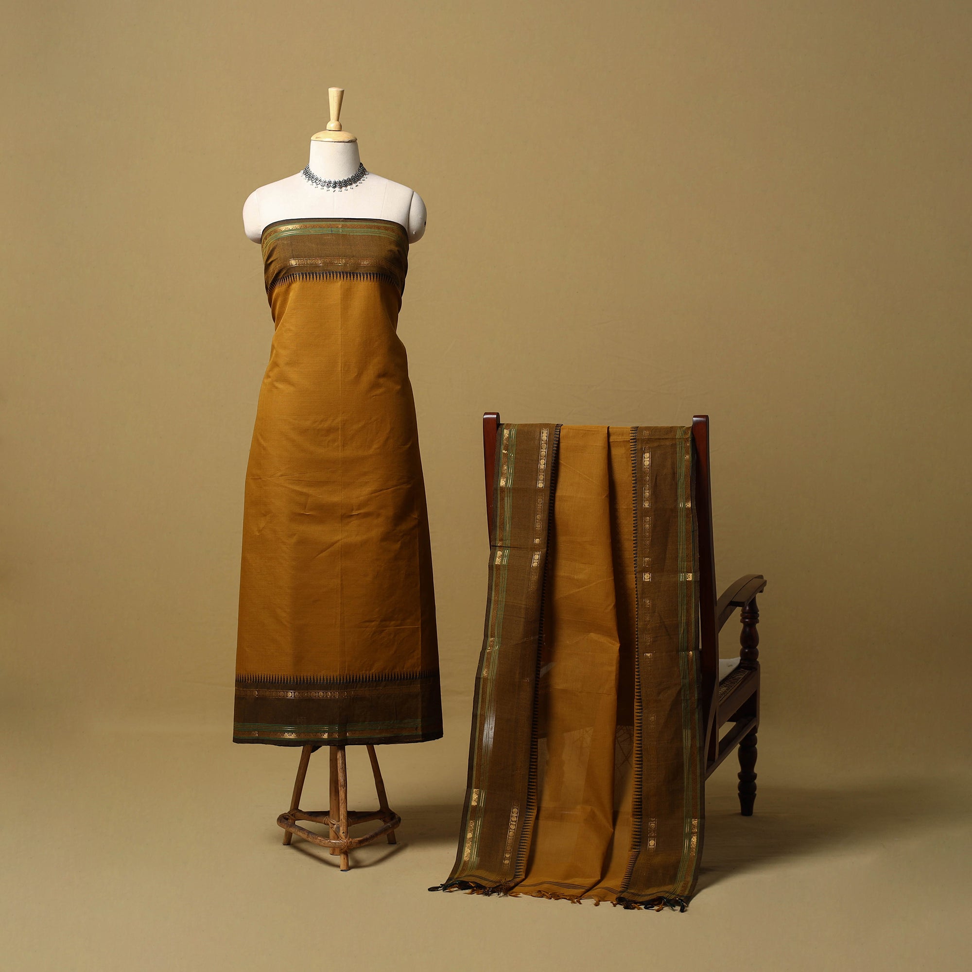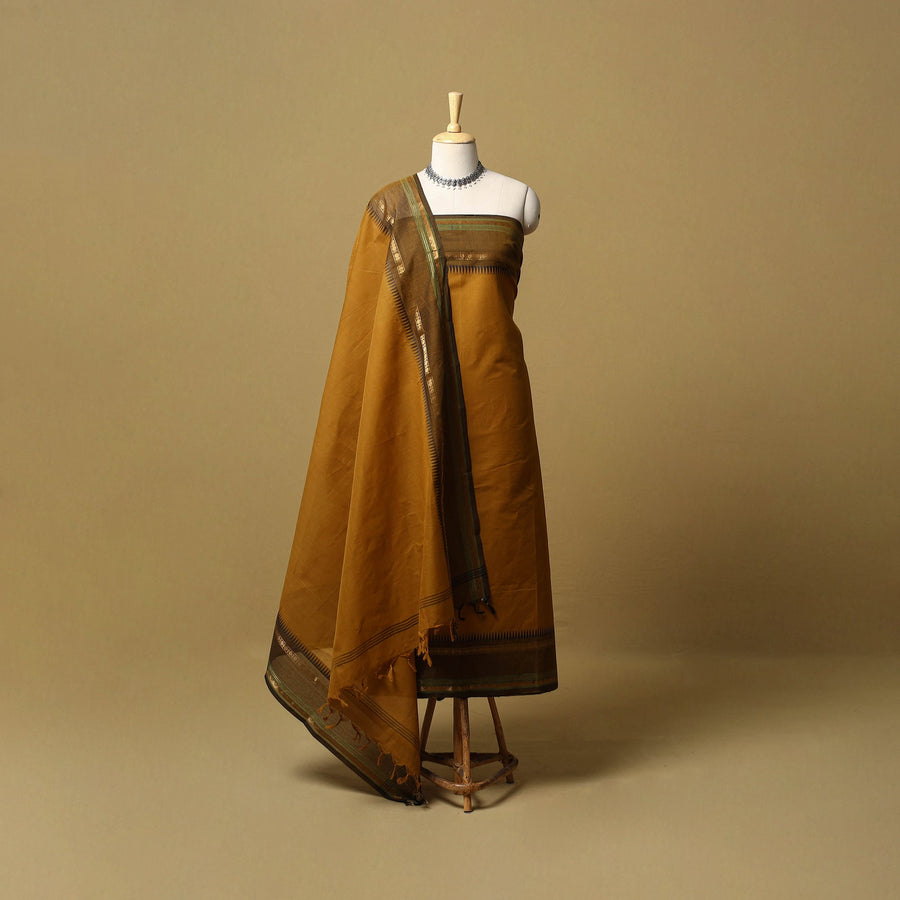 Yellow 2pc kandangi chettinad dress material set from Tamil Nadu is known for its traditional weaving techniques, contrasting borders, and a checkered or striped body. The set includes a kurta fabric with a woven border, paired with a matching dupatta. Made from cotton, the set feels breathable and is suitable for daily wear, office use or even festive dressing.