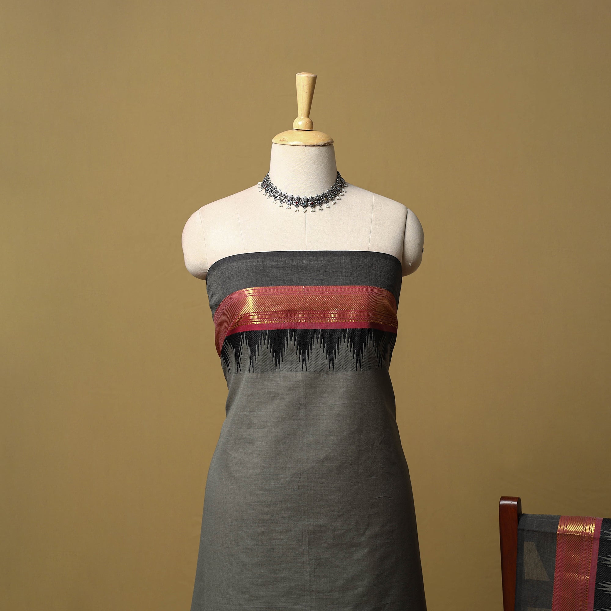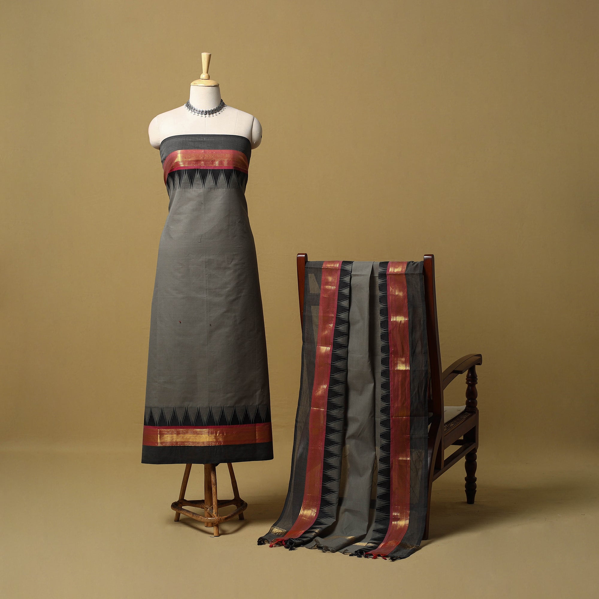 Grey 2pc kandangi chettinad dress material set from Tamil Nadu is known for its traditional weaving techniques, contrasting borders, and a checkered or striped body. The set includes a kurta fabric with a woven border, paired with a matching dupatta. Made from cotton, the set feels breathable and is suitable for daily wear, office use or even festive dressing.