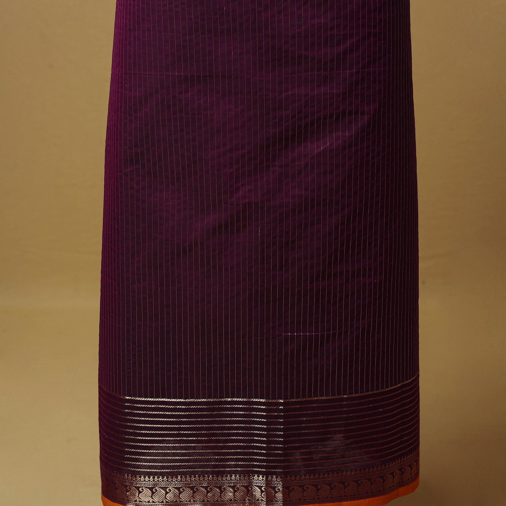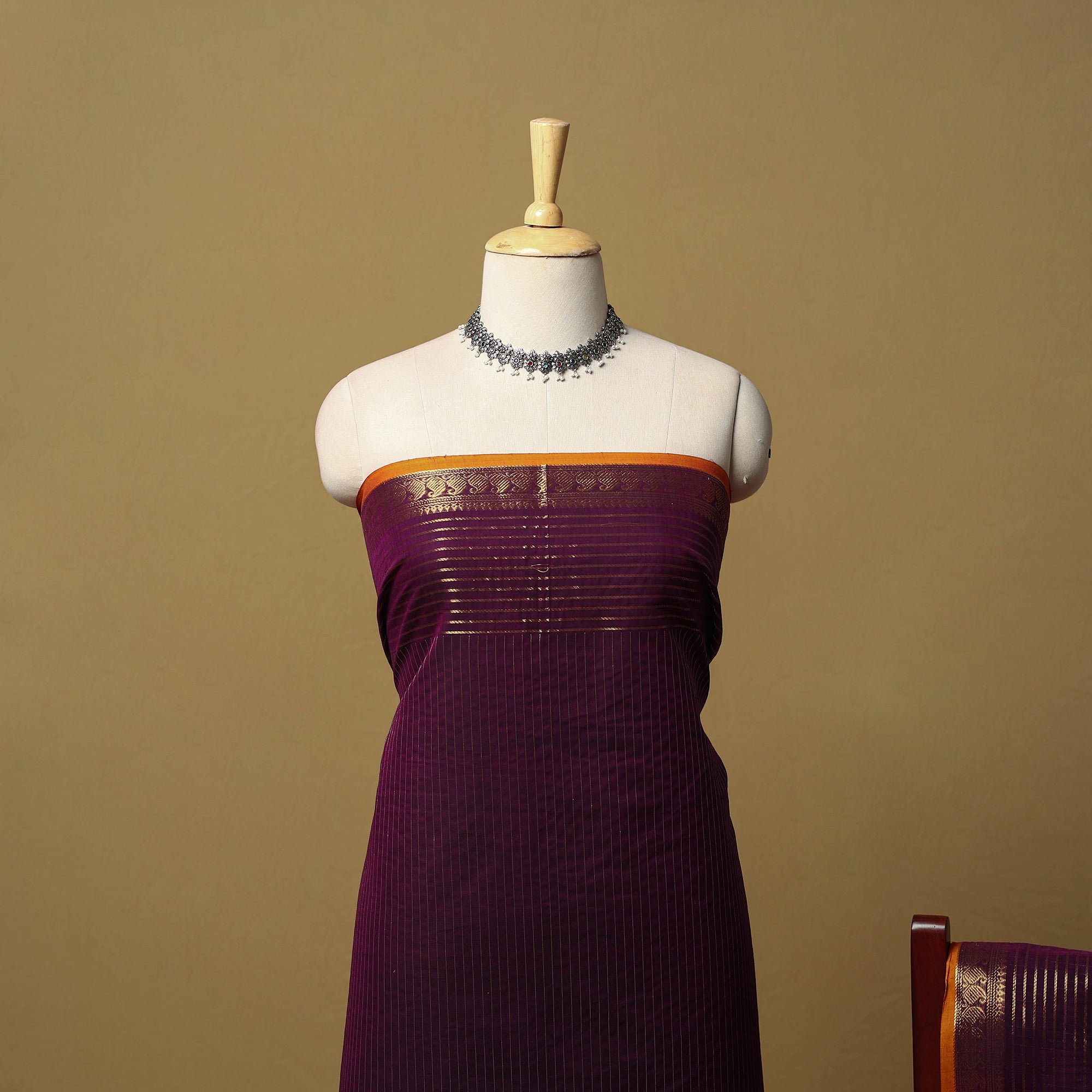 Purple 2pc kandangi chettinad dress material set from Tamil Nadu is known for its traditional weaving techniques, contrasting borders, and a checkered or striped body. The set includes a kurta fabric with a woven border, paired with a matching dupatta. Made from cotton, the set feels breathable and is suitable for daily wear, office use or even festive dressing.