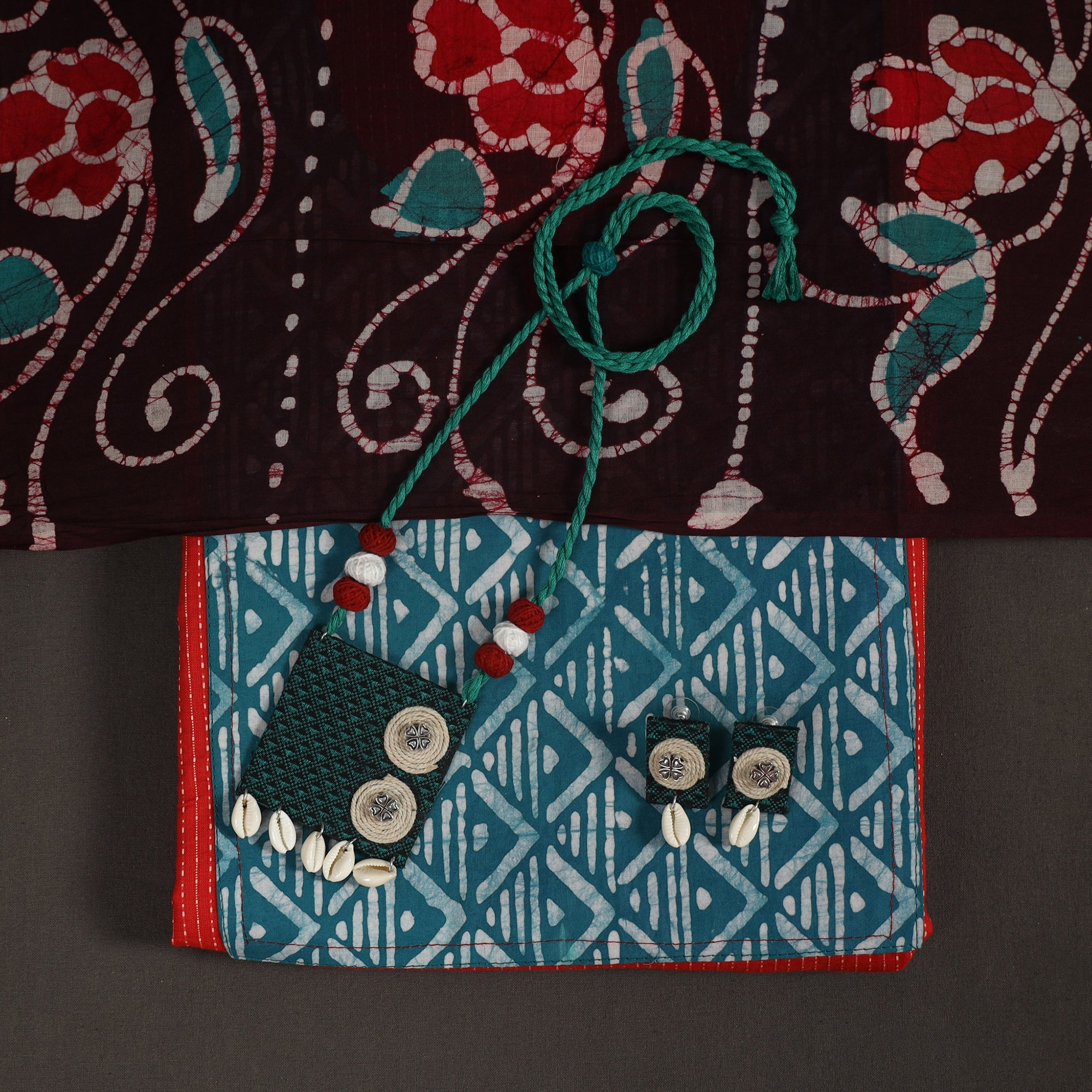 This red 2pc unstitched dress material set features a plain cotton kurta enhanced with neat running stitches and patchwork accents, lending it a handcrafted charm. It is paired with a batik dupatta. The addition of batik brings a second traditional craft into the ensemble, beautifully blending two art forms in one elegant look. Complemented by a matching necklace and earrings, this set offers a graceful ethnic appearance perfect for festive moments or thoughtful gifting.