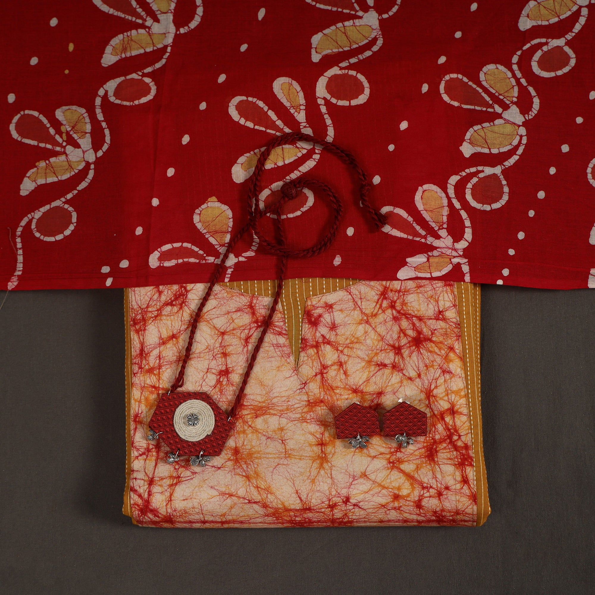 This yellow 2pc unstitched dress material set features a plain cotton kurta enhanced with neat running stitches and patchwork accents, lending it a handcrafted charm. It is paired with a batik dupatta. The addition of batik brings a second traditional craft into the ensemble, beautifully blending two art forms in one elegant look. Complemented by a matching necklace and earrings, this set offers a graceful ethnic appearance perfect for festive moments or thoughtful gifting.yellow