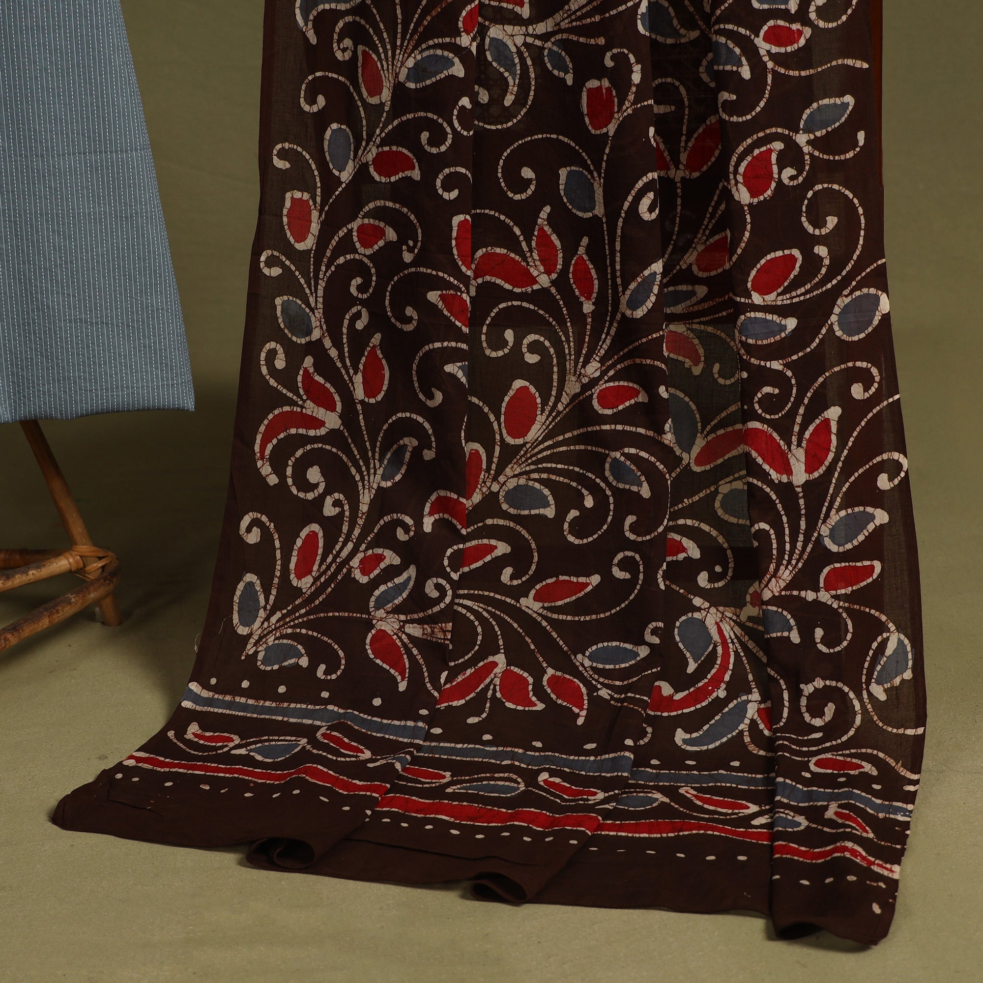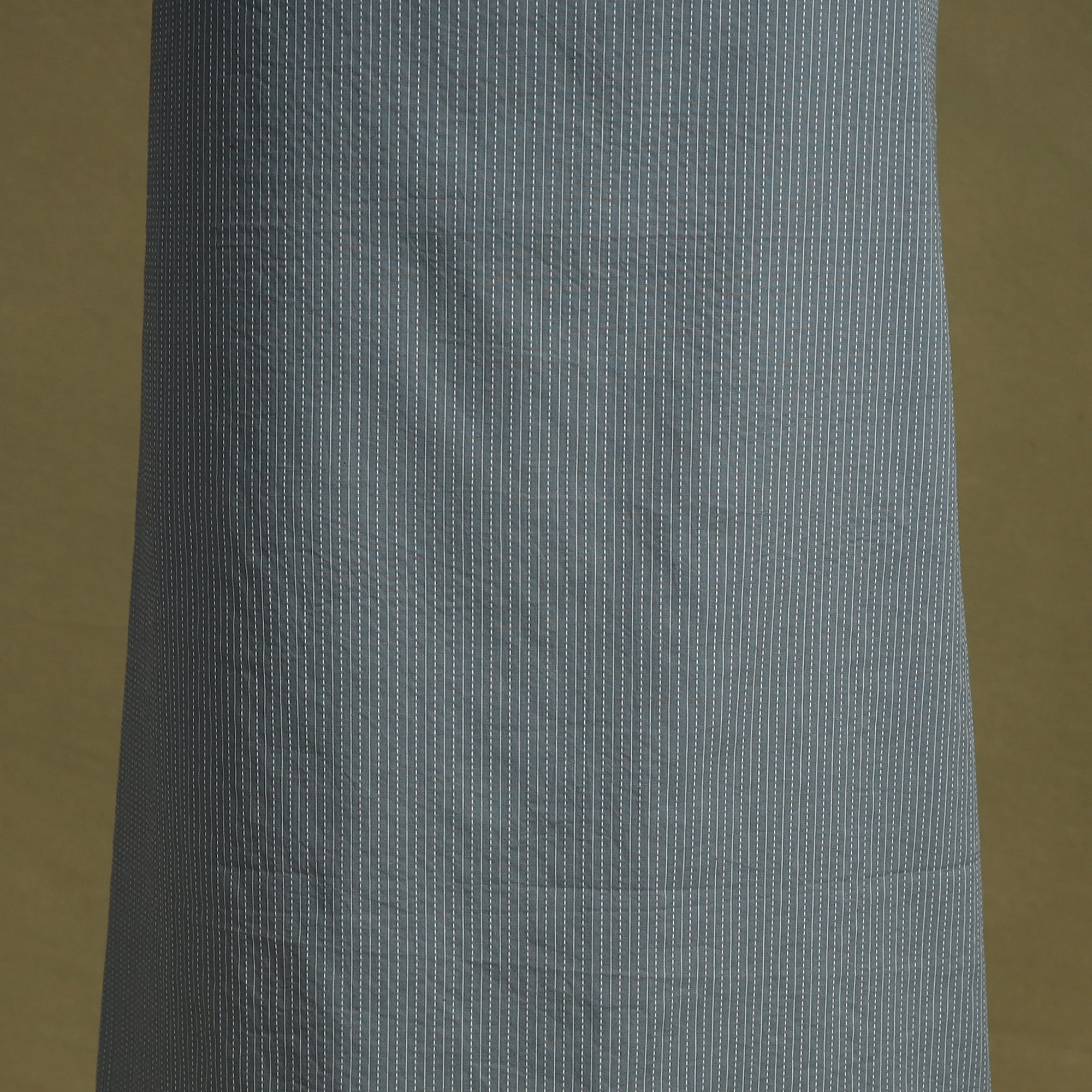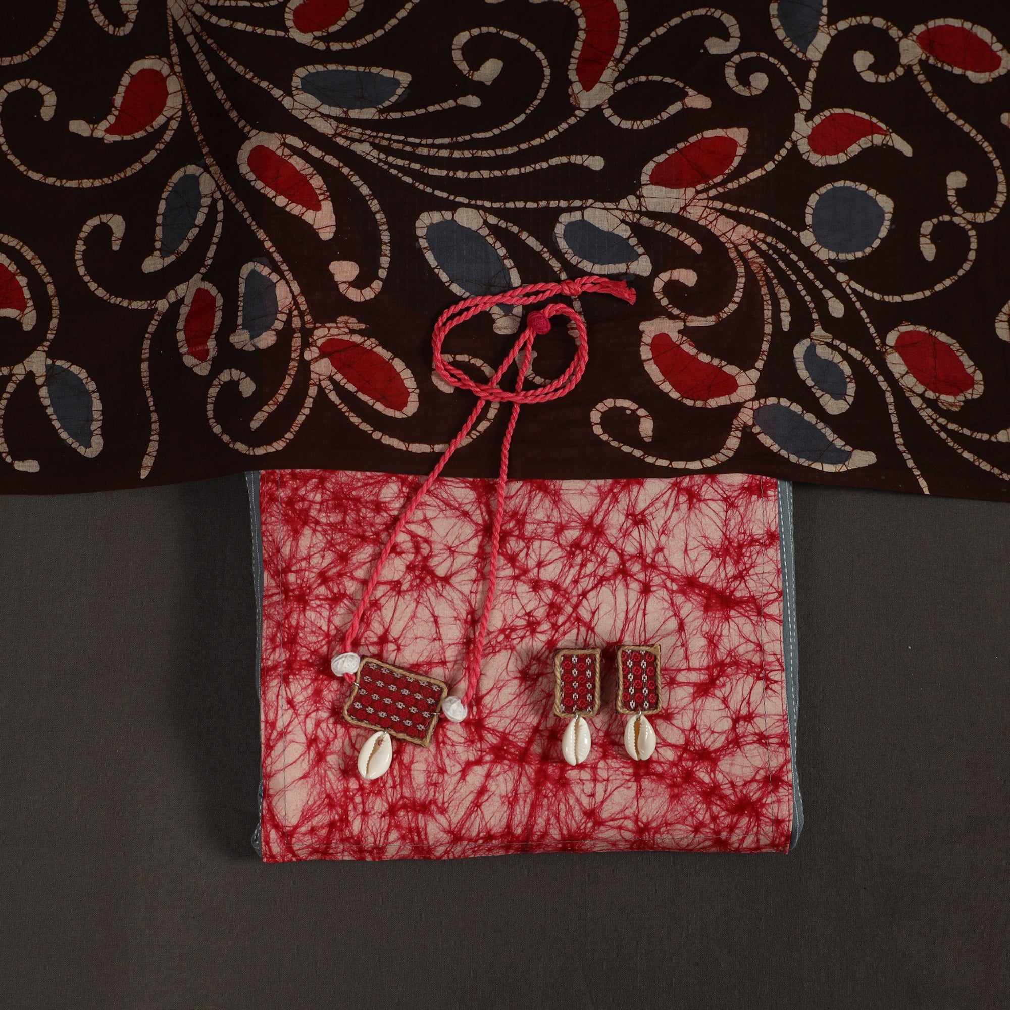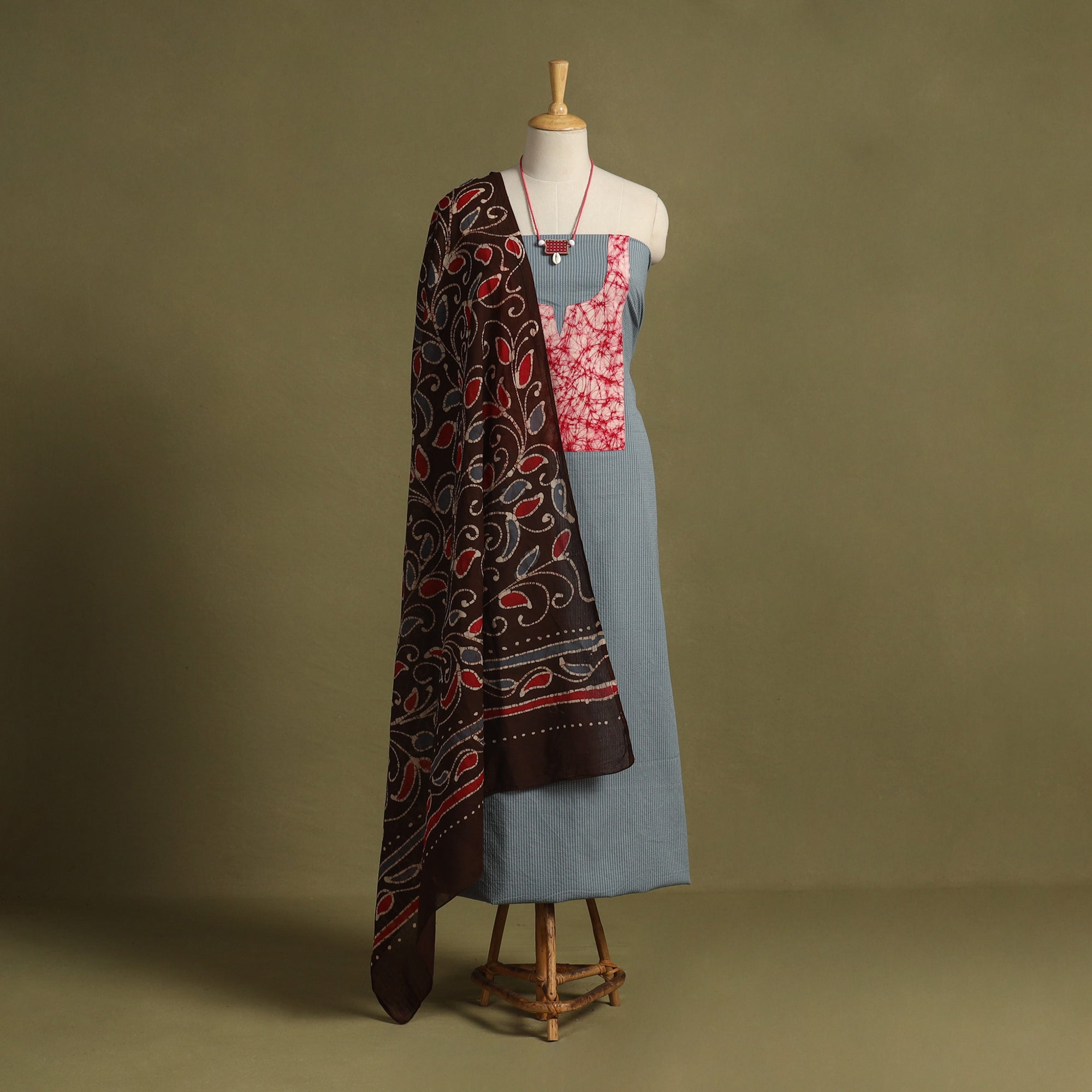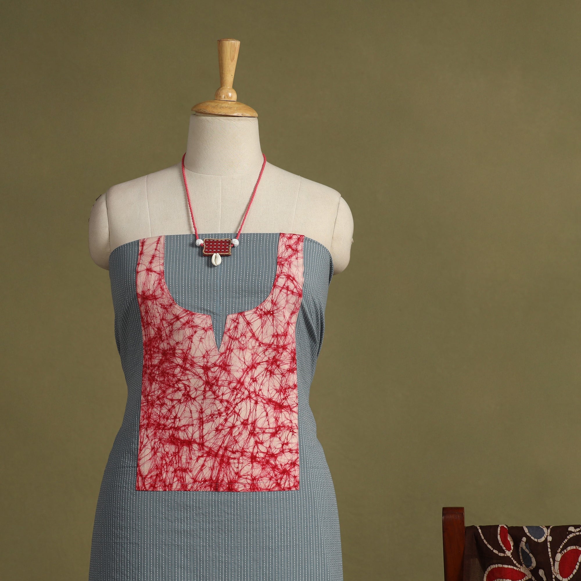 This grey 2pc unstitched dress material set features a plain cotton kurta enhanced with neat running stitches and patchwork accents, lending it a handcrafted charm. It is paired with a batik dupatta. The addition of batik brings a second traditional craft into the ensemble, beautifully blending two art forms in one elegant look. Complemented by a matching necklace and earrings, this set offers a graceful ethnic appearance perfect for festive moments or thoughtful gifting.