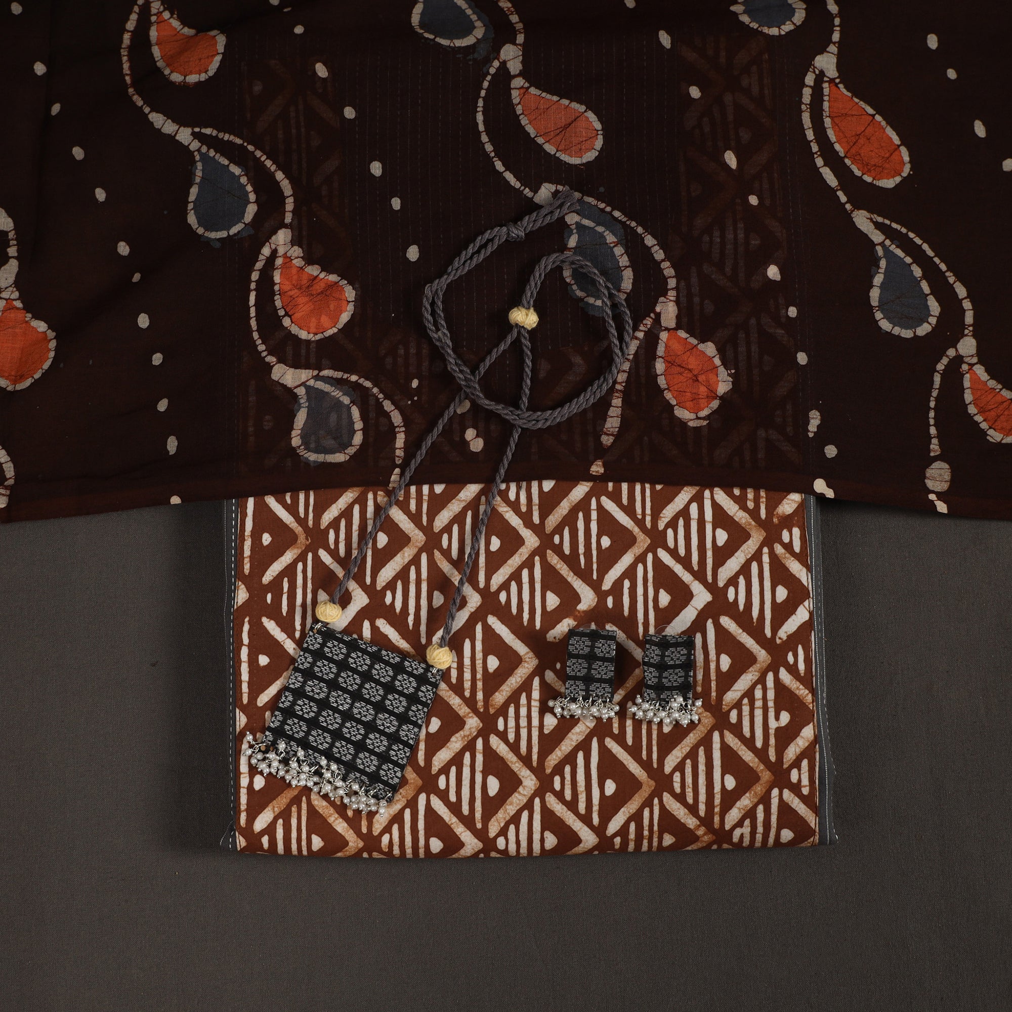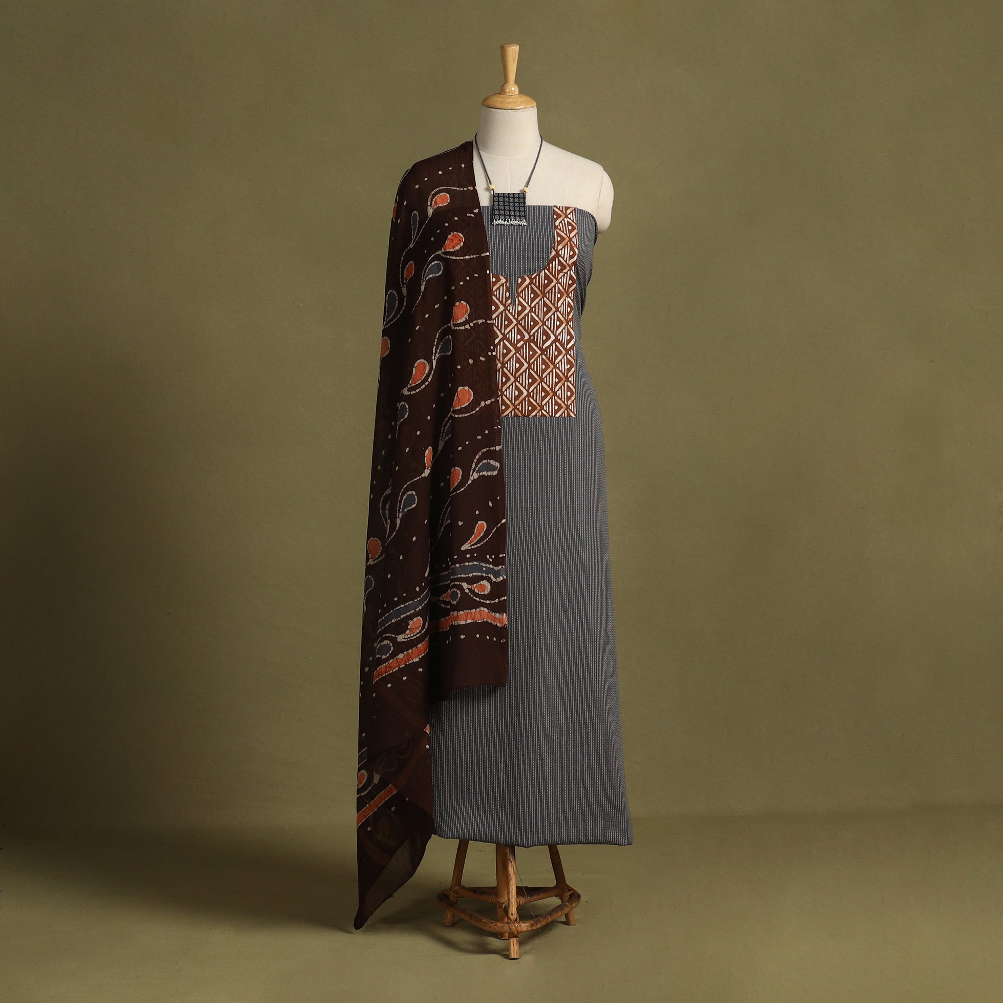 This grey 2pc unstitched dress material set features a plain cotton kurta enhanced with neat running stitches and patchwork accents, lending it a handcrafted charm. It is paired with a batik dupatta. The addition of batik brings a second traditional craft into the ensemble, beautifully blending two art forms in one elegant look. Complemented by a matching necklace and earrings, this set offers a graceful ethnic appearance perfect for festive moments or thoughtful gifting.
