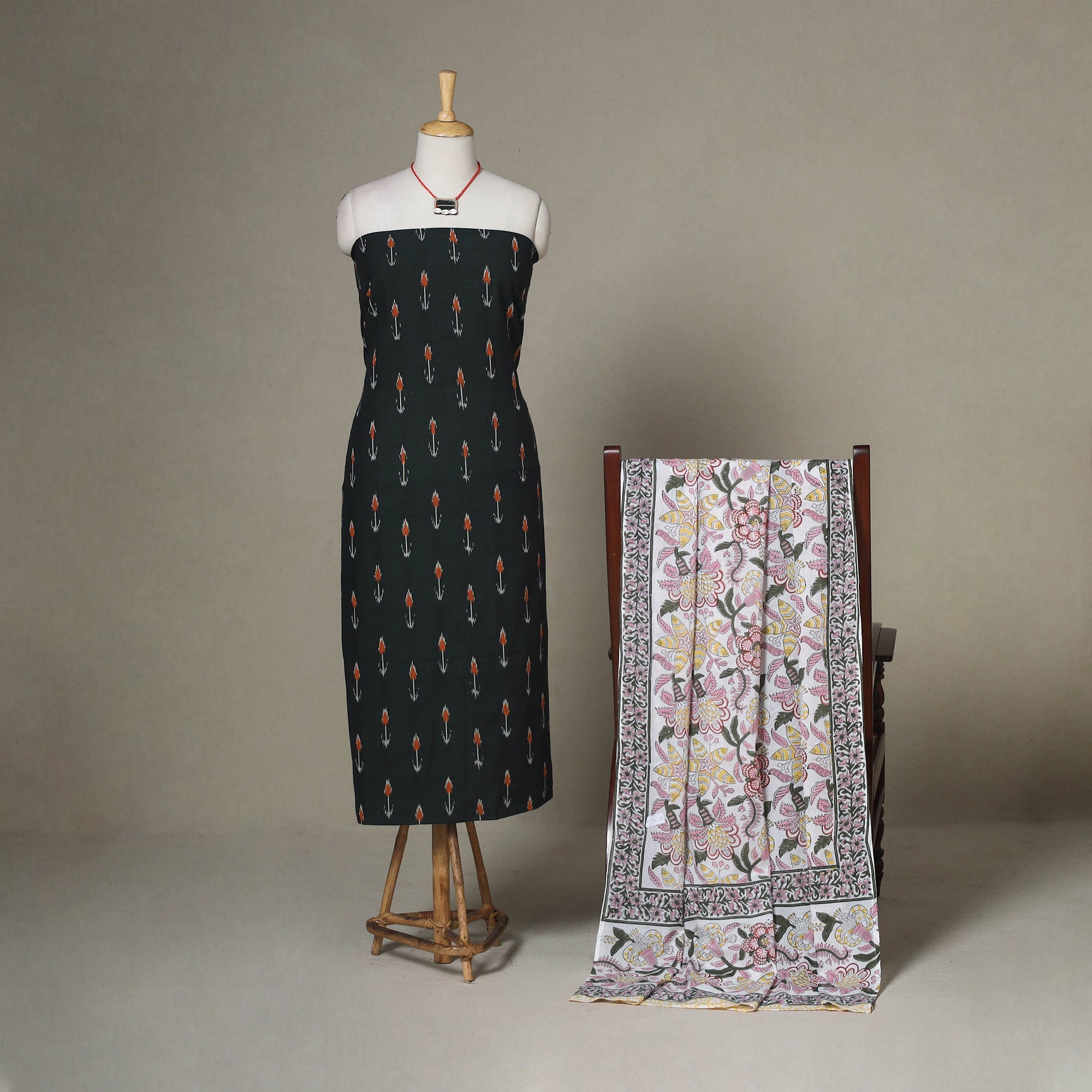 This black 2pc pochampally Ikat cotton kurta paired with a sanganeri block print cotton dupatta is crafted to blend festive elegance with everyday ease. Accentuated by matching necklace and earrings, it brings a refined ethnic appeal to any setting. Ideal for both daily wear and thoughtful gifting, it gracefully bridges tradition and contemporary style.