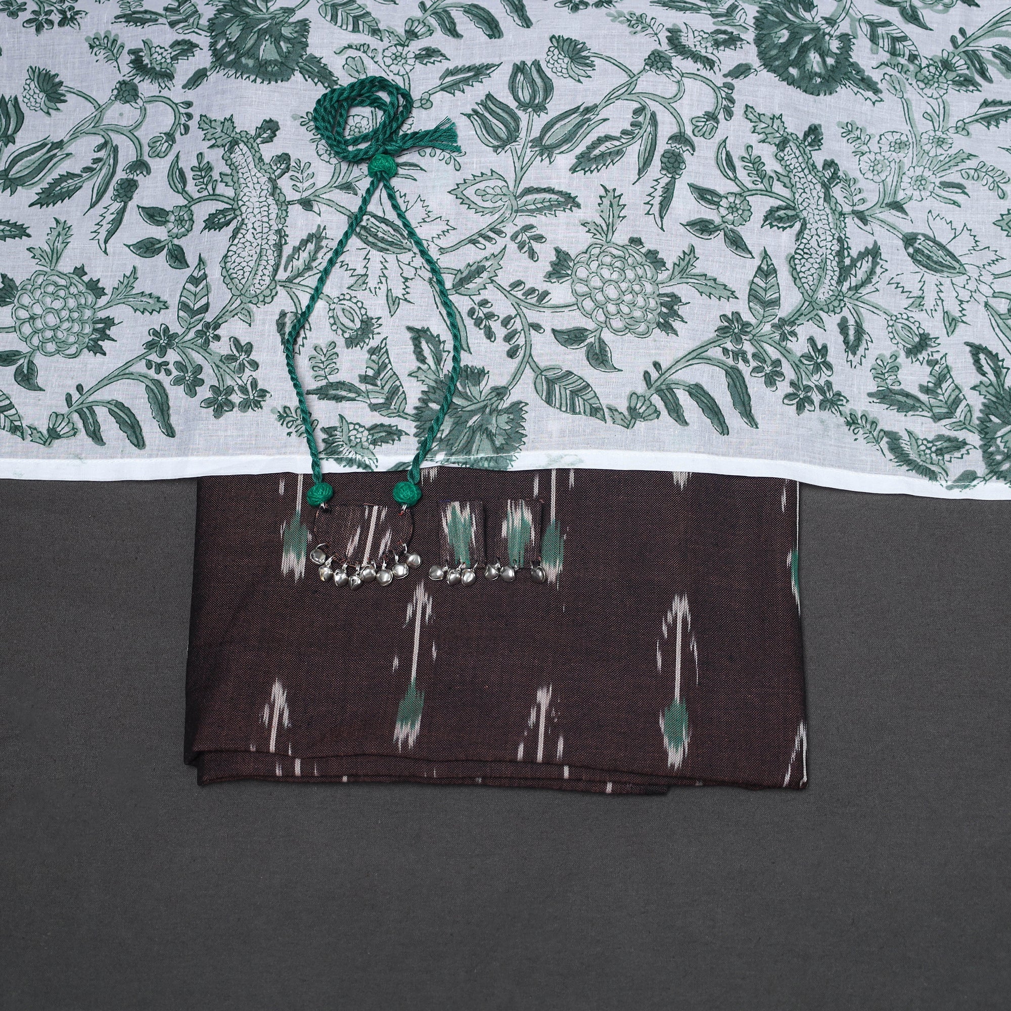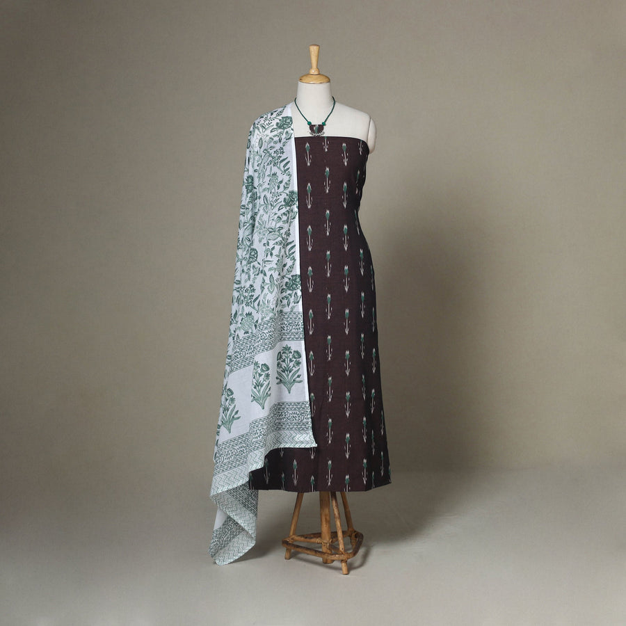 This brown 2pc pochampally Ikat cotton kurta paired with a sanganeri block print cotton dupatta is crafted to blend festive elegance with everyday ease. Accentuated by matching necklace and earrings, it brings a refined ethnic appeal to any setting. Ideal for both daily wear and thoughtful gifting, it gracefully bridges tradition and contemporary style.