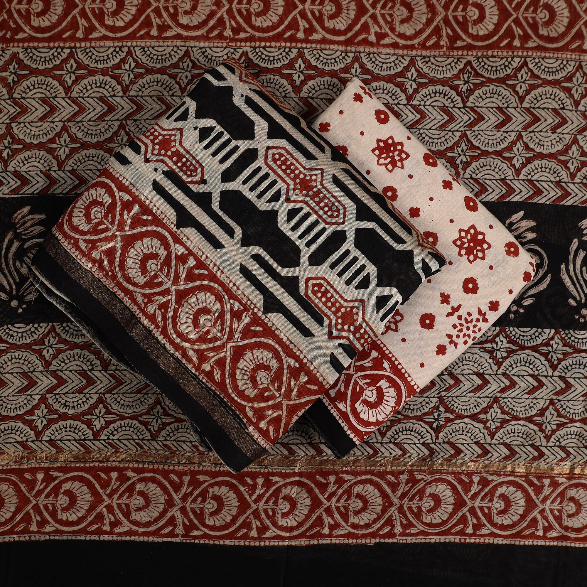 Discover the timeless beauty of 3pc bagru print chanderi silk cotton dress material. Made using natural dyes through traditional mud resist process by using hand carved wooden block practiced in Bagru, Rajasthan. This set includes a cotton bottom material. Perfect for crafting elegant, sustainable outfits.