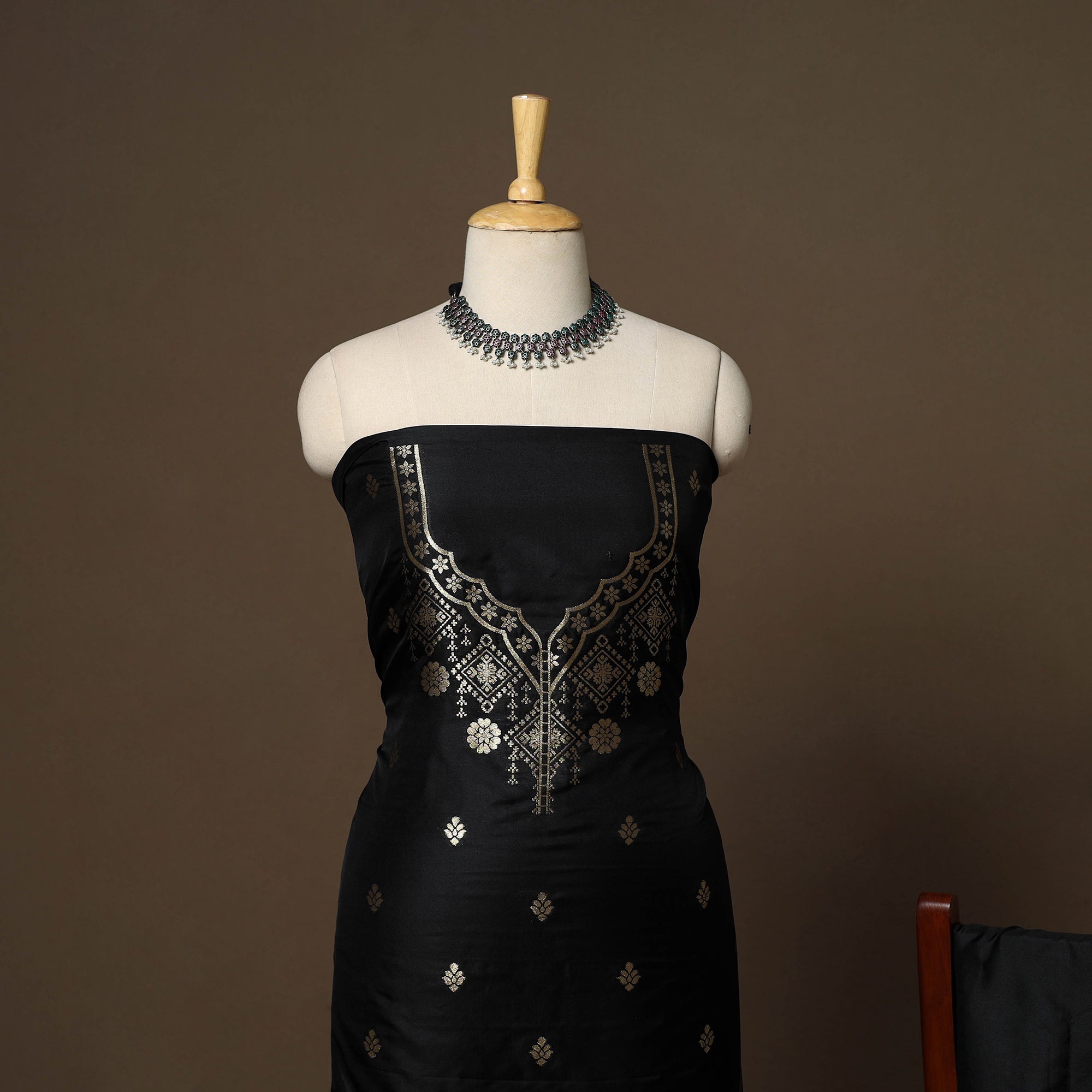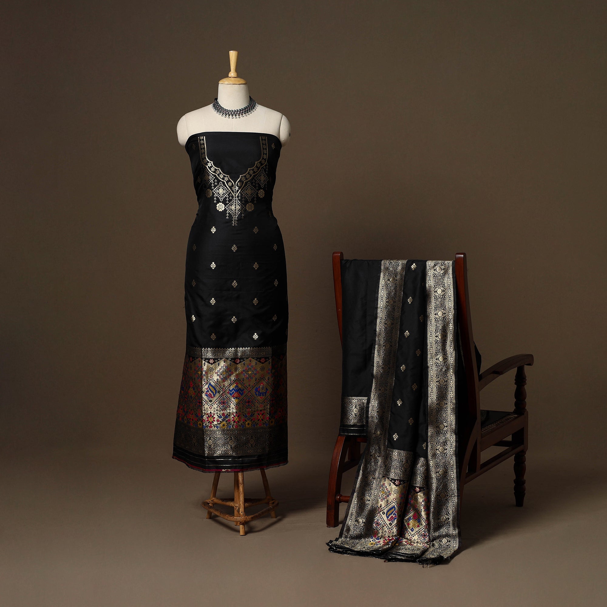This black 3pc bangalore silk paithani dress material features rich zari work with beautiful peacock, lotus, and traditional motifs. The set includes a kurta, dupatta, and bottom. Its vibrant colors and detailed patterns add an elegant touch, while the smooth silk fabric gives it a royal look. Perfect for weddings, festive events, and special occasions.