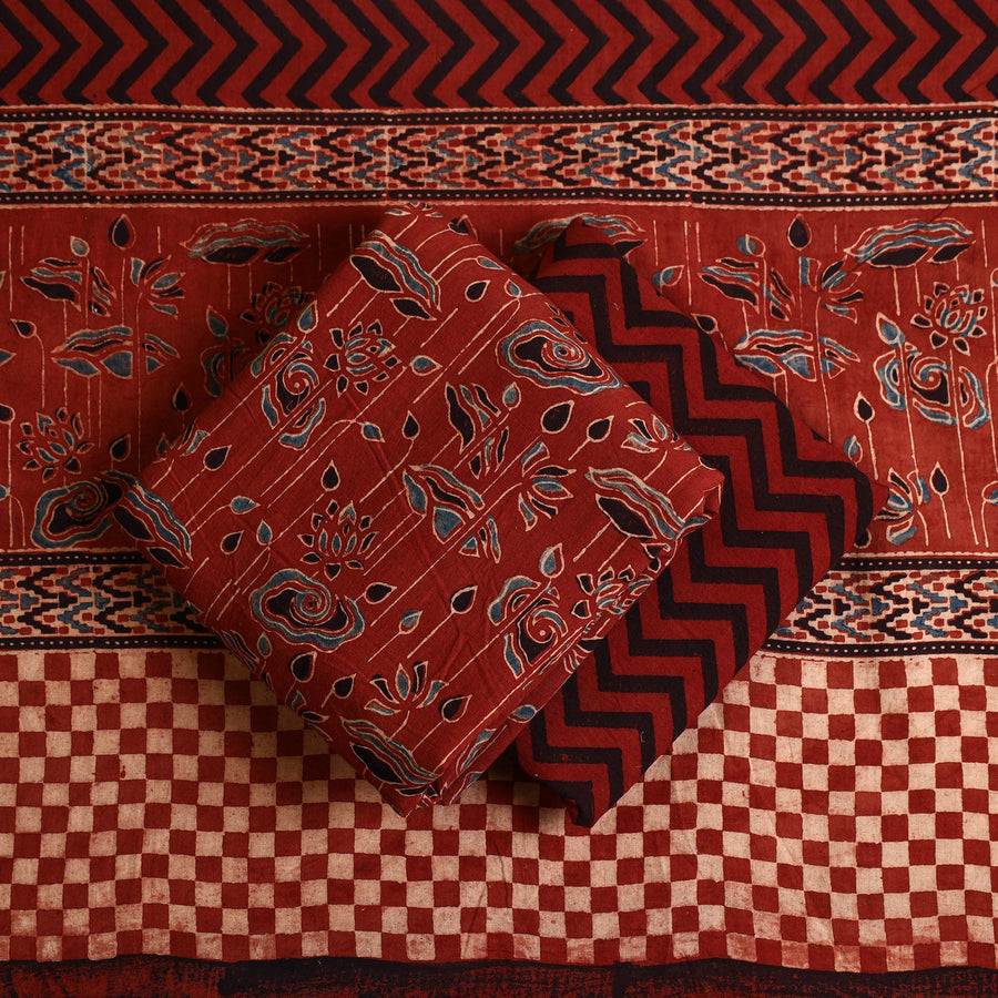 Step into the world of timeless craftsmanship with this red ajrakh cotton suit set, handcrafted in the heart of Kutch, Gujarat. Every thread tells a story from the slow, deliberate block prints to the earthy natural dyes. This 3pc ensemble, with soft breathable cotton for the kurta, bottom, and dupatta, blends tradition and comfort in a way that feels both regal and relaxed.