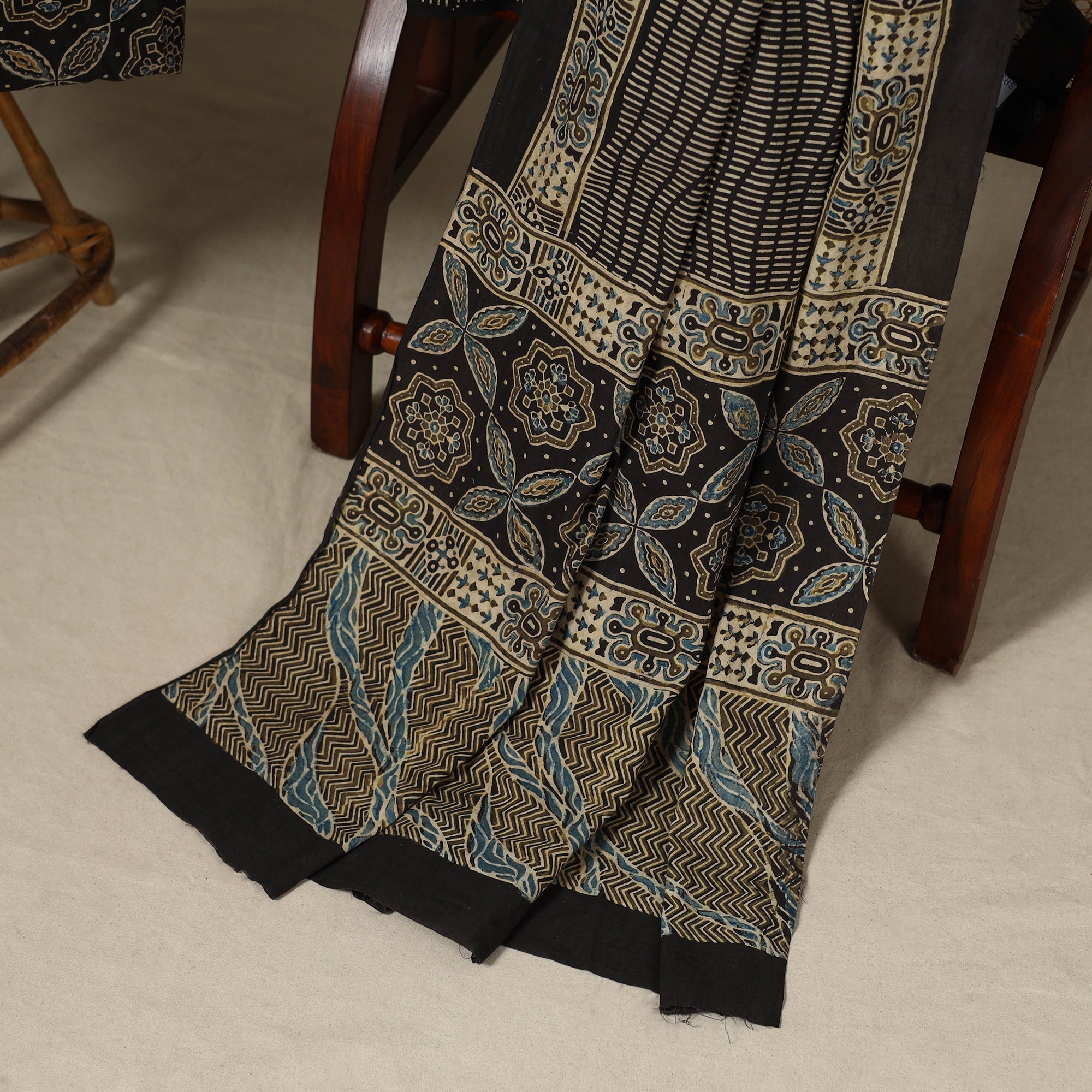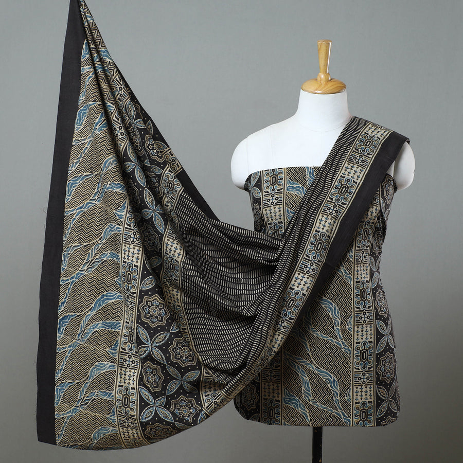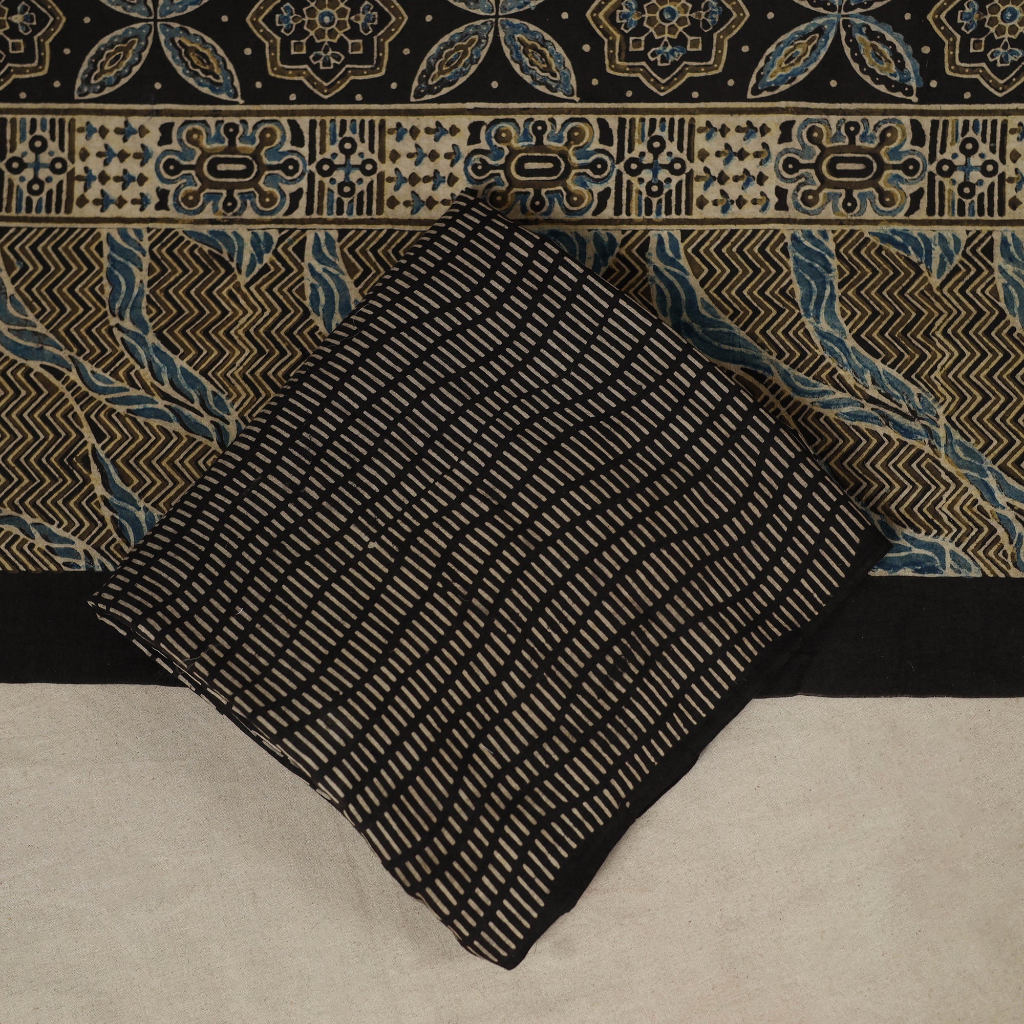 Enhance your wardrobe with this 3pc black Ajrakh block print cotton dress material, meticulously handcrafted by skilled artisans from Kutch, Gujarat. The Ajrakh technique, known for its use of natural dyes and intricate patterns, showcases India’s rich textile heritage. Ideal for both festive occasions and everyday elegance. A Note on Handmade Beauty