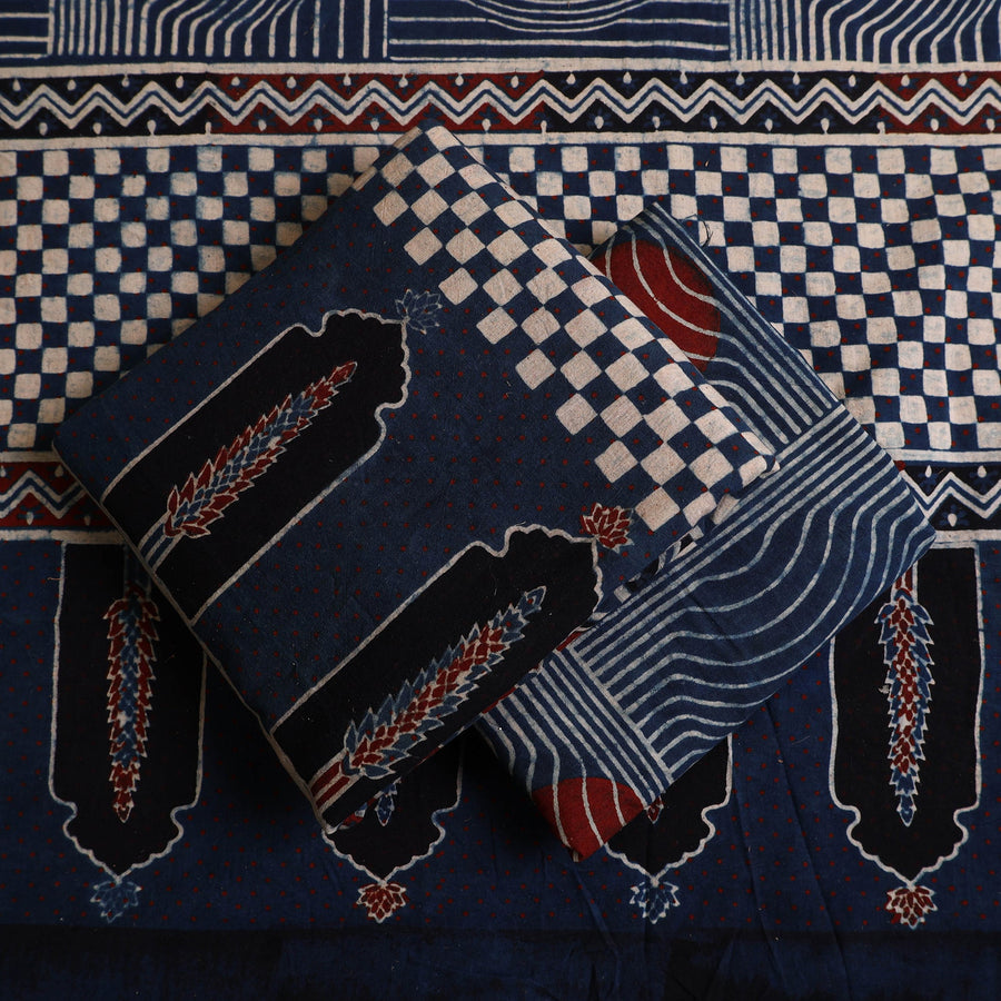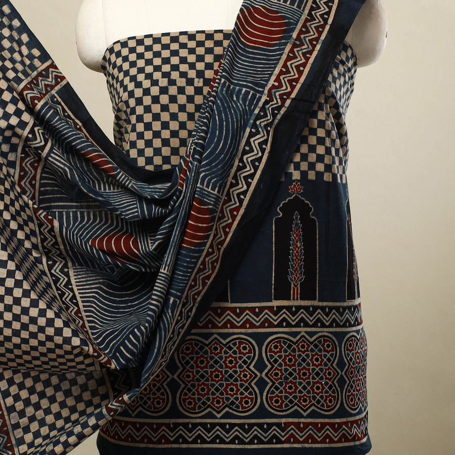 Step into the world of timeless craftsmanship with this blue ajrakh cotton suit set, handcrafted in the heart of Kutch, Gujarat. Every thread tells a story from the slow, deliberate block prints to the earthy natural dyes. This 3pc ensemble, with soft breathable cotton for the kurta, bottom, and dupatta, blends tradition and comfort in a way that feels both regal and relaxed.