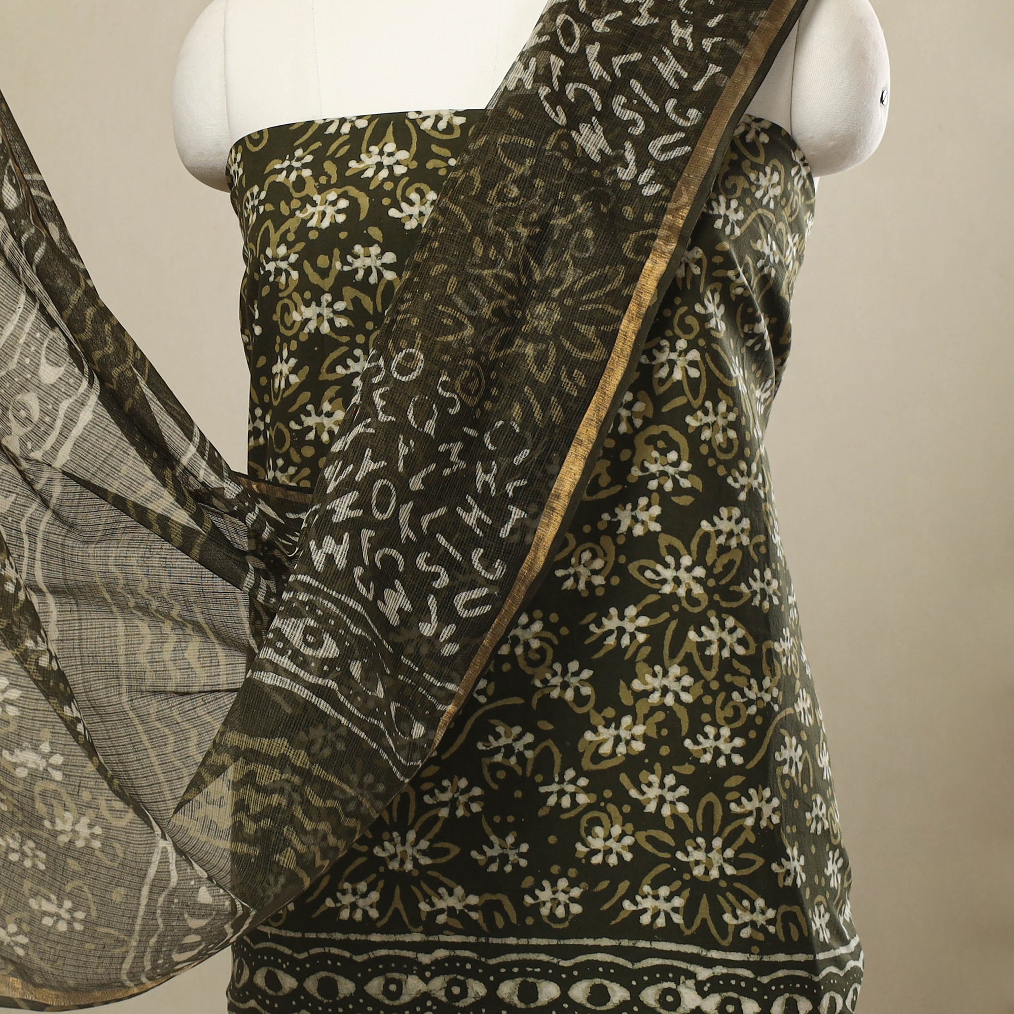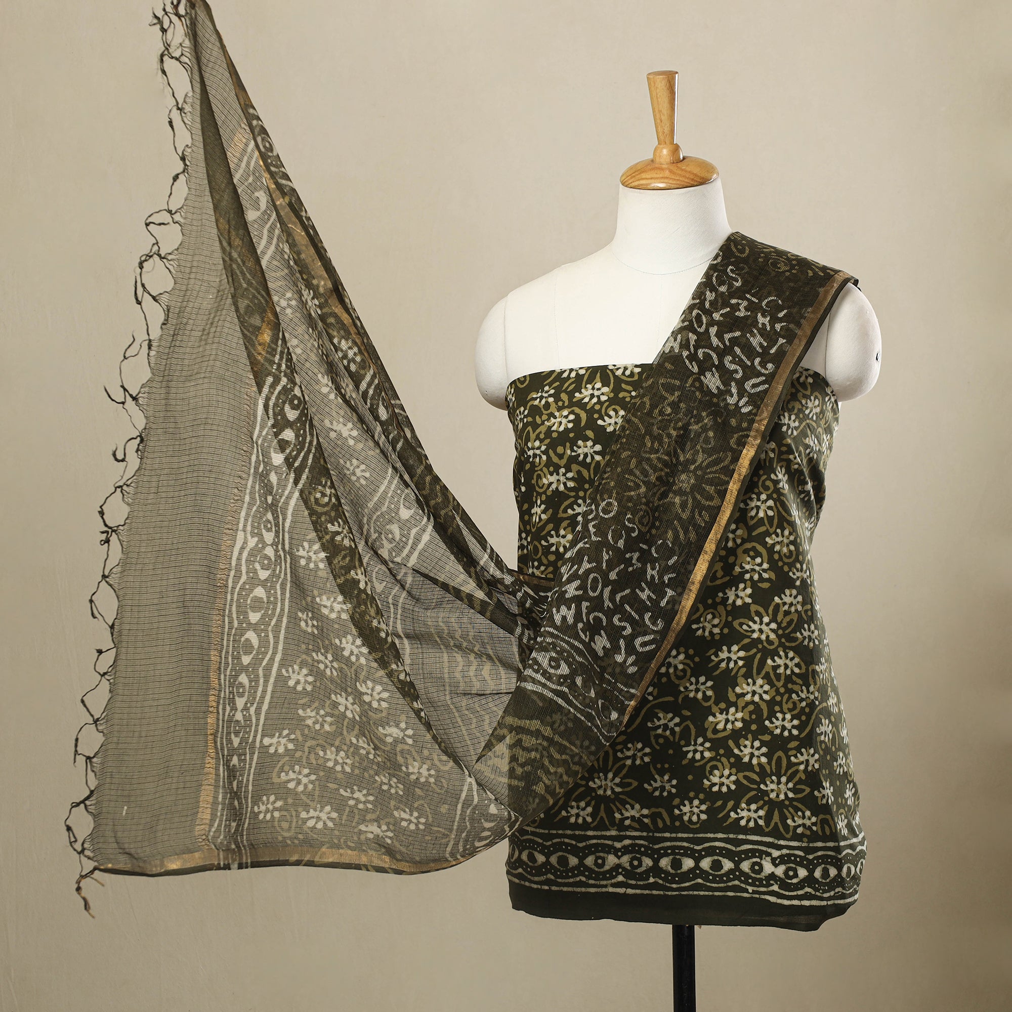 Wrap yourself in heritage with this stunning 3pc block print cotton green batik dress material. Crafted using the age-old wax resist dyeing technique, it features intricate patterns steeped in cultural heritage. The set includes breathable cotton fabric and a graceful kota doria dupatta. Ideal for festive wear or everyday elegance, this ensemble beautifully combines comfort, tradition, and artistic charm in every thread.