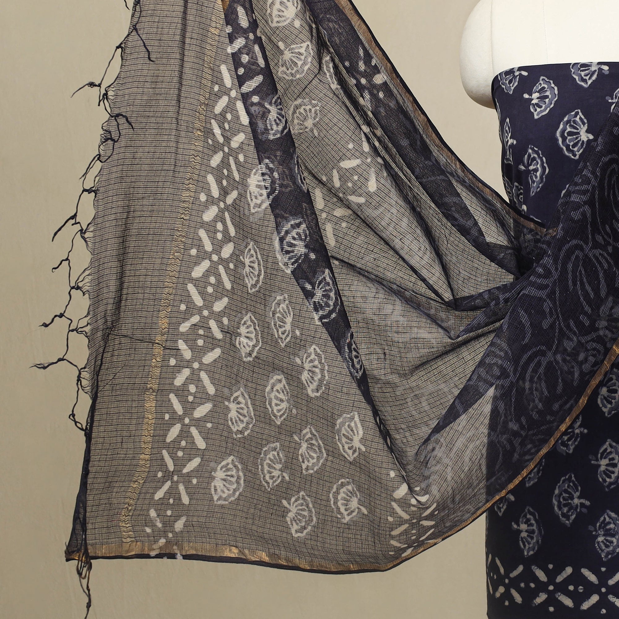 Wrap yourself in heritage with this stunning 3pc block print cotton blue batik dress material. Crafted using the age-old wax resist dyeing technique, it features intricate patterns steeped in cultural heritage. The set includes breathable cotton fabric and a graceful kota doria dupatta. Ideal for festive wear or everyday elegance, this ensemble beautifully combines comfort, tradition, and artistic charm in every thread.